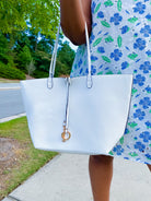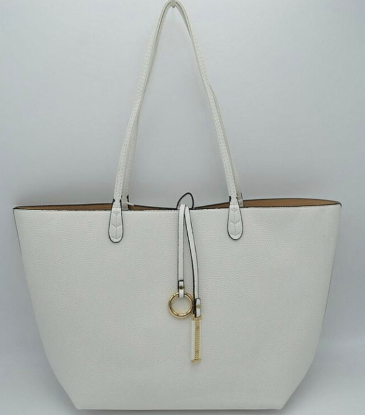 Gorgeous Vegan Leather Tote. 3 in 1 reversible tote in white with beige interior. Light gold hardware. Includes additional small pouch clutch with a bonus crossbody strap.