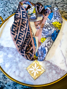 So pretty! Gorgeous designer inspired scarf reversible flower pattern. Elevated gold diamonds charm pendent.