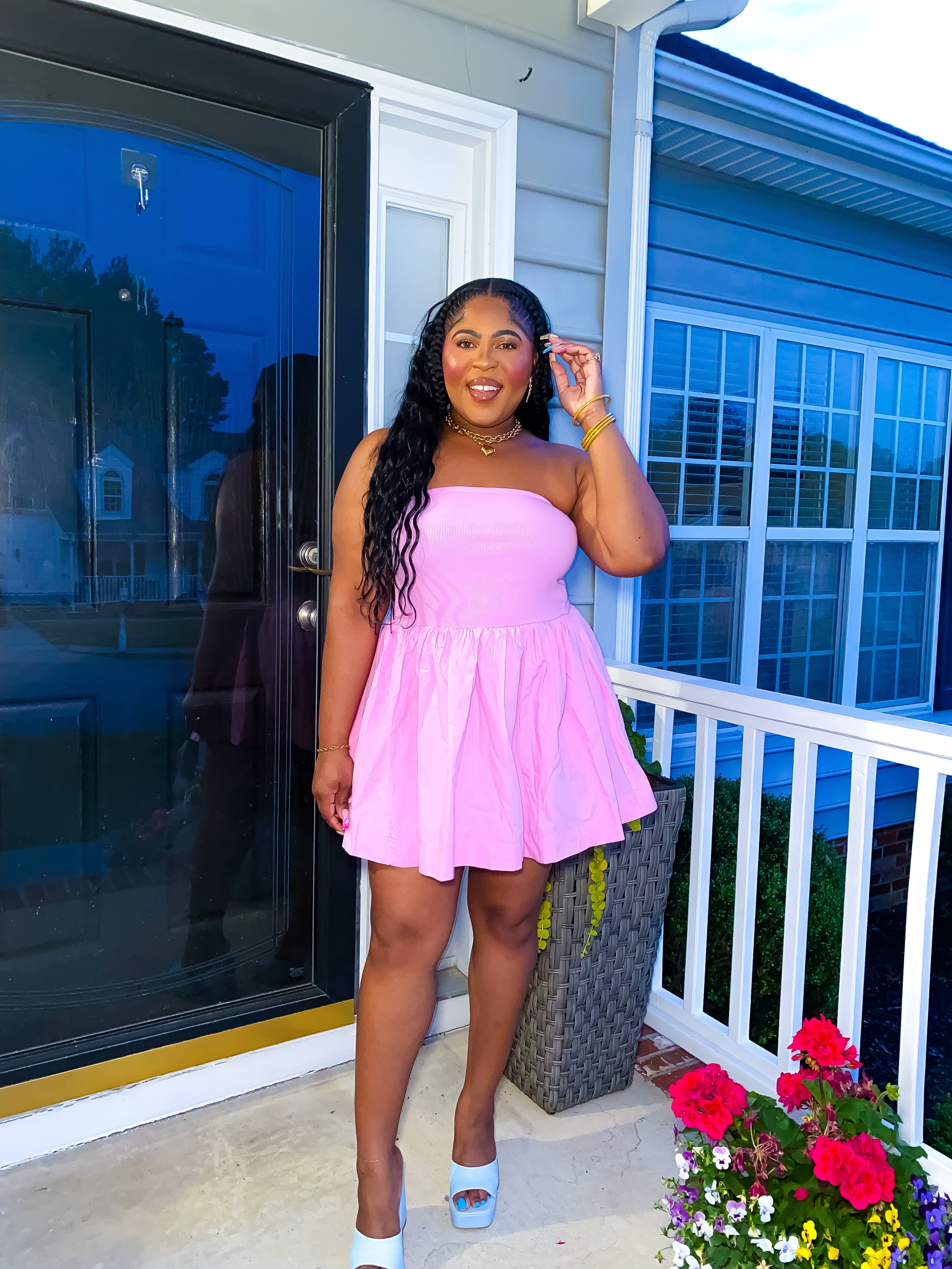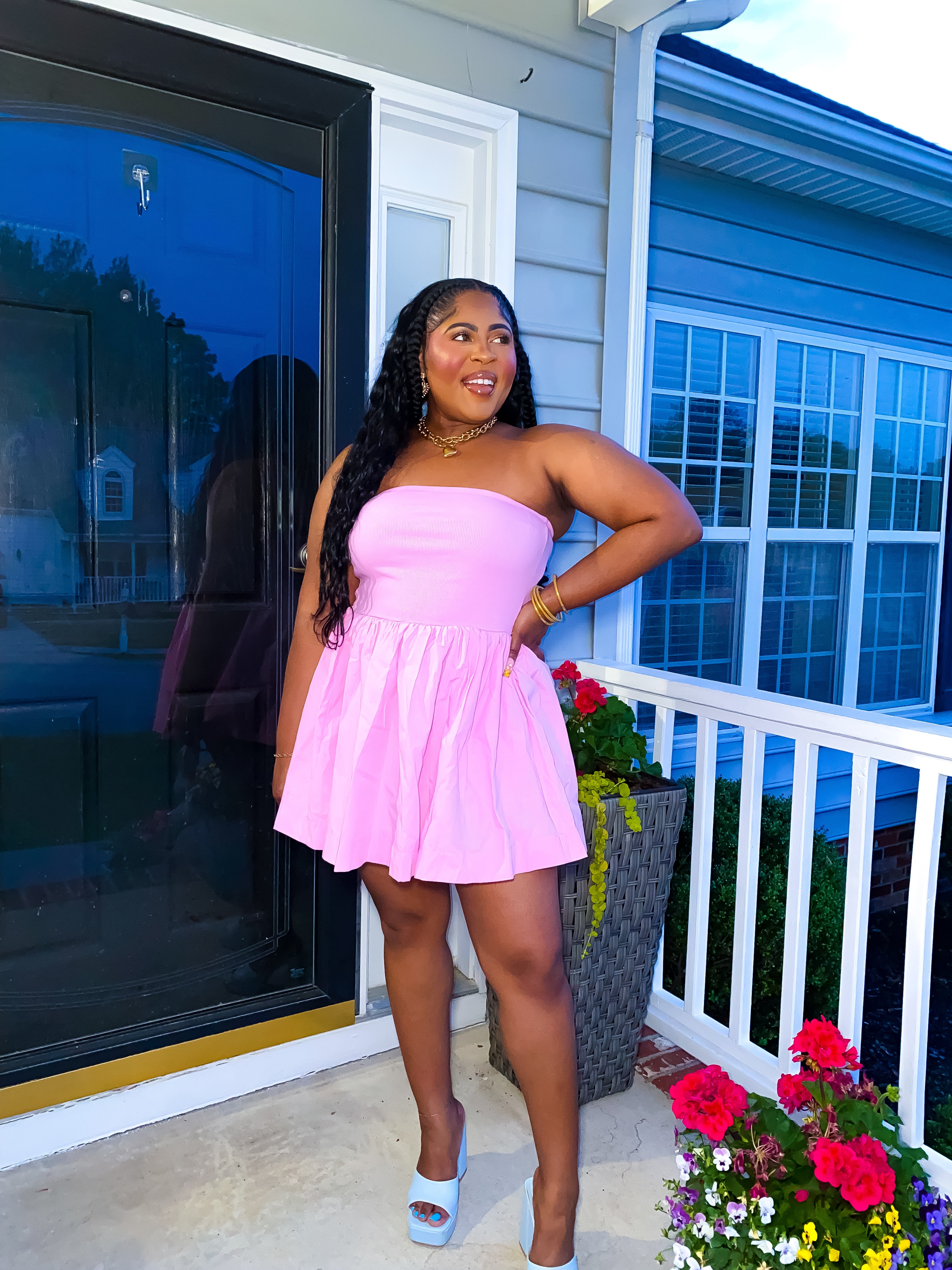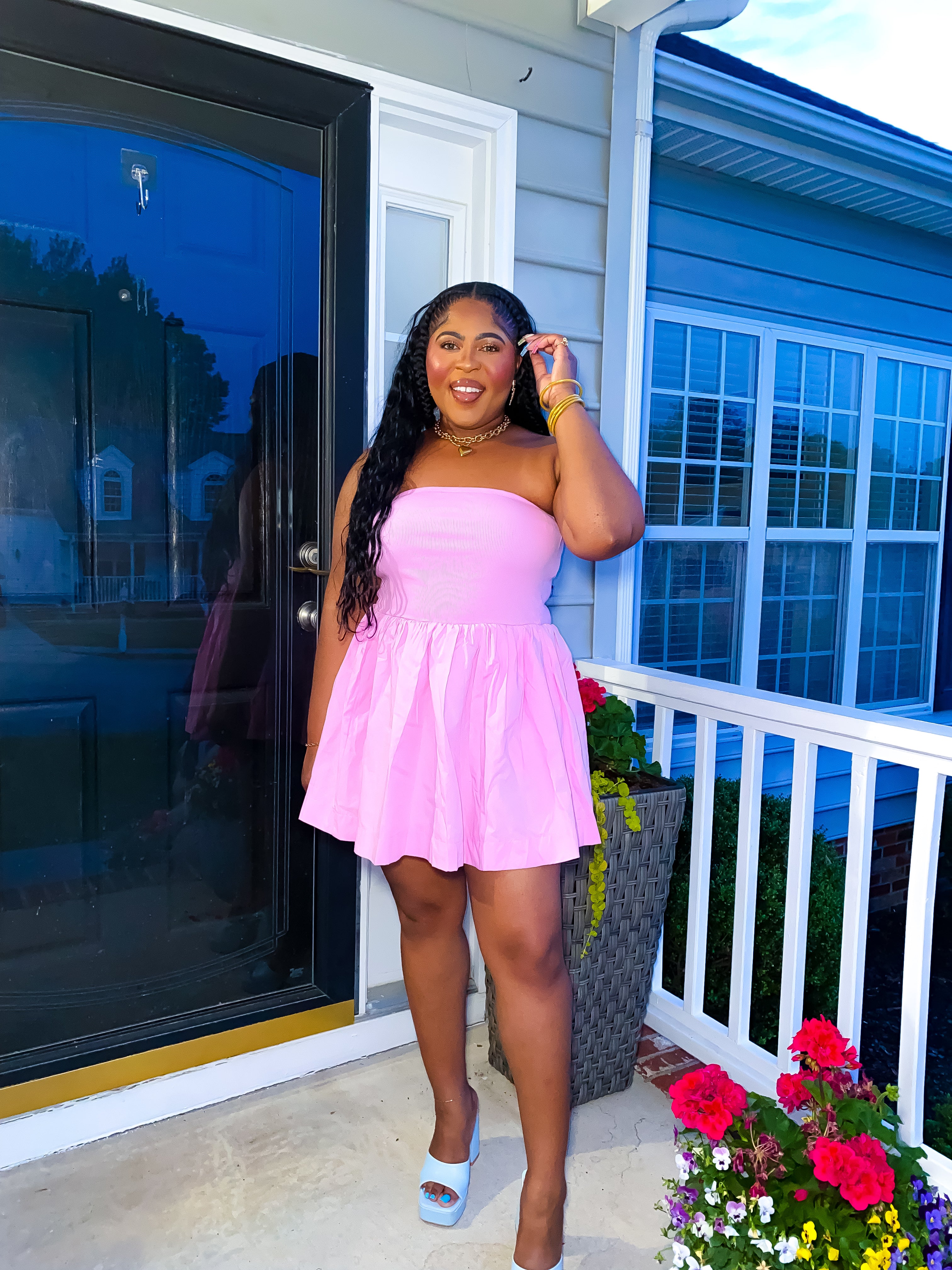 Our Adorable Strapless Mini Dress is so fun! Strapless neckline, knitted stretchy bodice with attached woven shirt. Mini length. In a perfect bubblegum pink colorway. Has pockets!