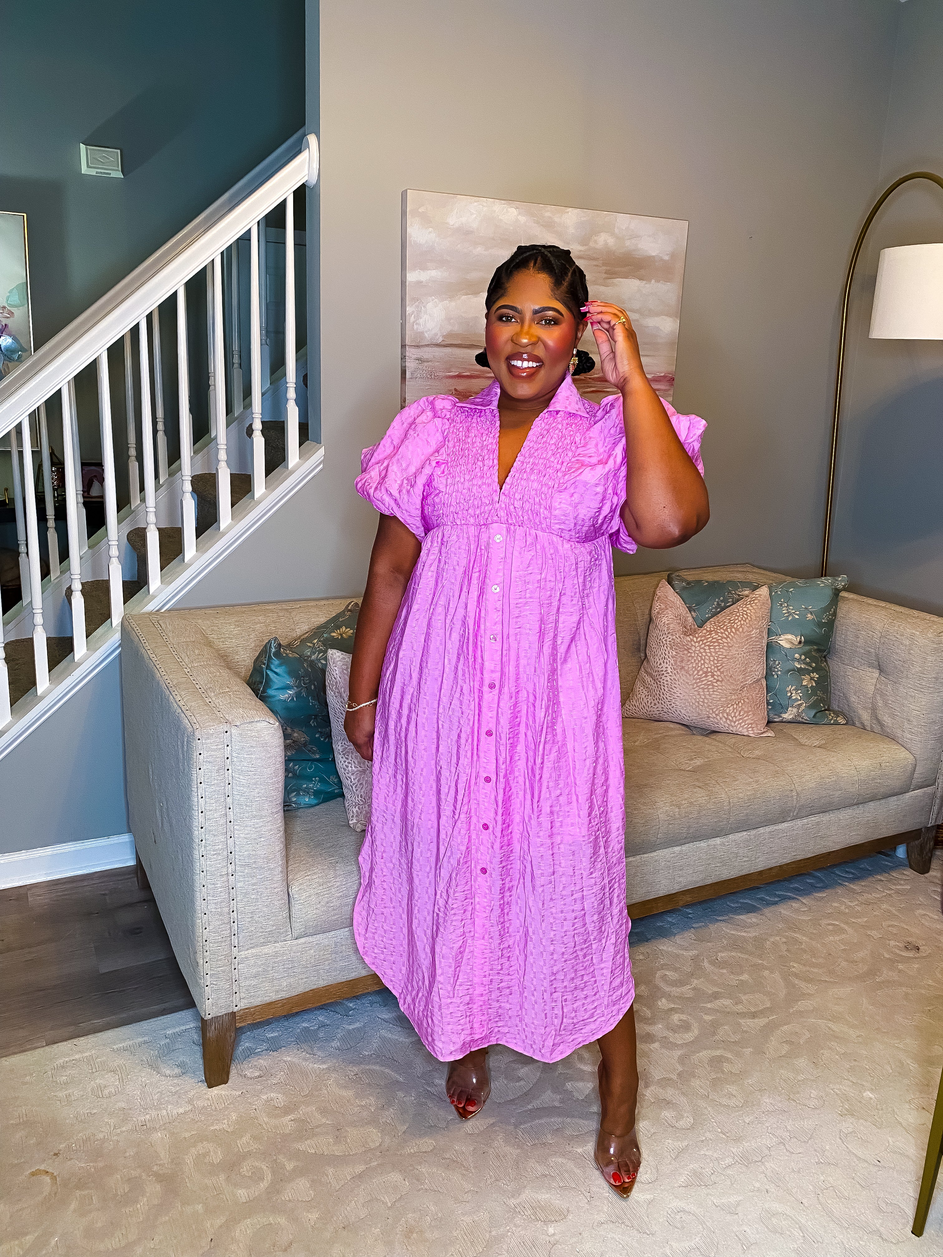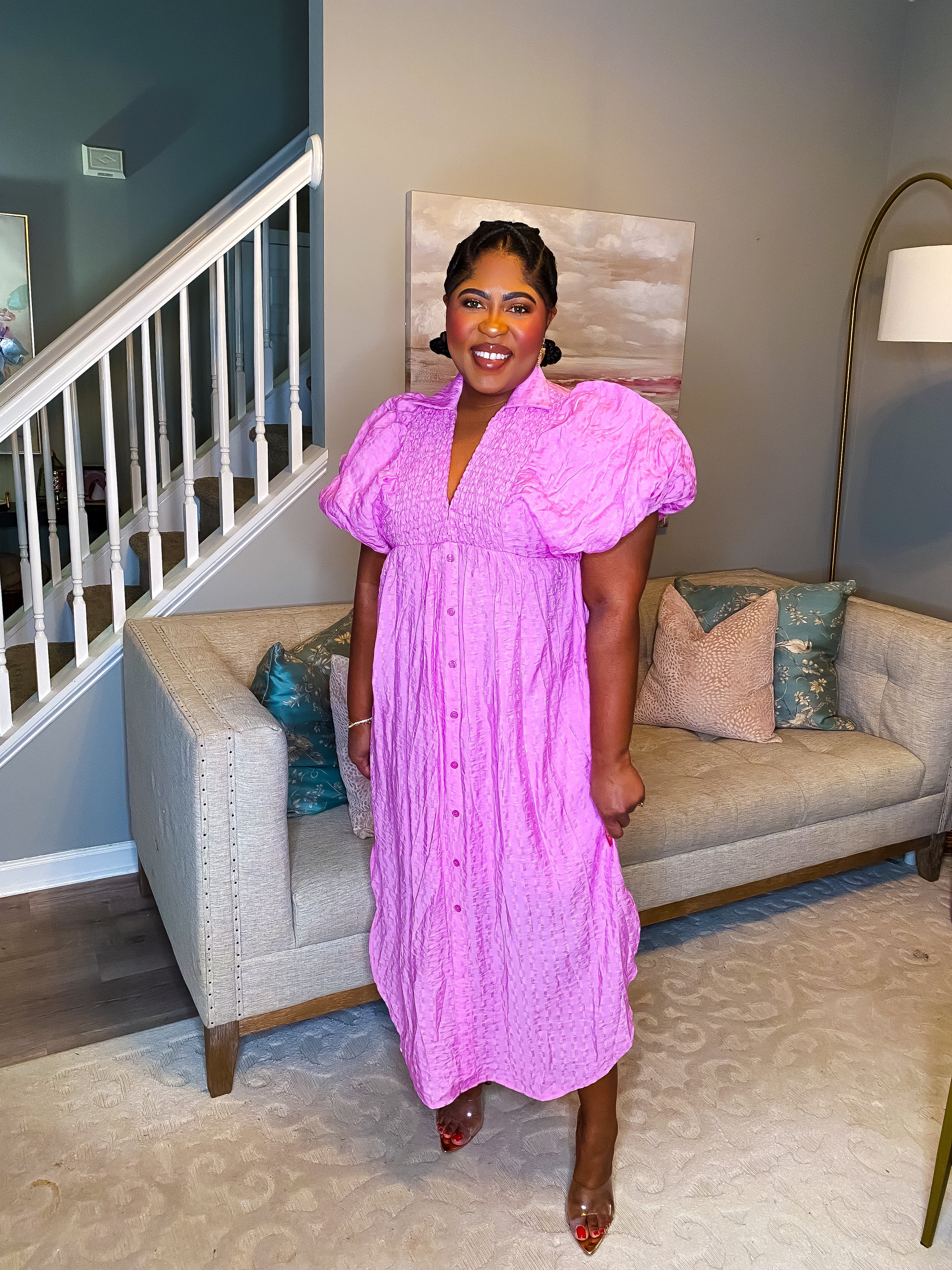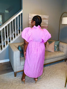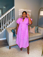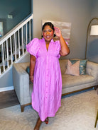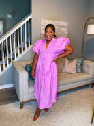 Our Effortless Midi Dress is pink. Textured fabric throughout. Smocked V neckline collared midi dress. Faux front button detail with flattering side slit. Short puff sleeve. Lined and lightweight. Perfect, effortless dress you will feel stunning in all Spring and Summer.