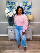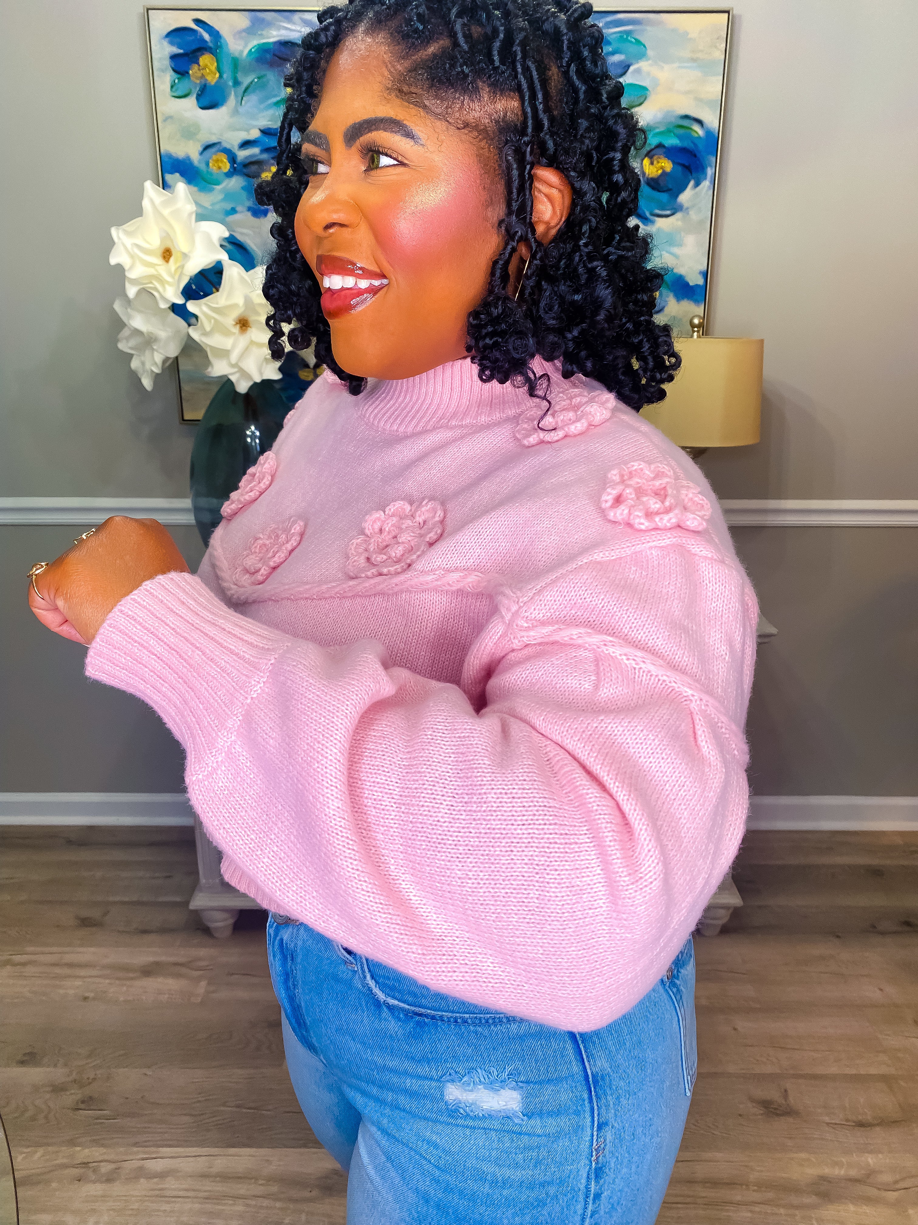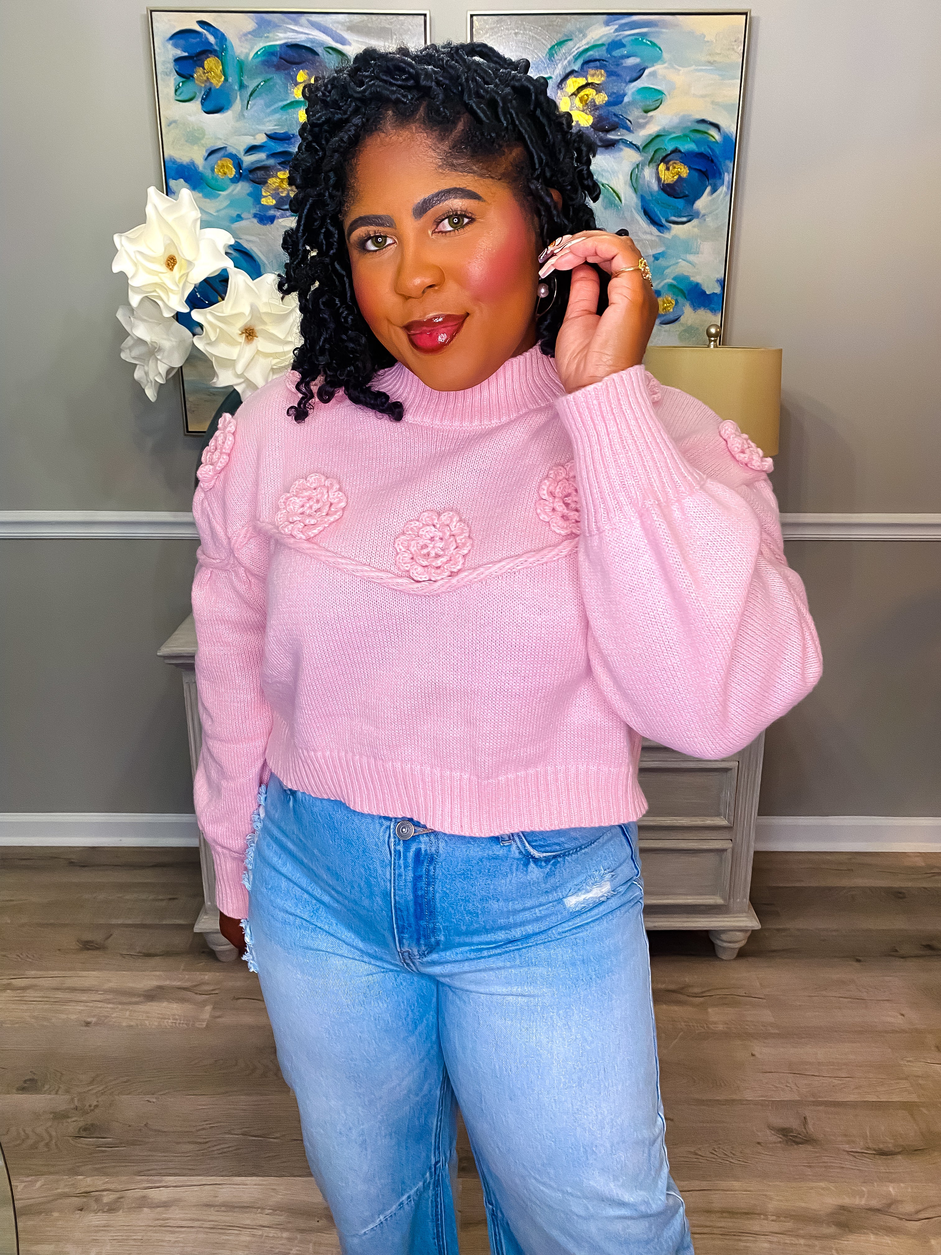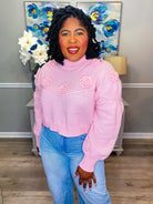 Detailed monochromatic, crochet knit flower sweater. Trendy, crop oversized fit. Mock neckline with balloon sleeves. Intricate rope detailing. Ribbed neck, cuff, and hemline.
