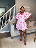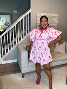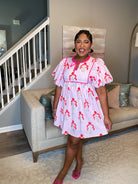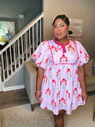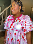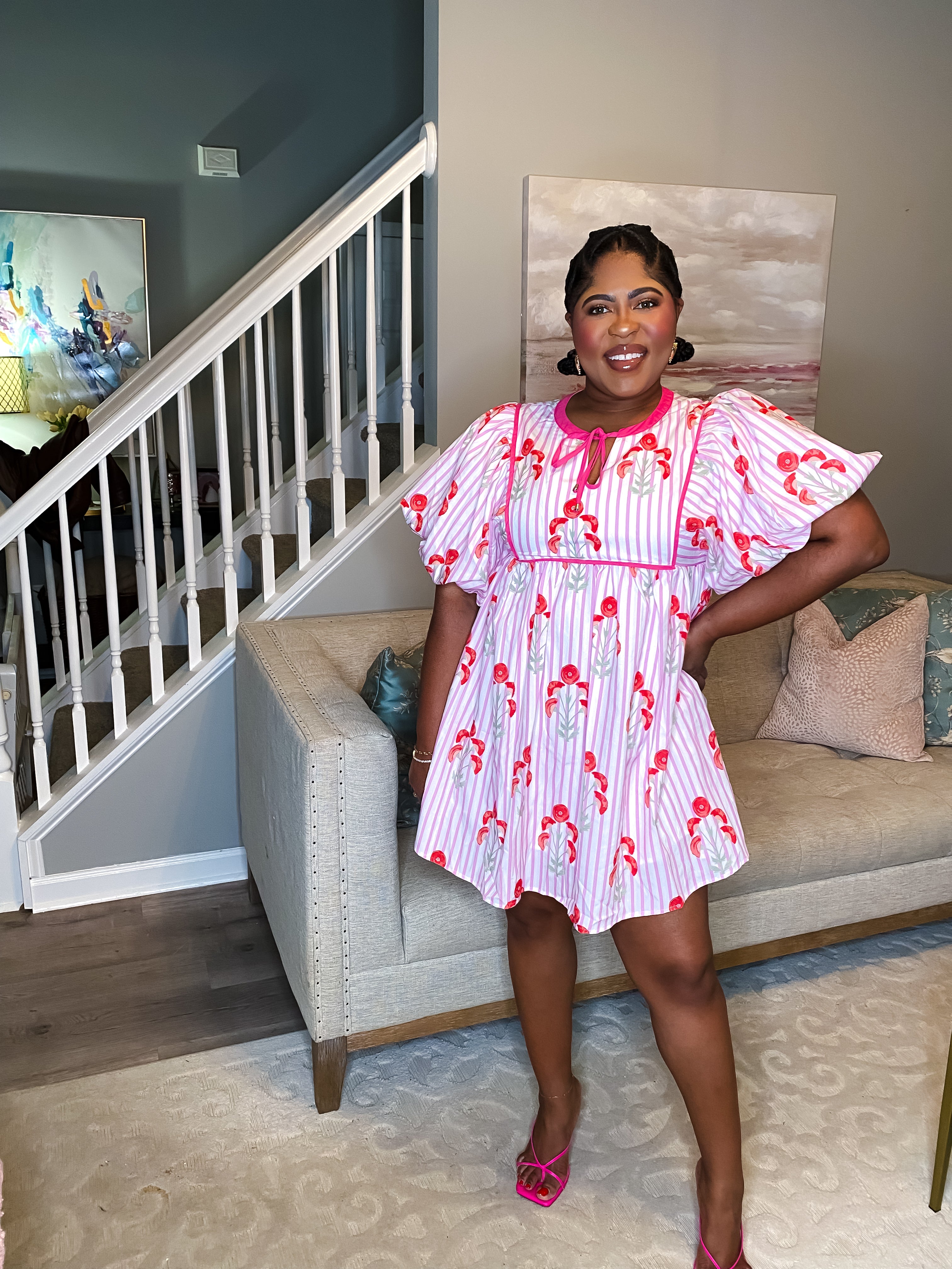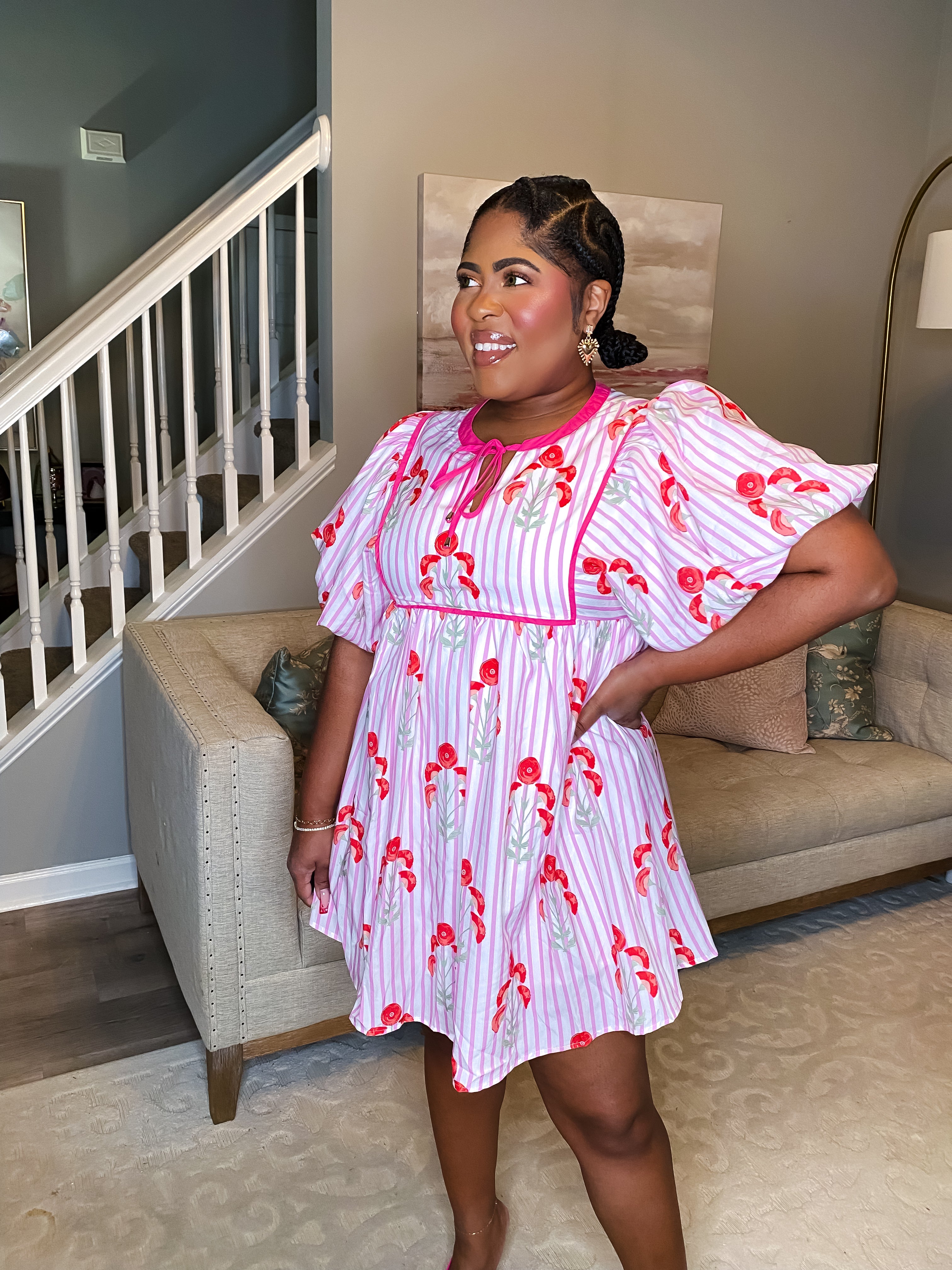 Our Poppy Floral Stripe Dress in playful pink colorway. Features a beautiful red floral pattern with pink stripes throughout on a white background. Round tie neckline with hot pink piping/trim throughout. Short puff sleeve. Fully lined and lightweight.