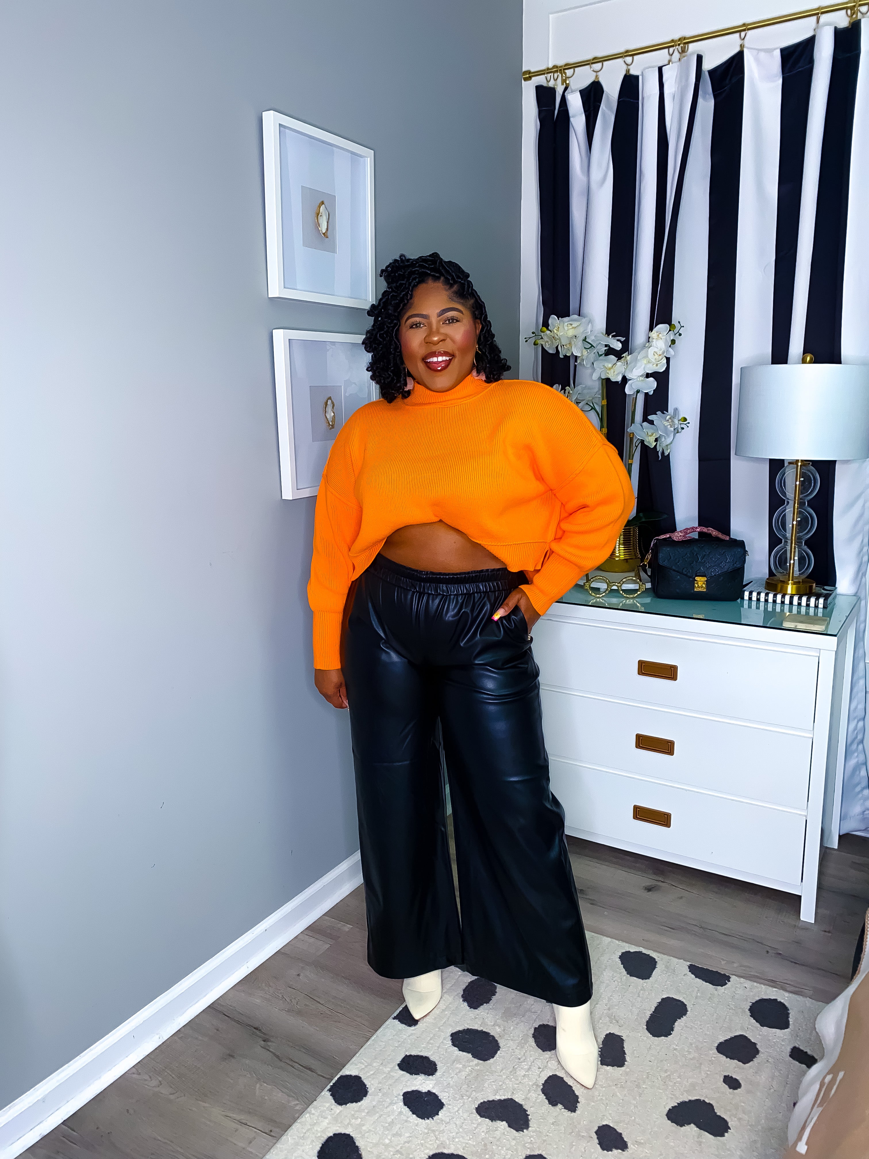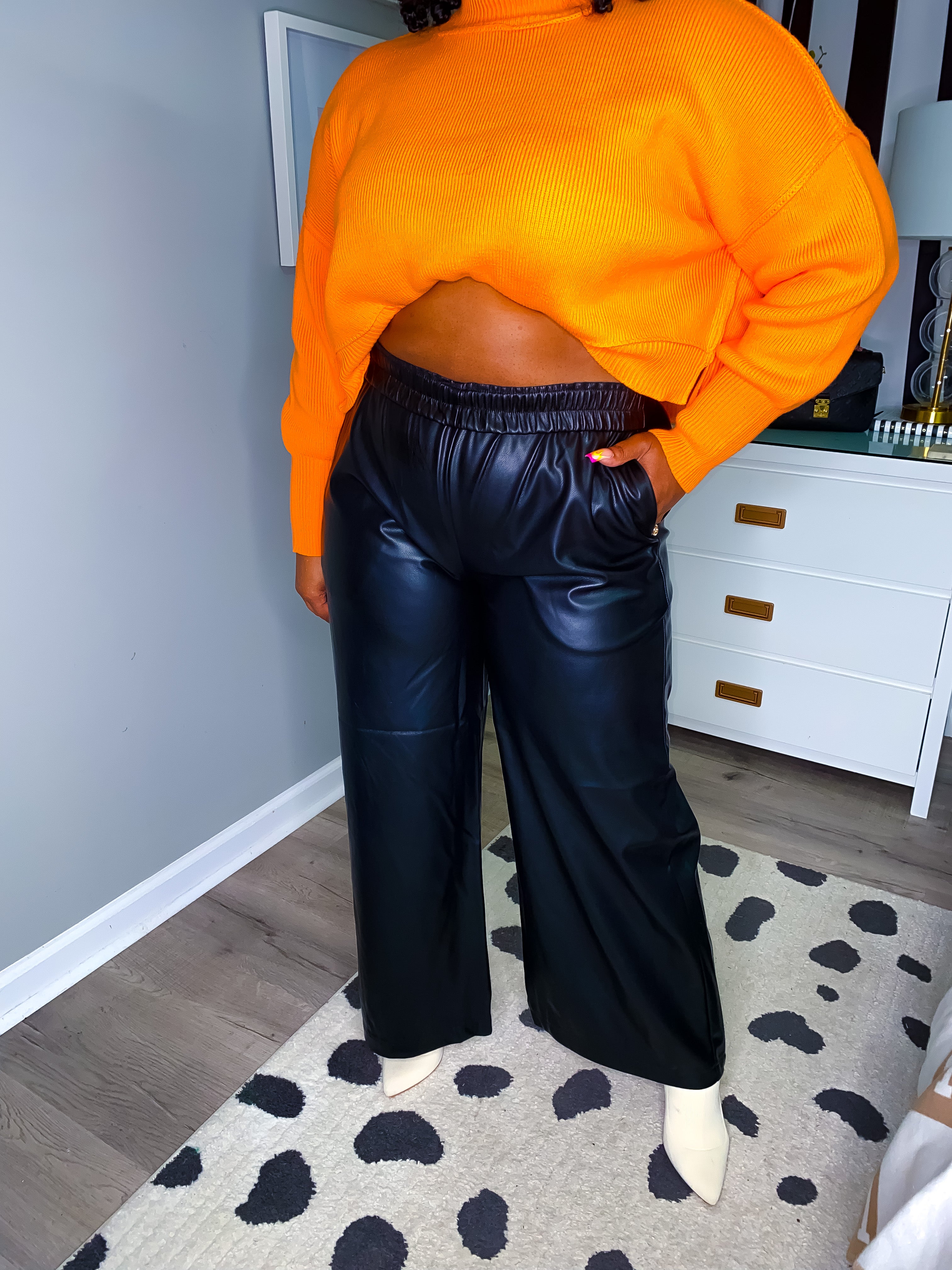 Comfort and Cuteness meet each other with our Forever Comfy and Cute Faux Leather Jaw dropping price for amazing quality. Wide Leg Pants. Stretchy, elastic waist. Butter soft material fully lined. With Pockets. Full length pants leg. Perfect timeless addition to your closet that you can wear year after year. True black.