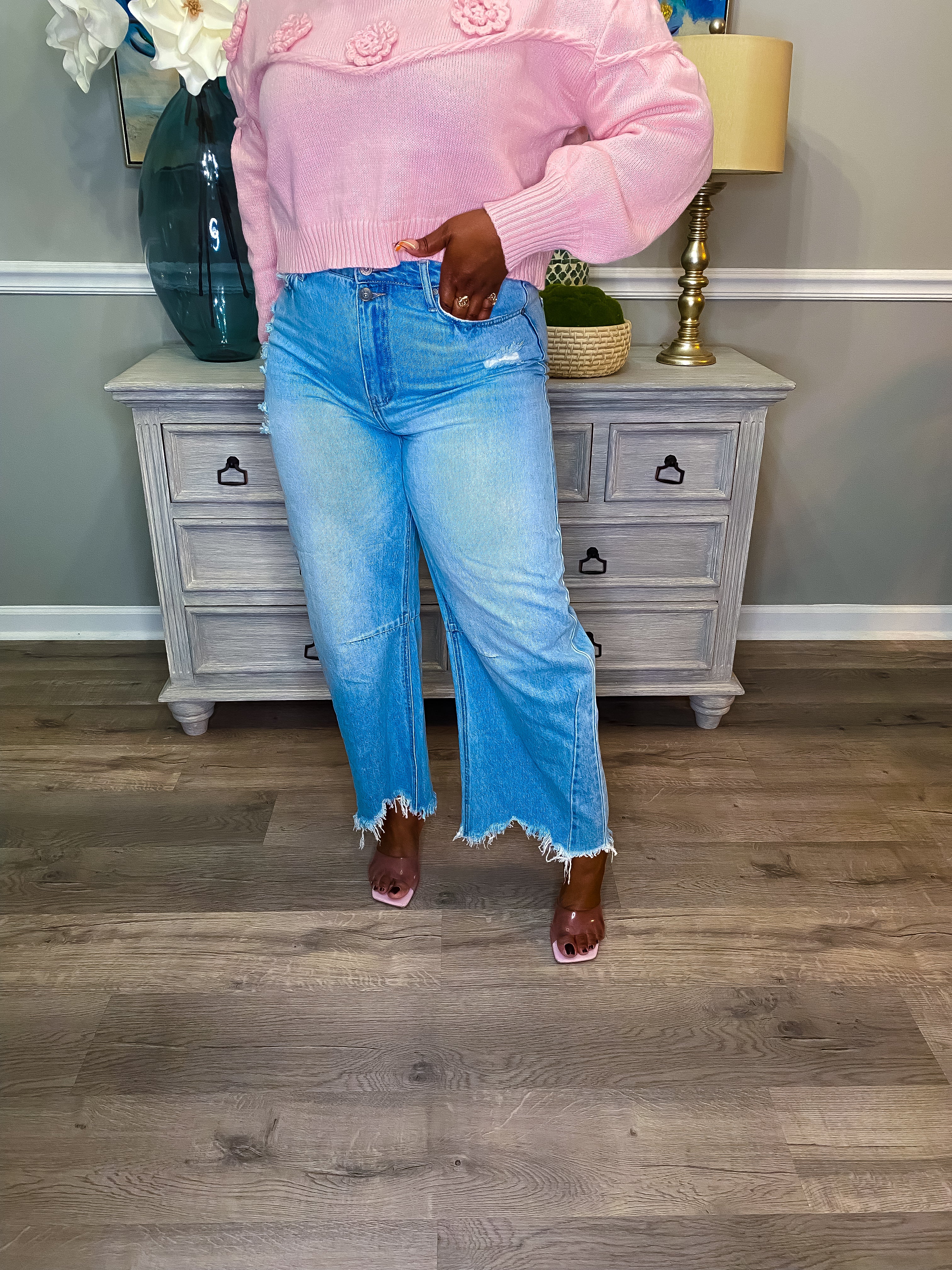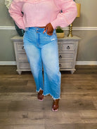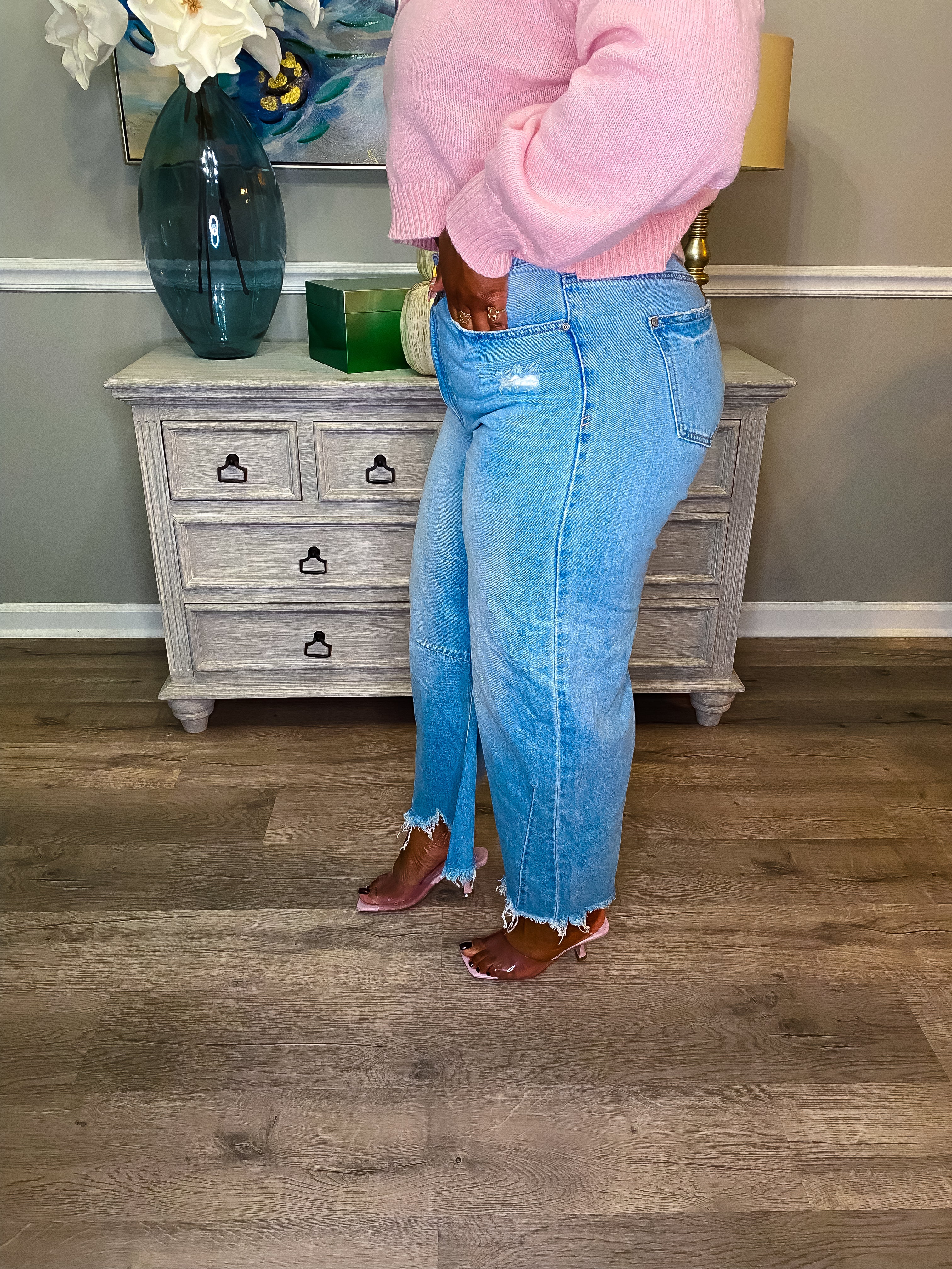 Premium high rise distressed slouchy Horseshoe jeans. Medium light wash, relaxed fit comfortable non stretch denim. High quality, high rise durable denim designed to last. Zipper and double button closure. Unique horseshoe silhouette with distressed hemline.