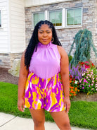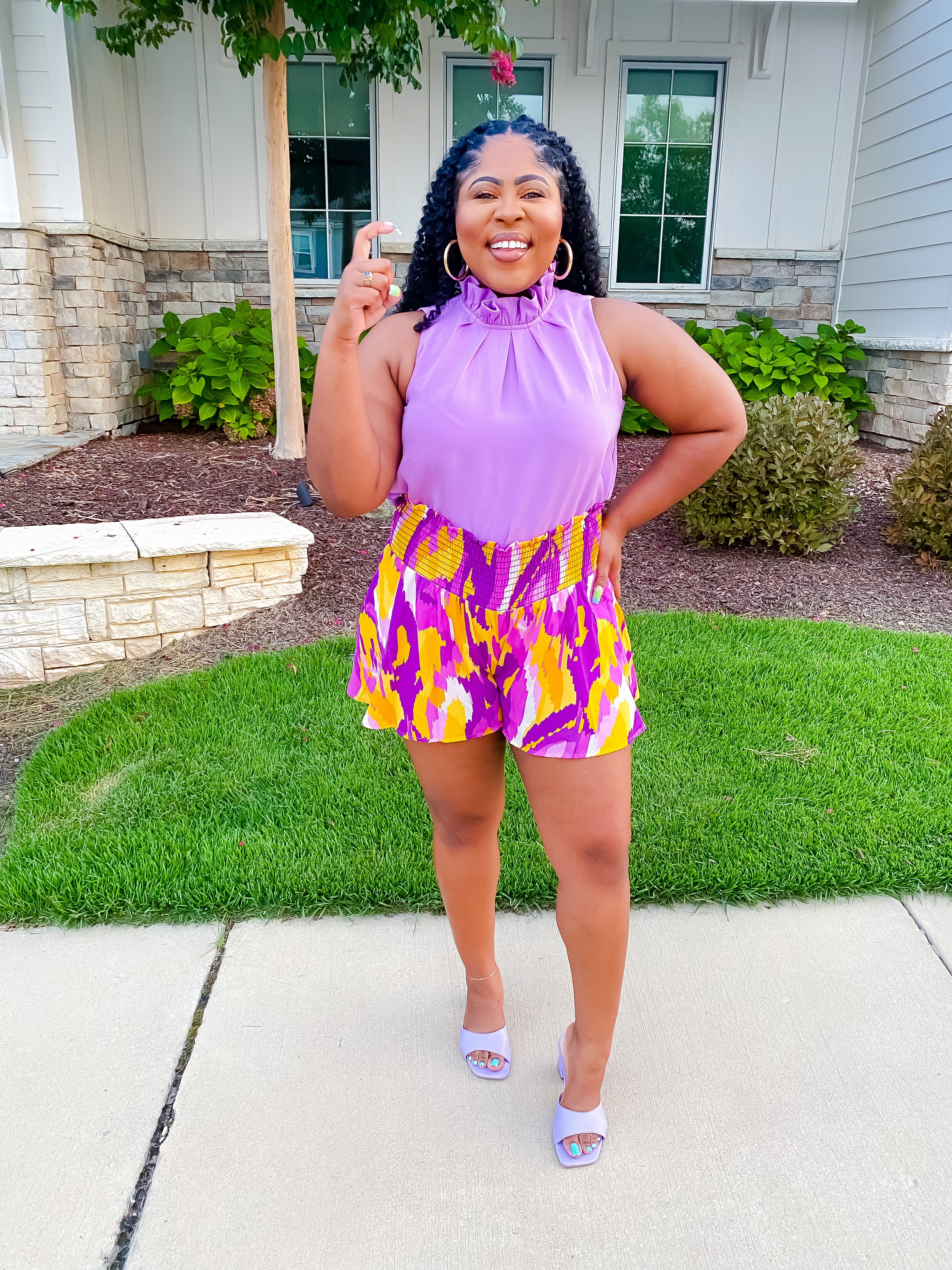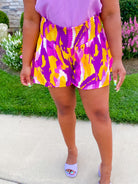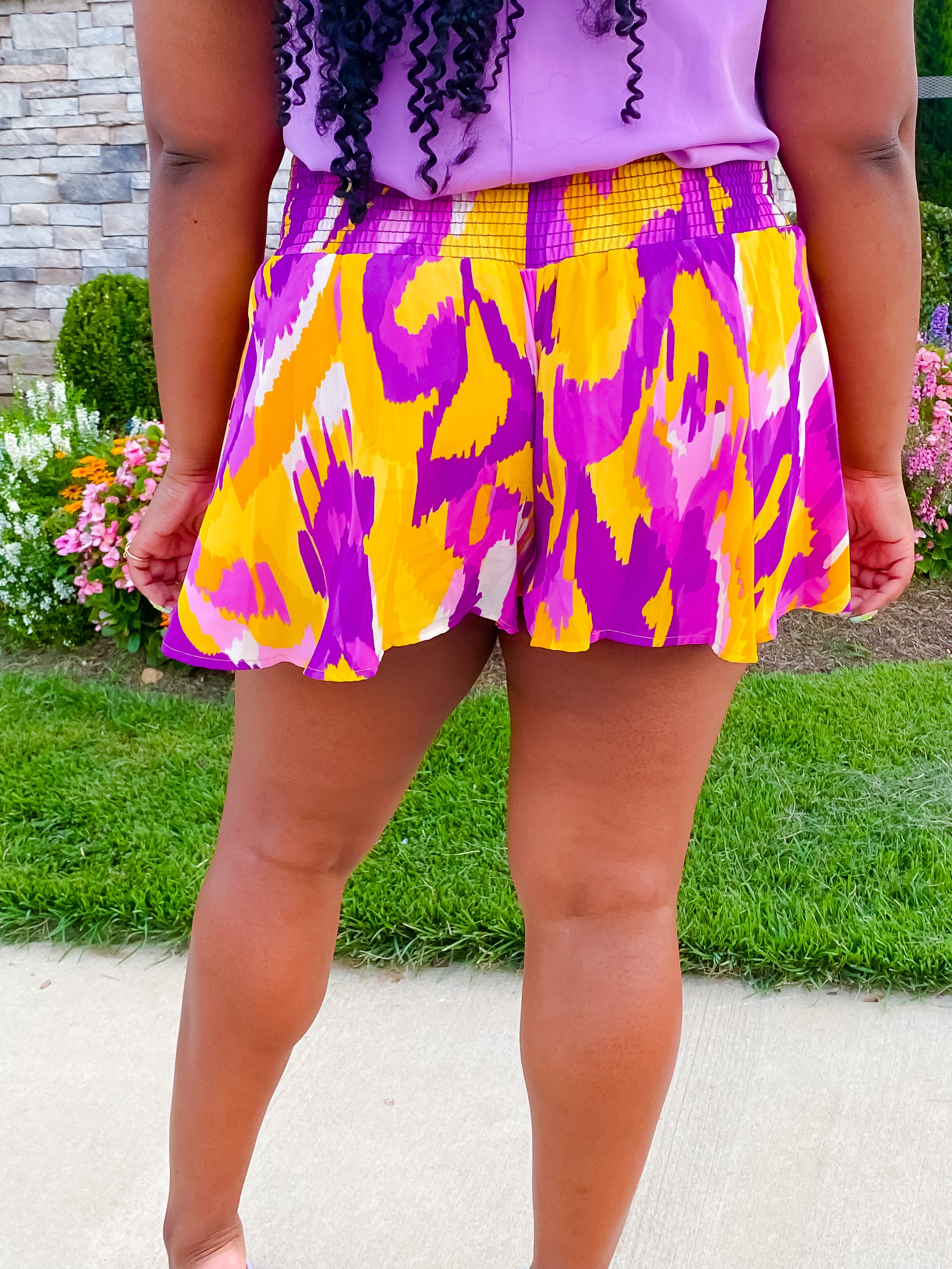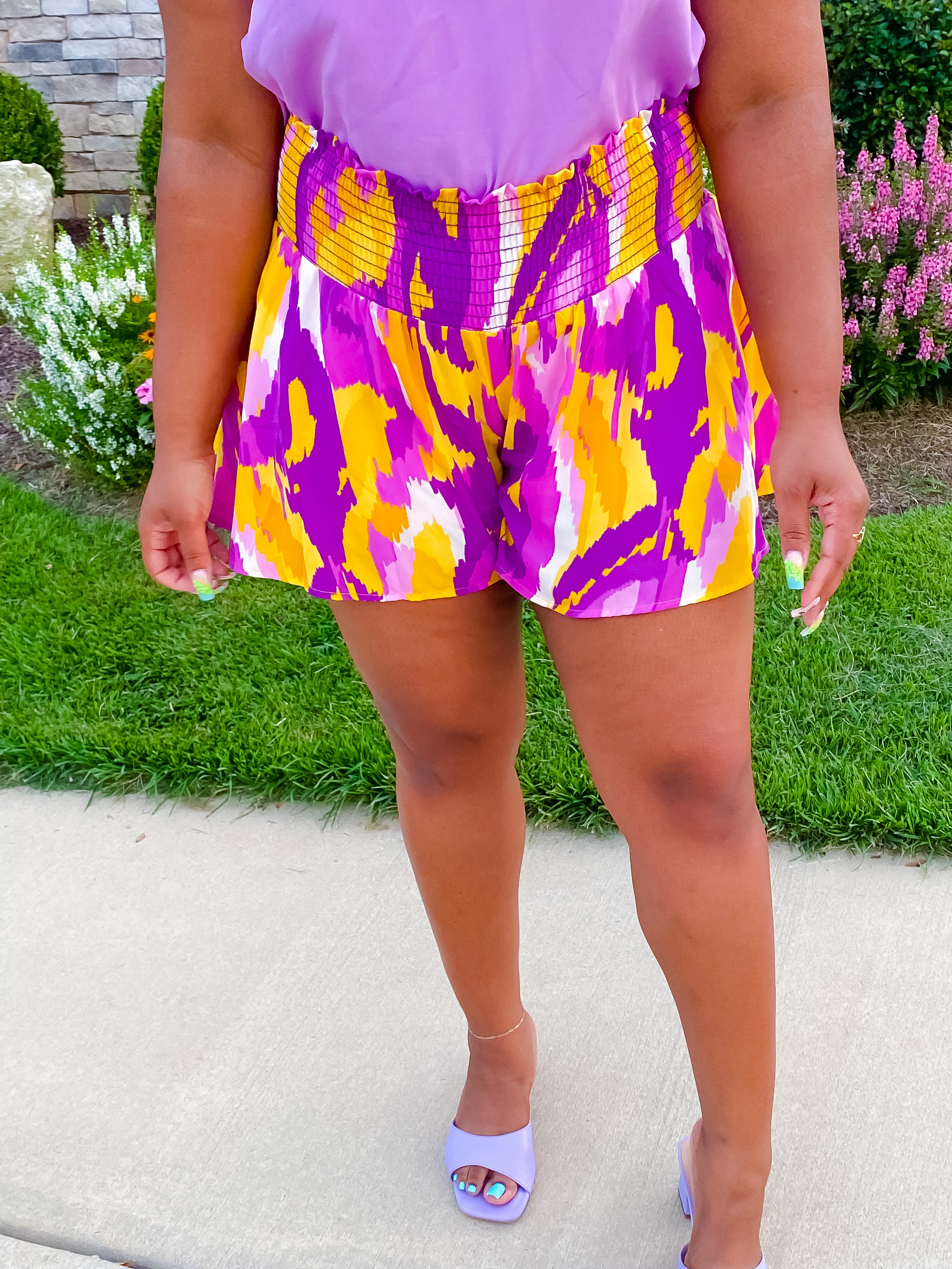 Get Gameday Ready in our Purple Spirit Swing Shorts. Pretty short that features a multi purple, yellow, and white colorway. Elastic, smocked waist with flowy bottom. Perfect shorts to dress up or dress down.