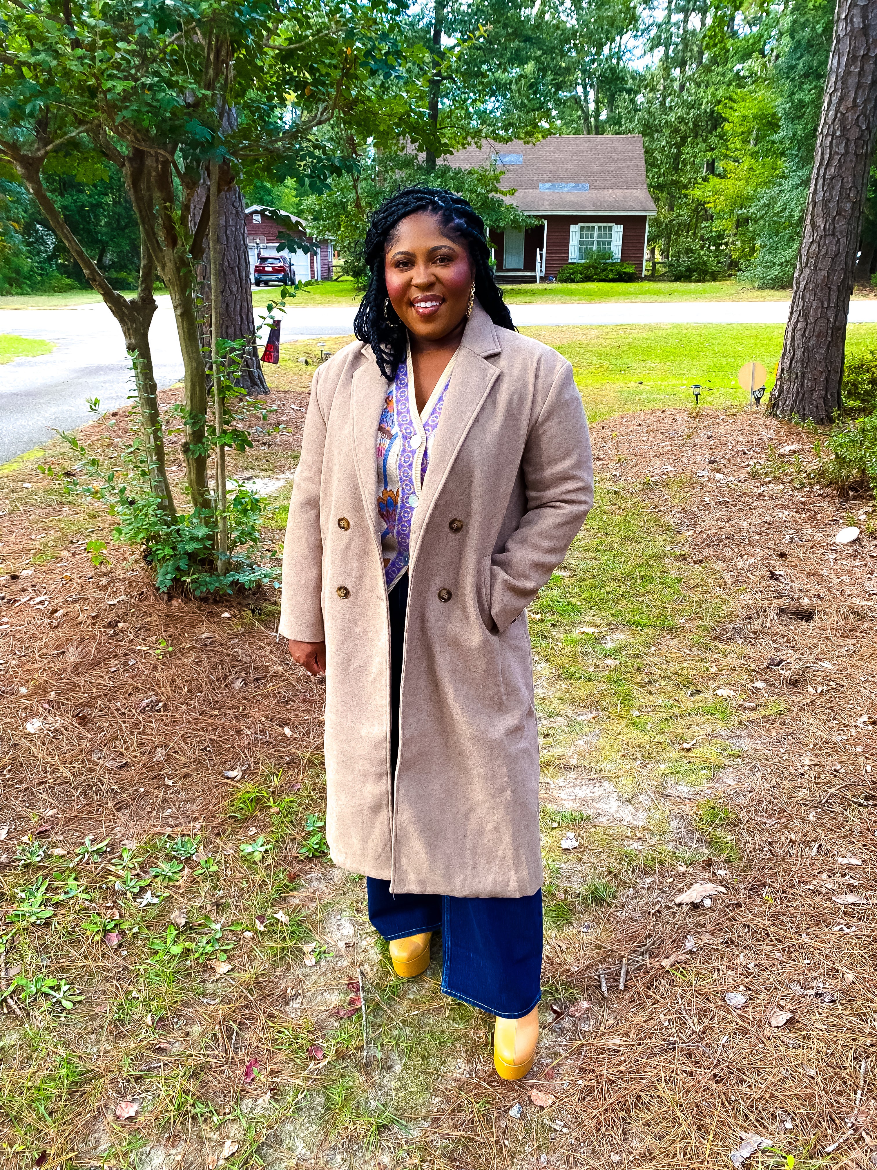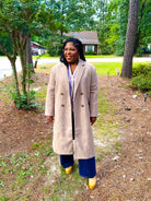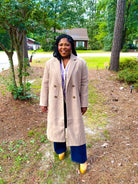 Taupe colored Felted Double Breasted Lapel Duster Coat with brown buttons, functional pockets, and fully lined. Long sleeve with collar.