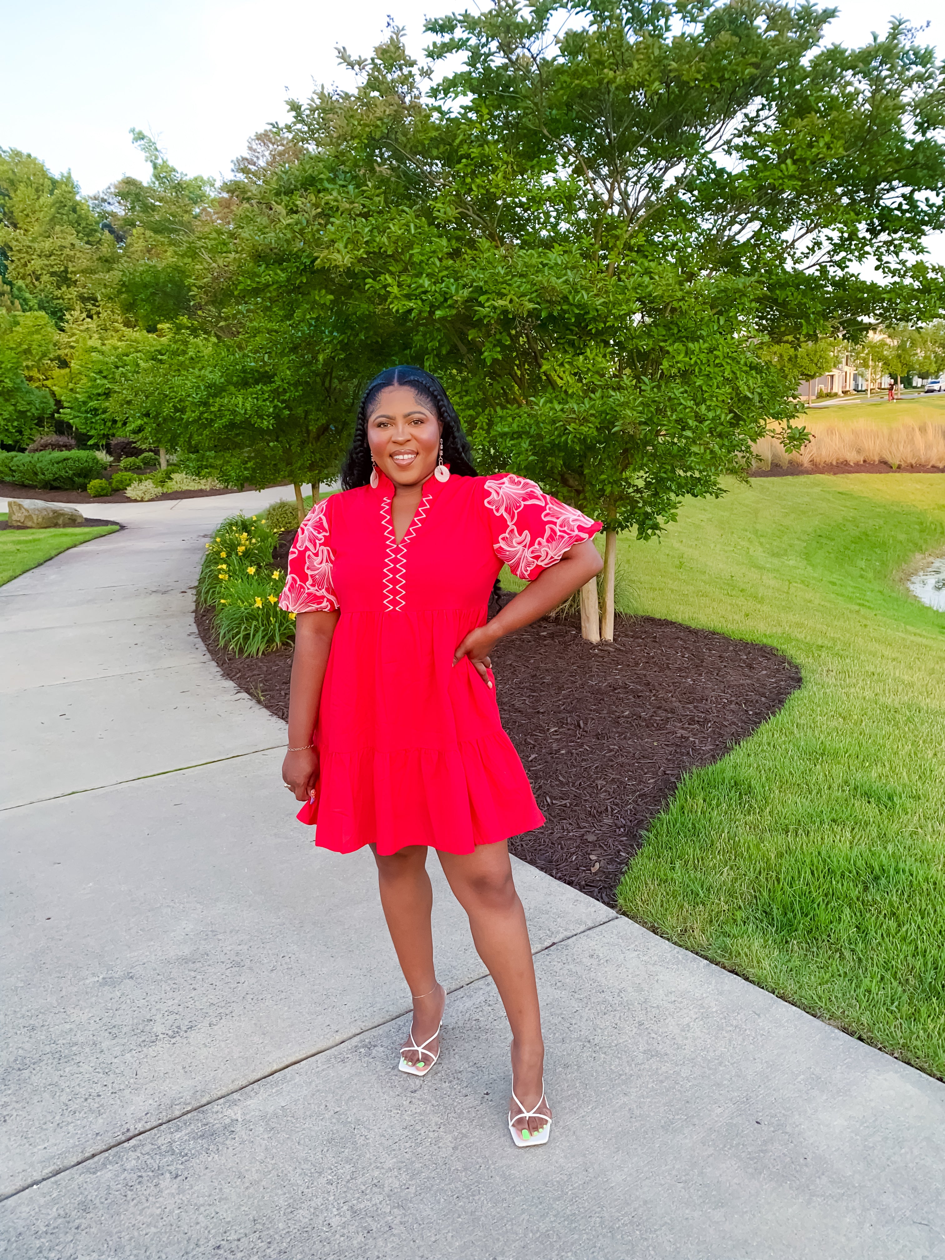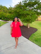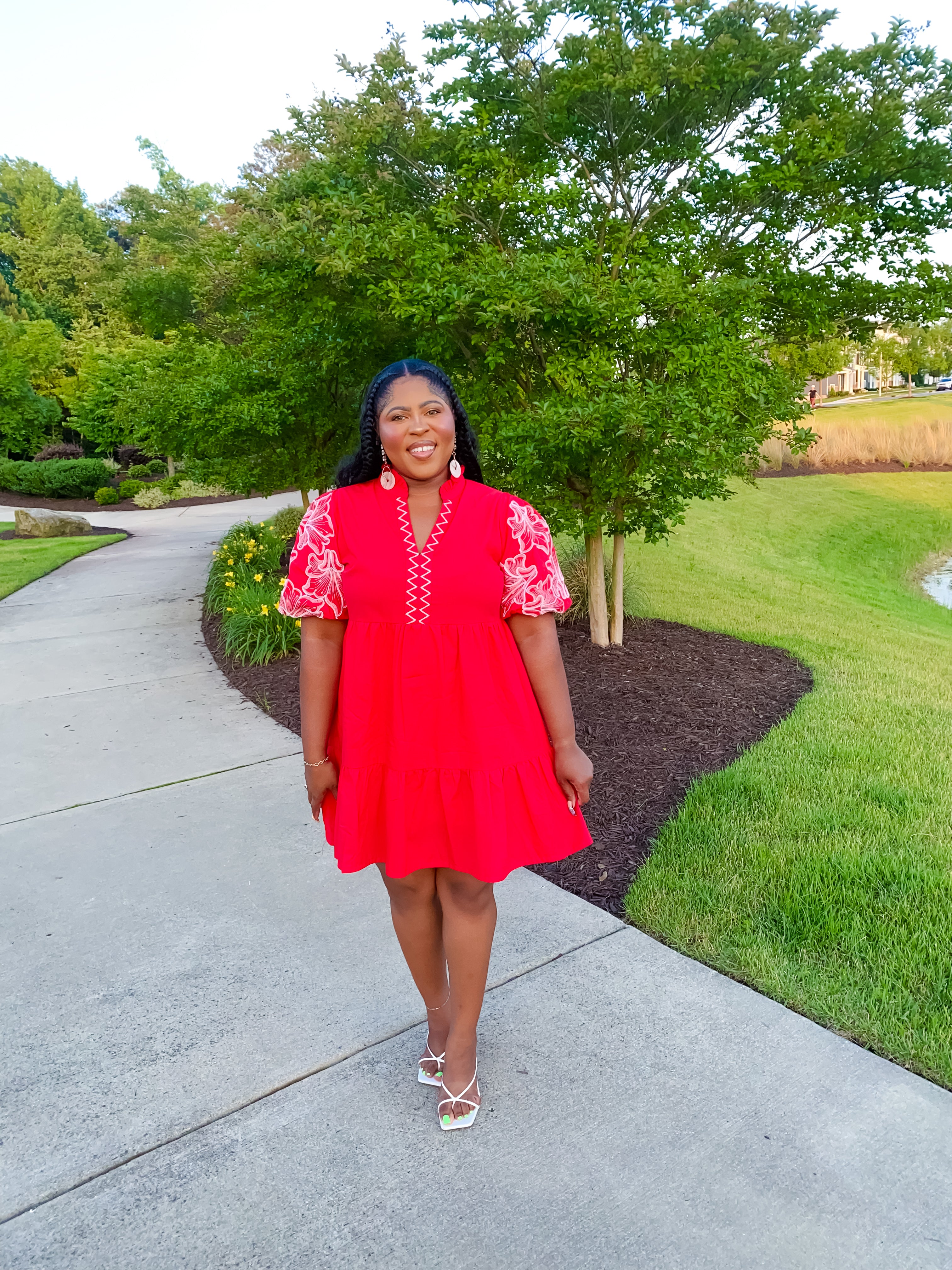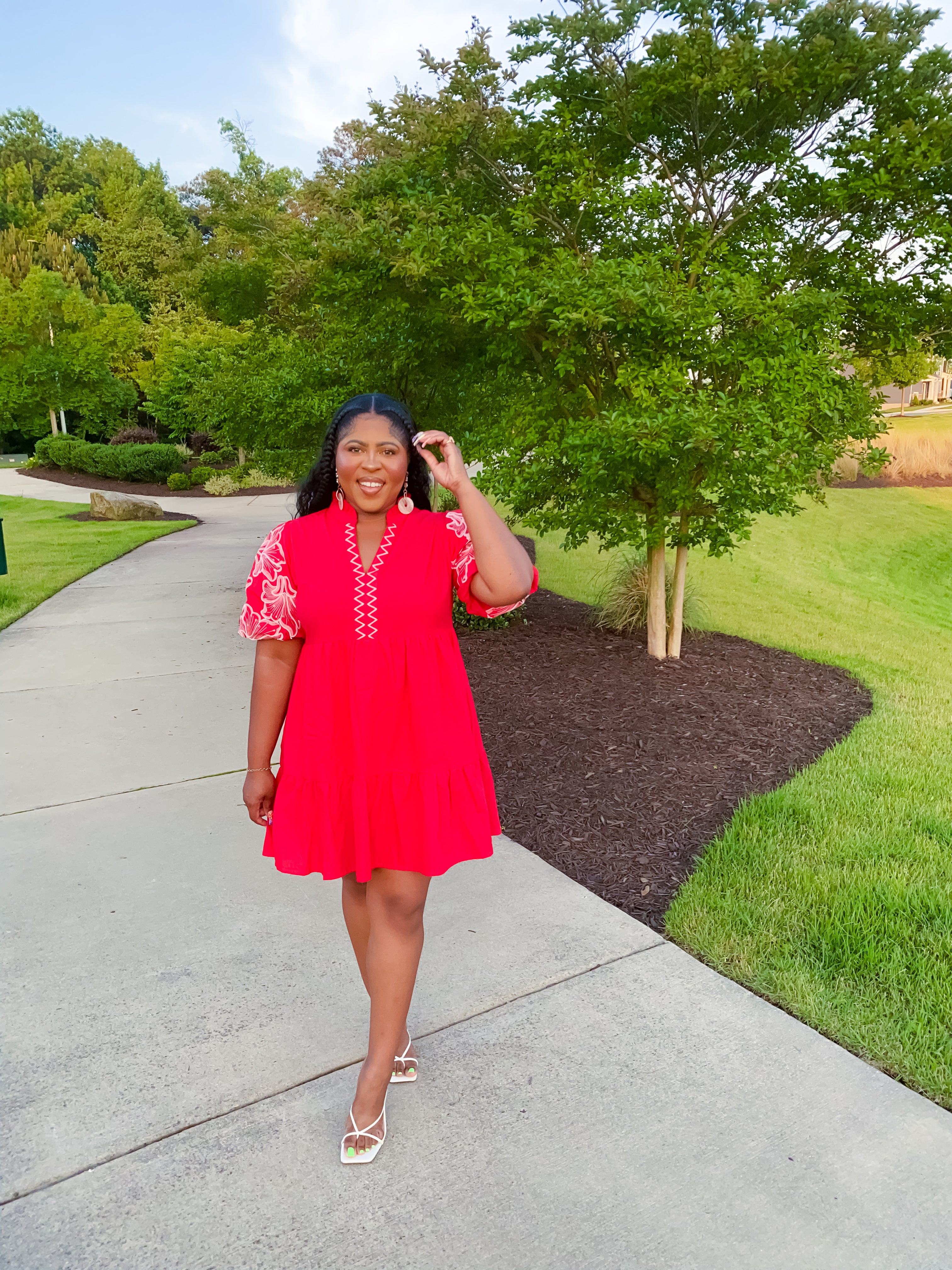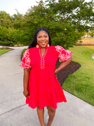 Stunning and bold red puff sleeve dress. Embroidered floral puff sleeve and split zig zag V neckline. Relaxed, A line silhouette. Lined.