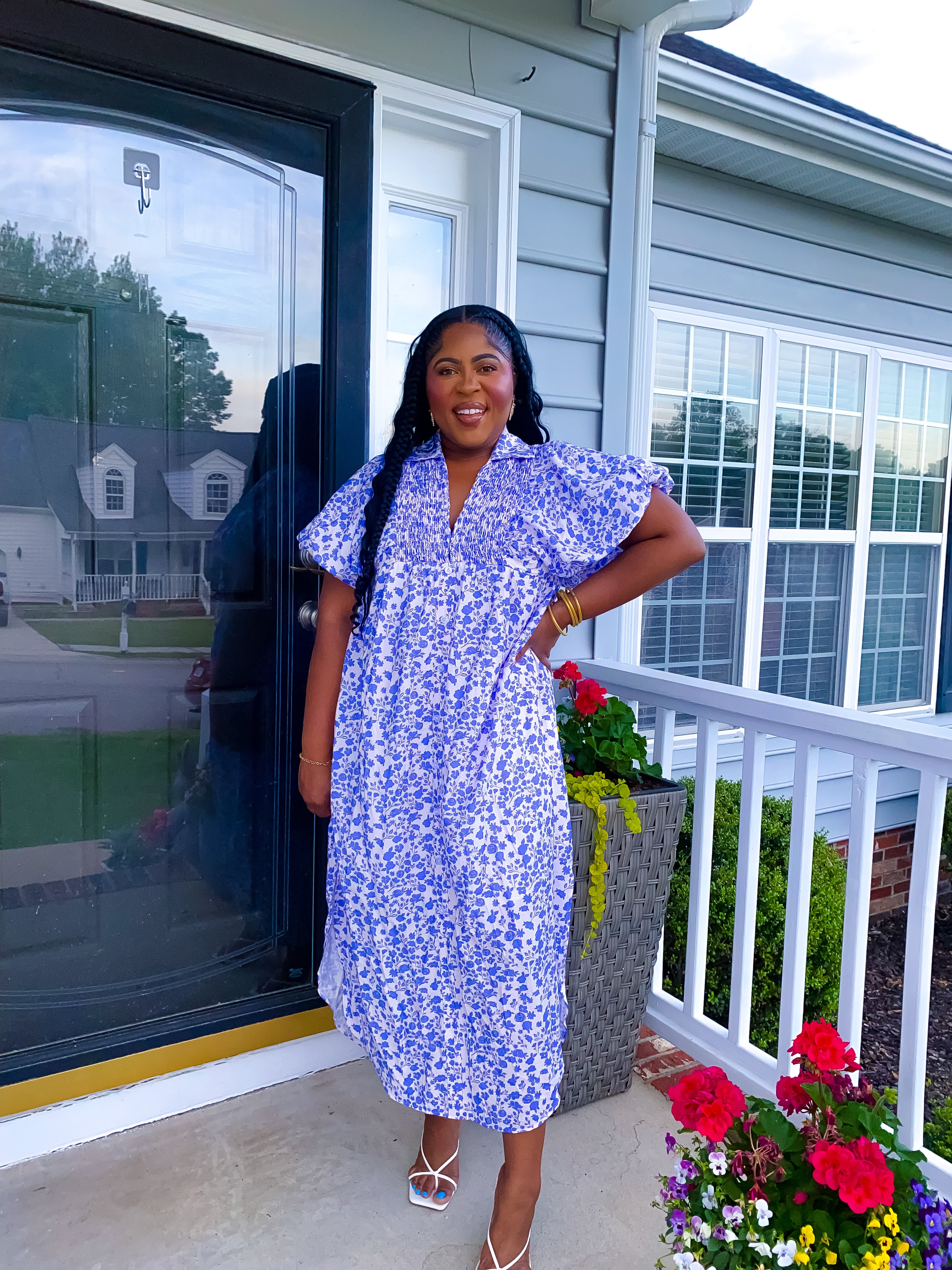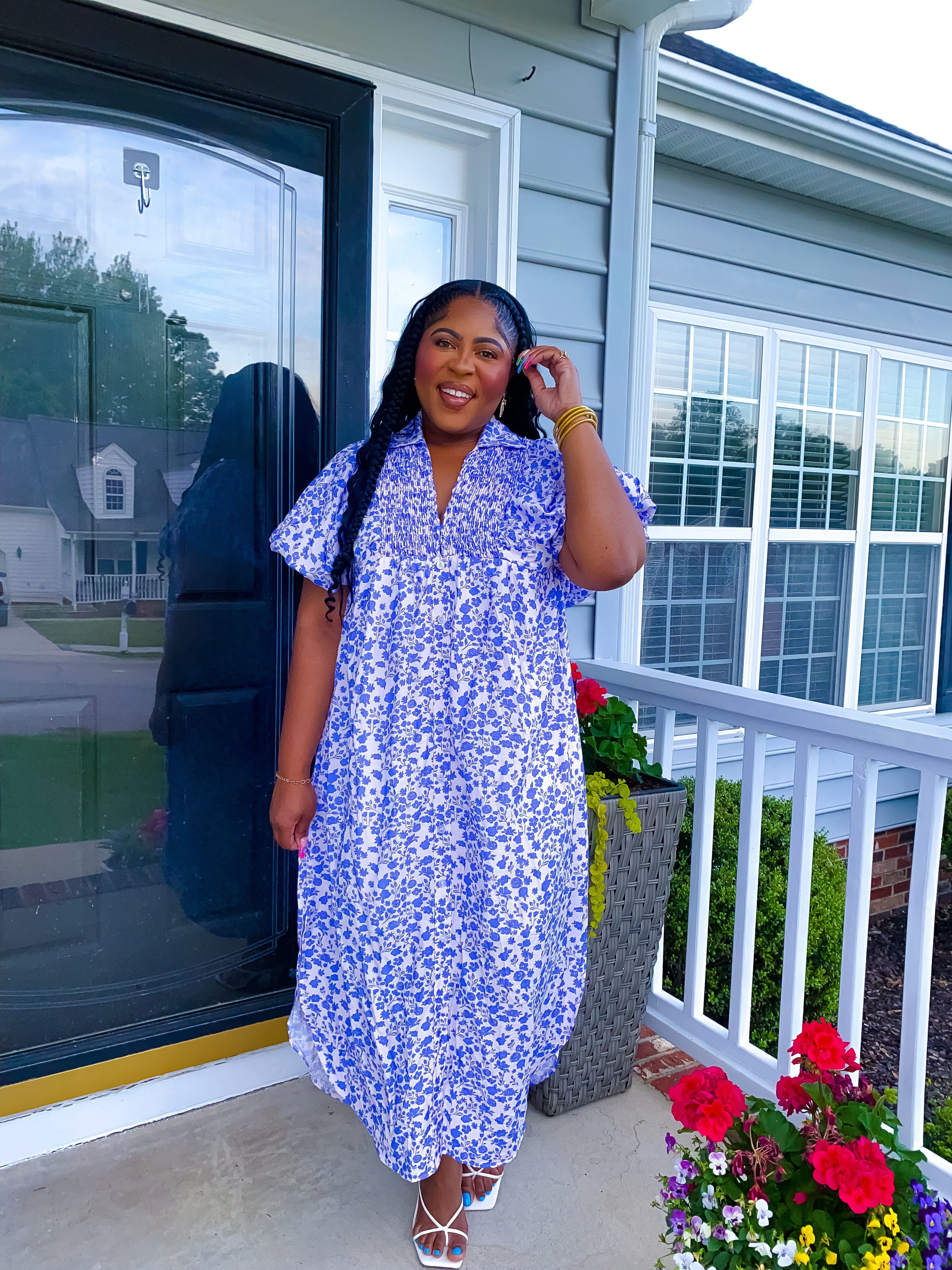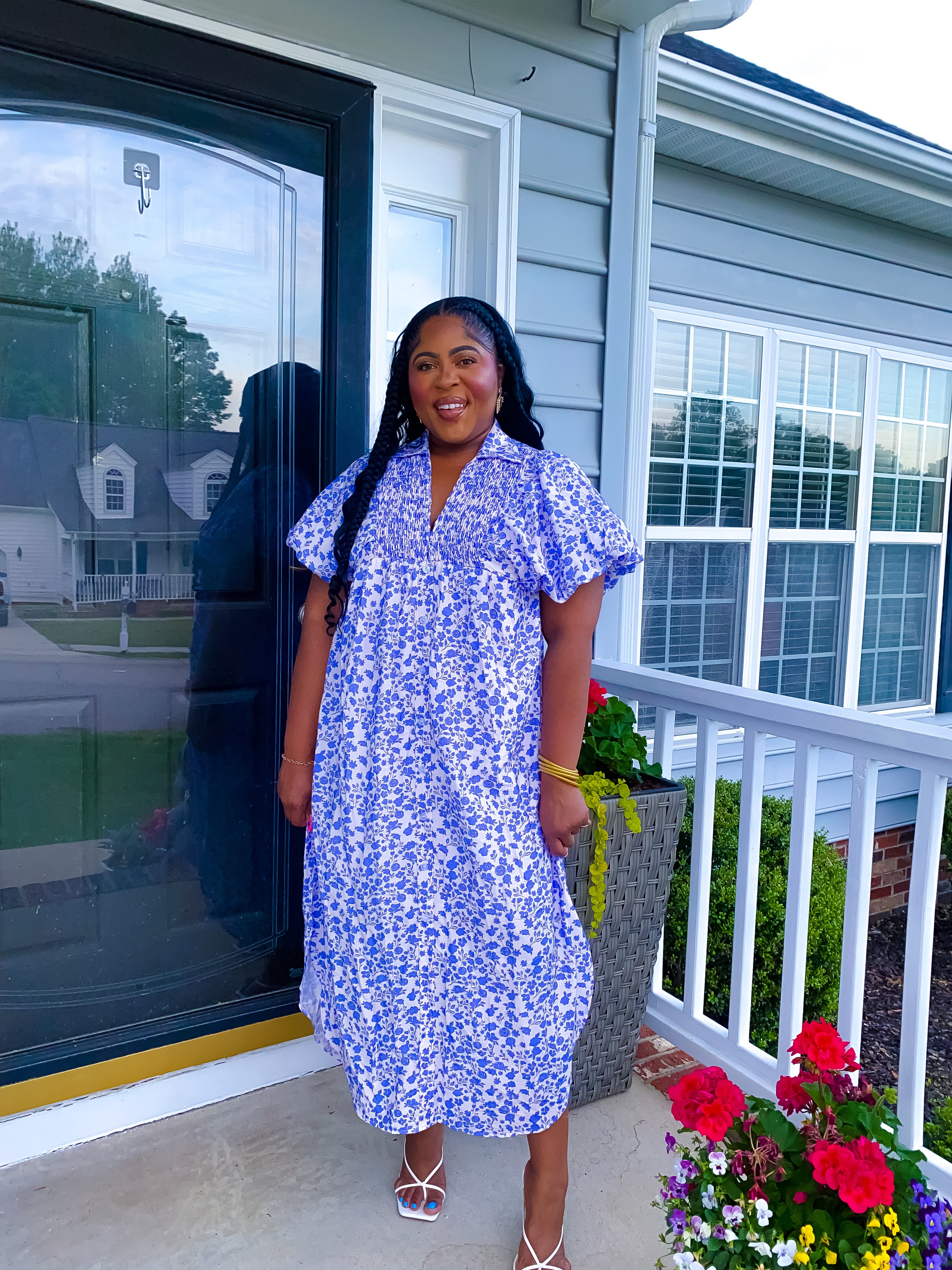 Beautiful blue and white colorway. Smocked V neckline collared midi dress. Faux front button detail with flattering side slit. Short puff sleeve. Lined and lightweight. Perfect, effortless dress you will feel stunning in all Spring and Summer.