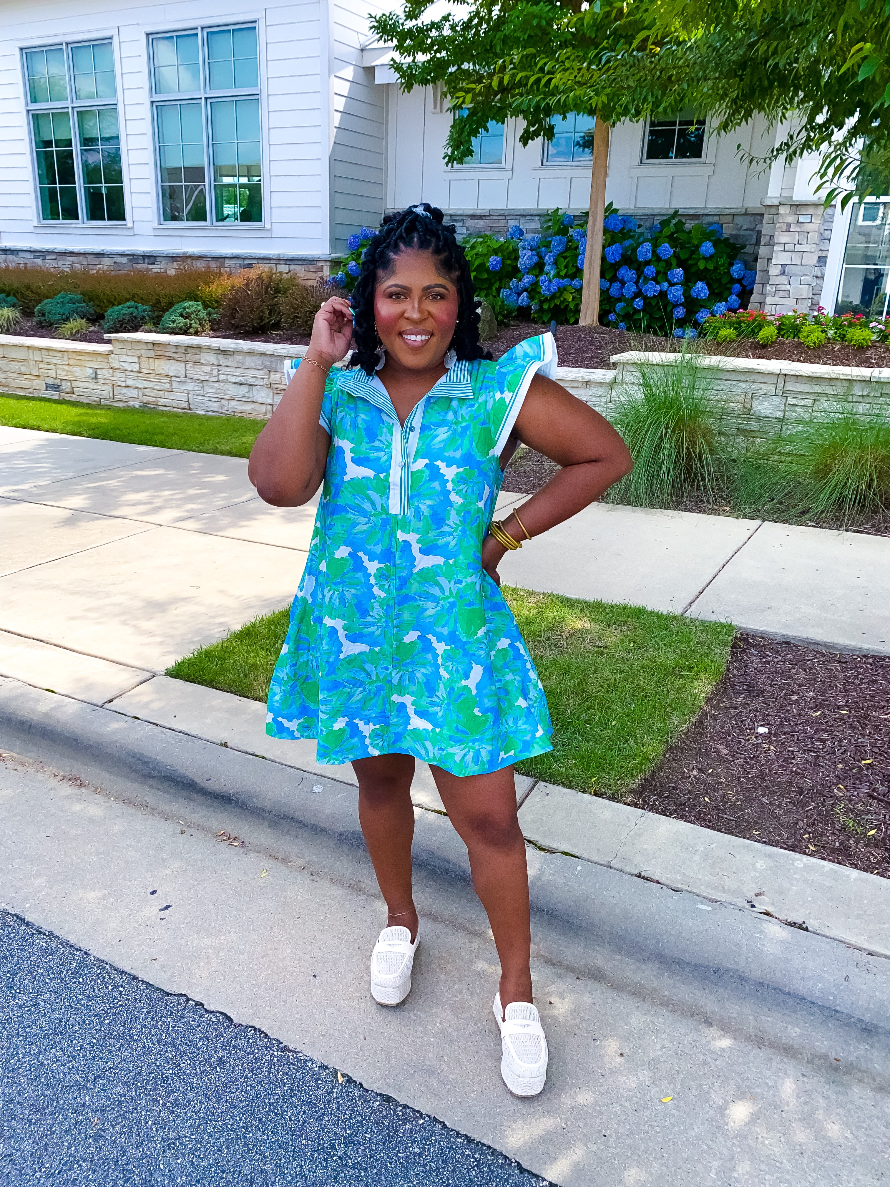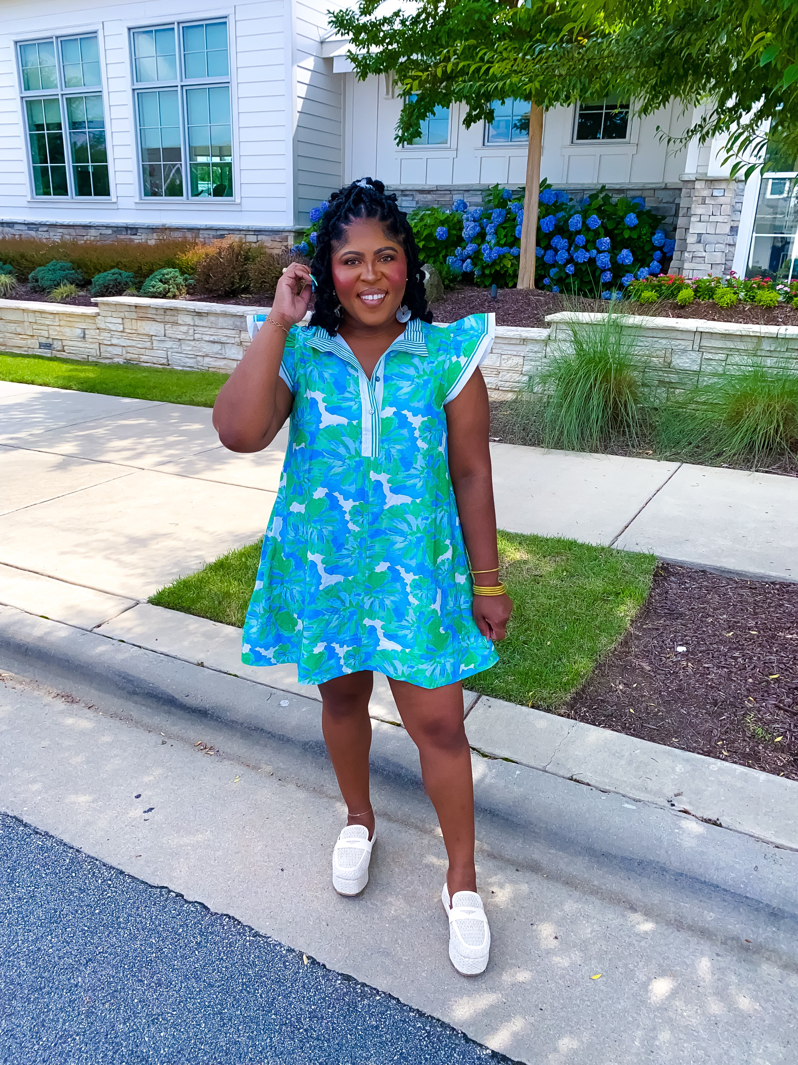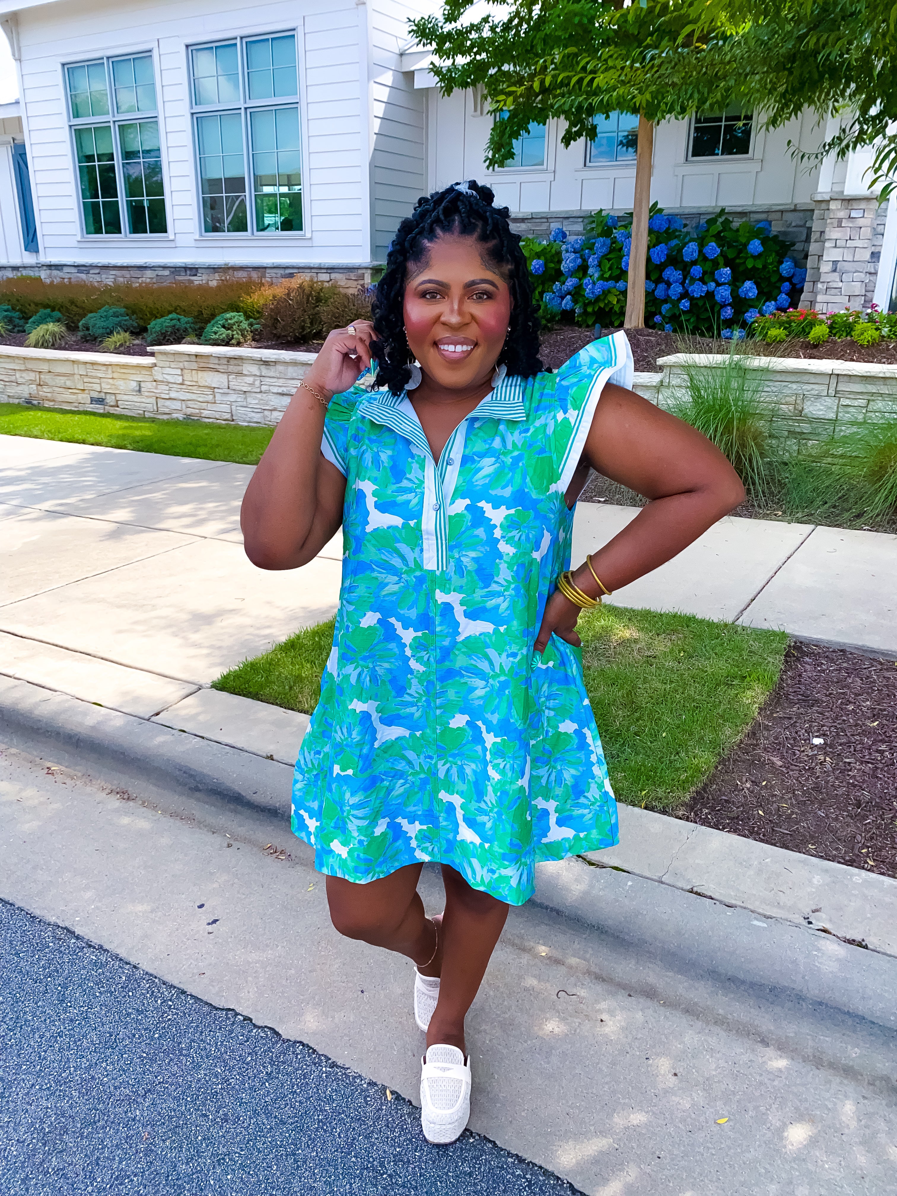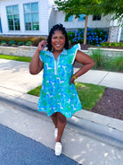 Stunning multi floral pattern dress in beautiful shades of blue and green. Flattering ruffle cap sleeve. Green and white stripe trim throughout. Button up neckline. Fully lined with pockets.