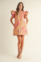 The perfect Fall Jacquard Dress. Rich and fabulous pattern. Flutter sleeve. Flattering v neckline. Fully lined. With pckets.