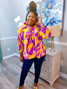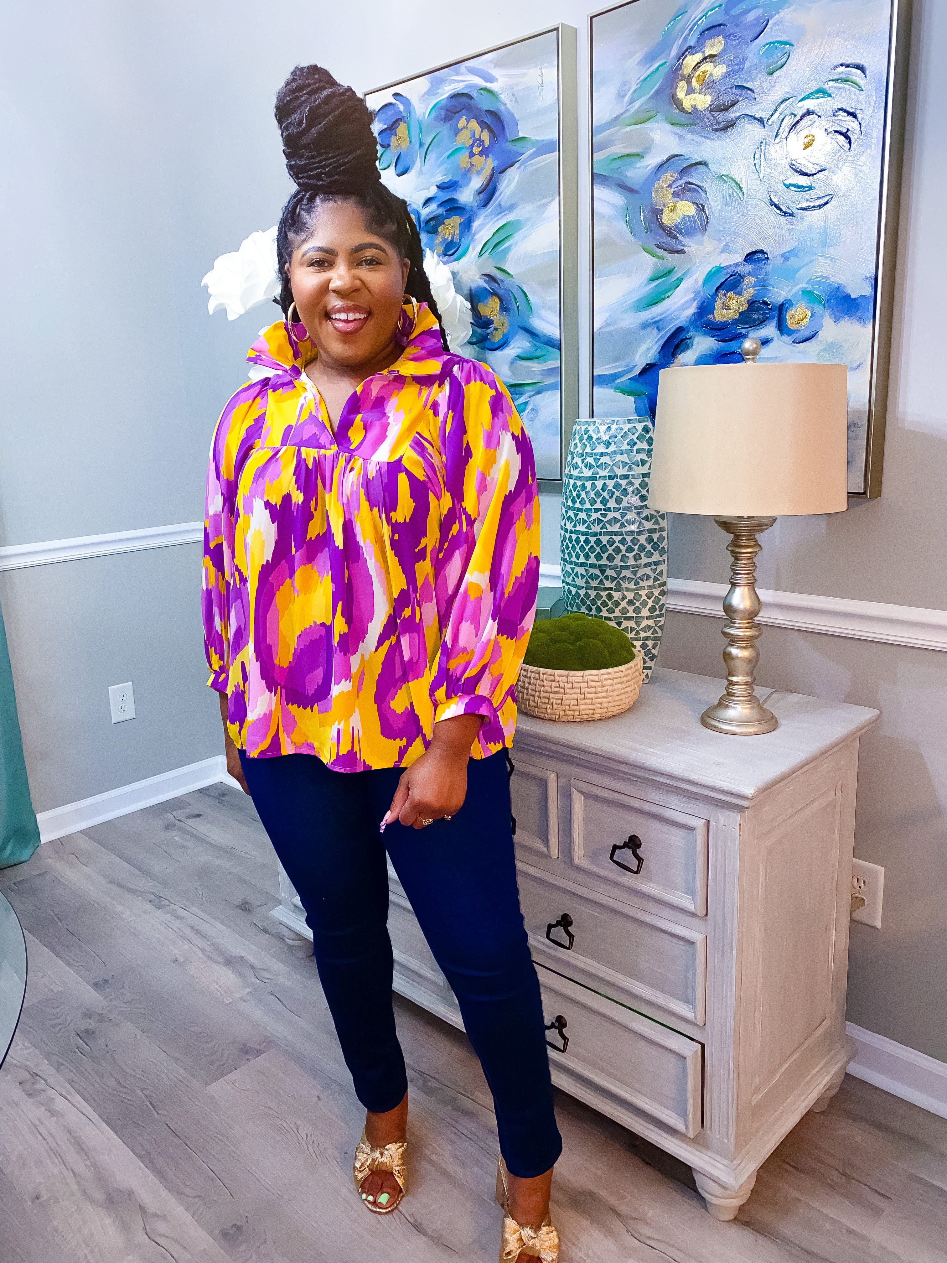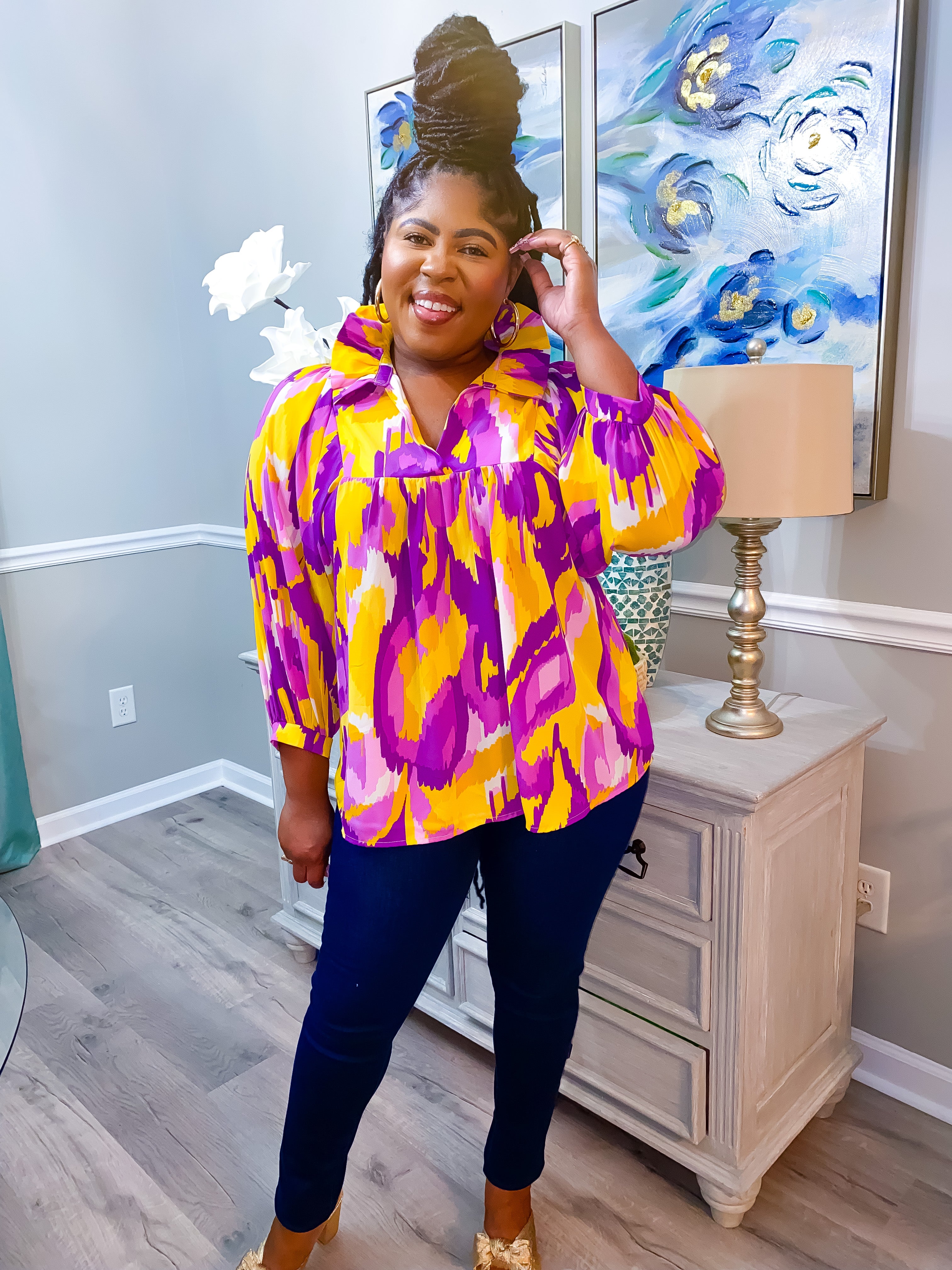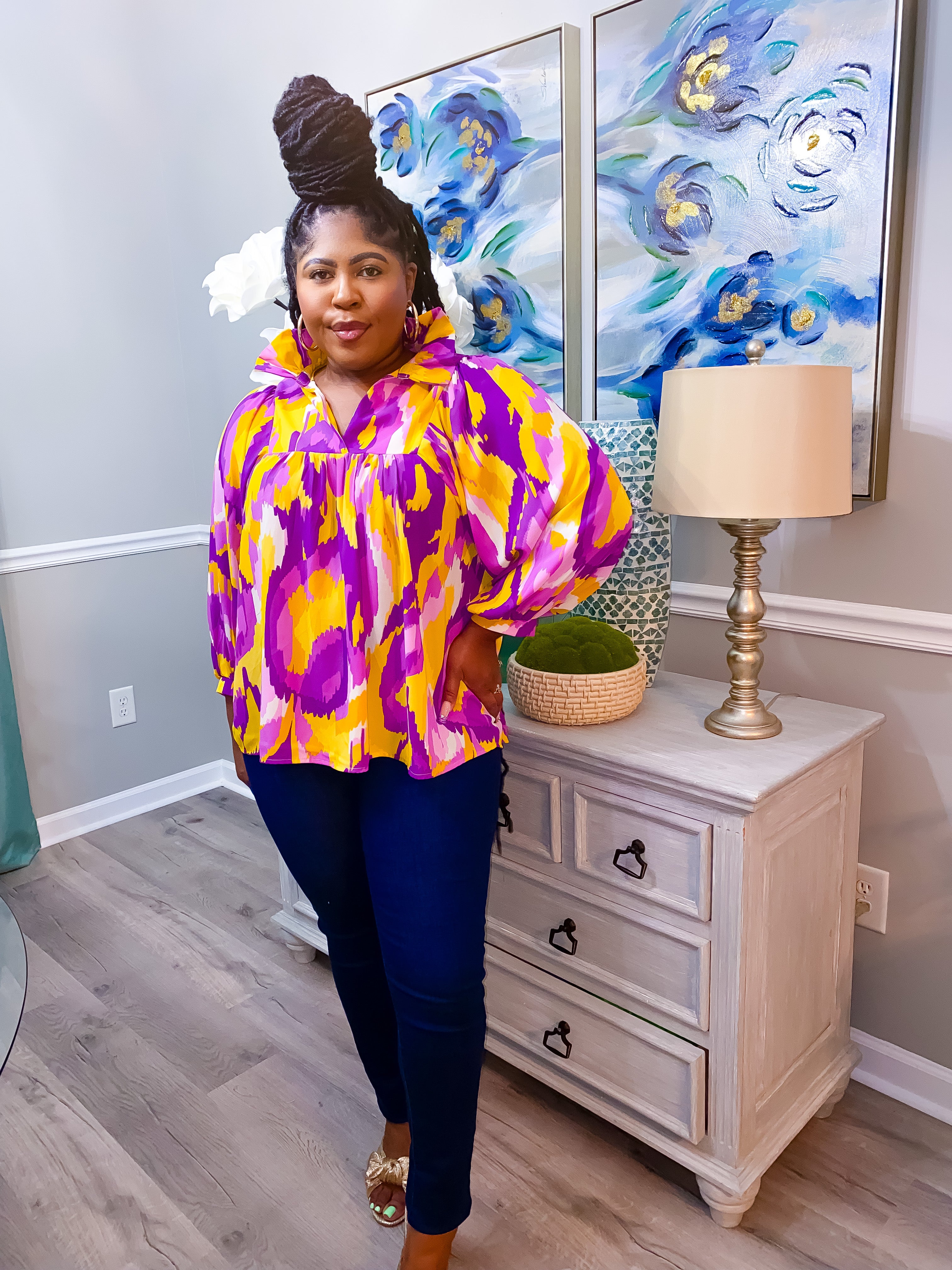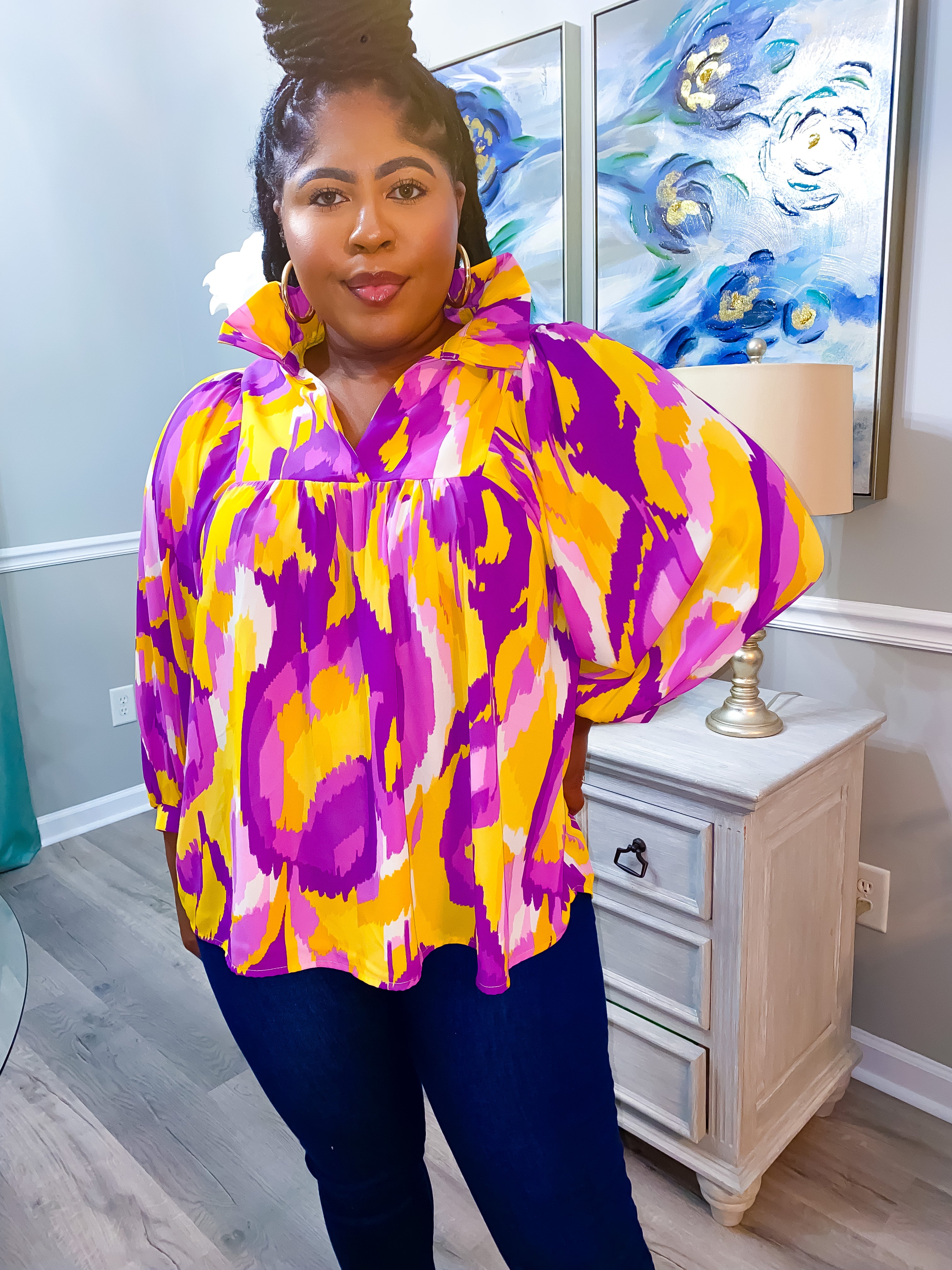 Get Gameday Ready in our Purple Spirit High Ruffle V-Neck Top. Pretty long puff sleeve top with high ruffle v neckline. Features a multi purple, yellow, and white colorway. Perfect top to dress up or dress down.
