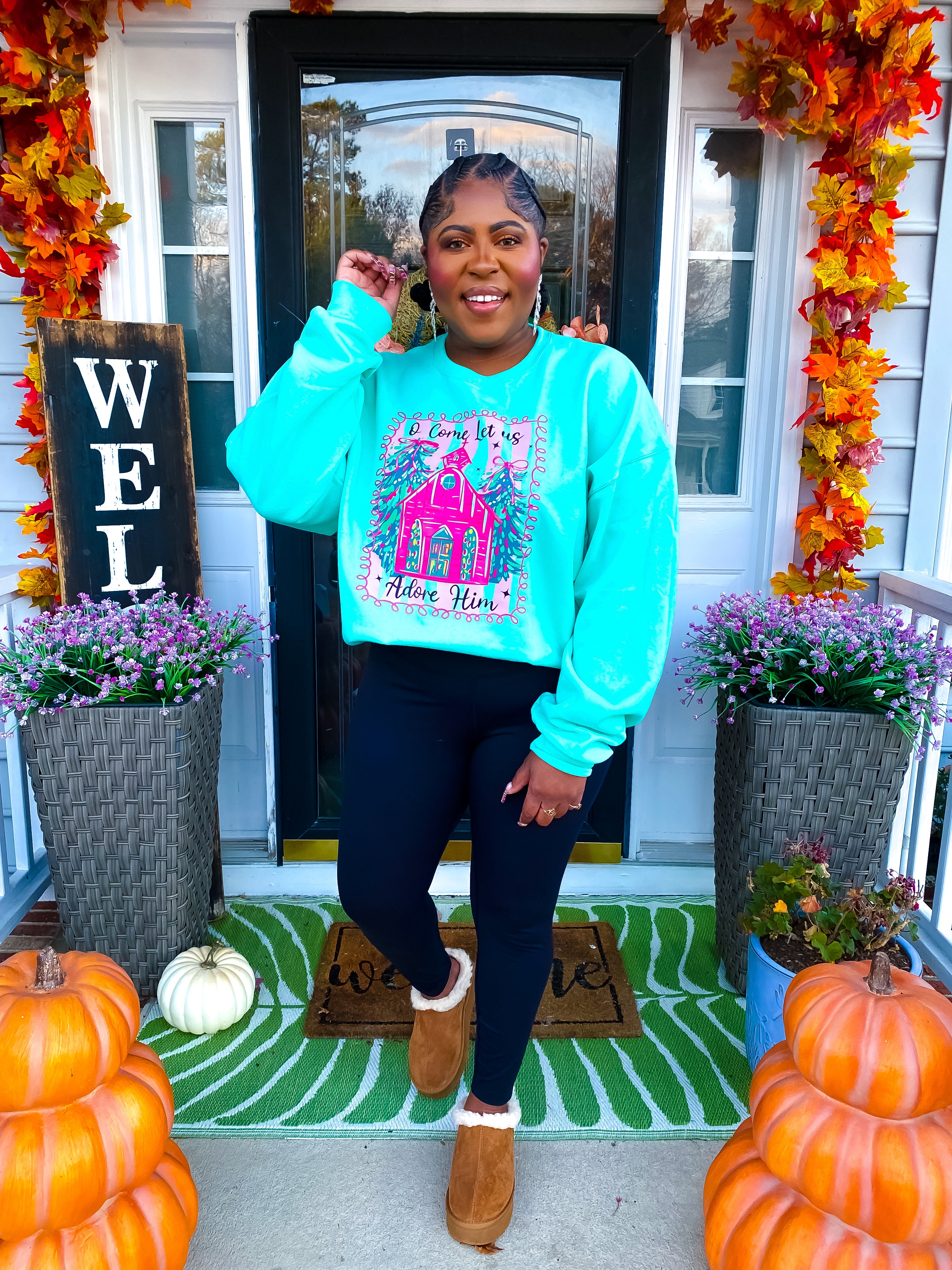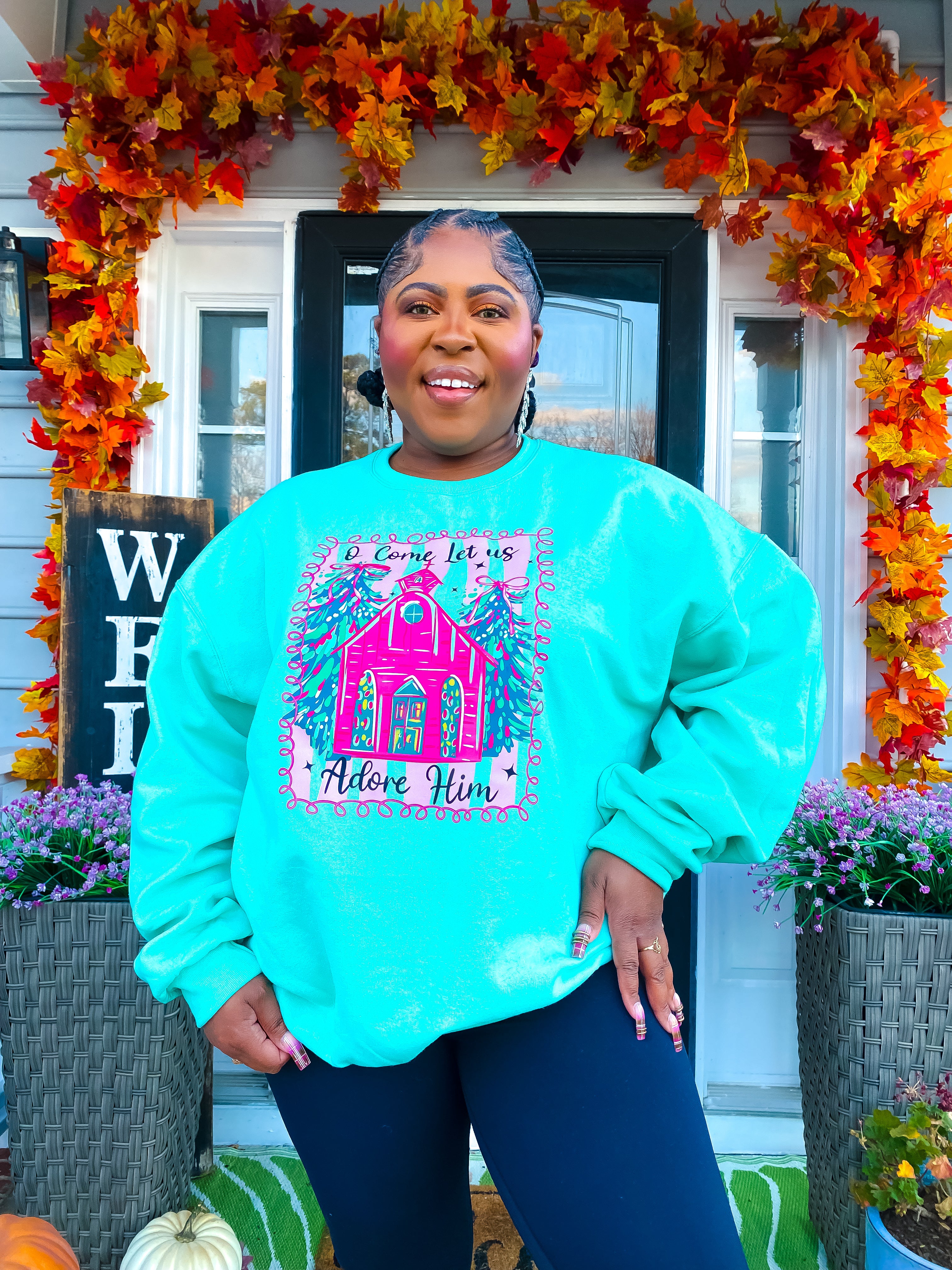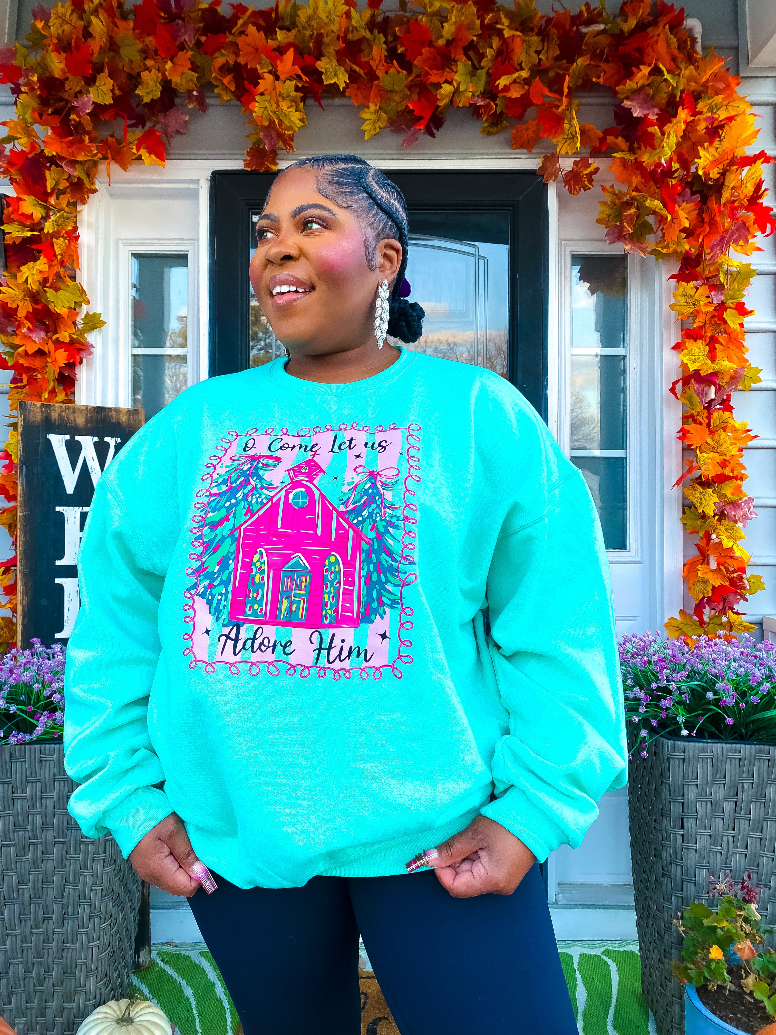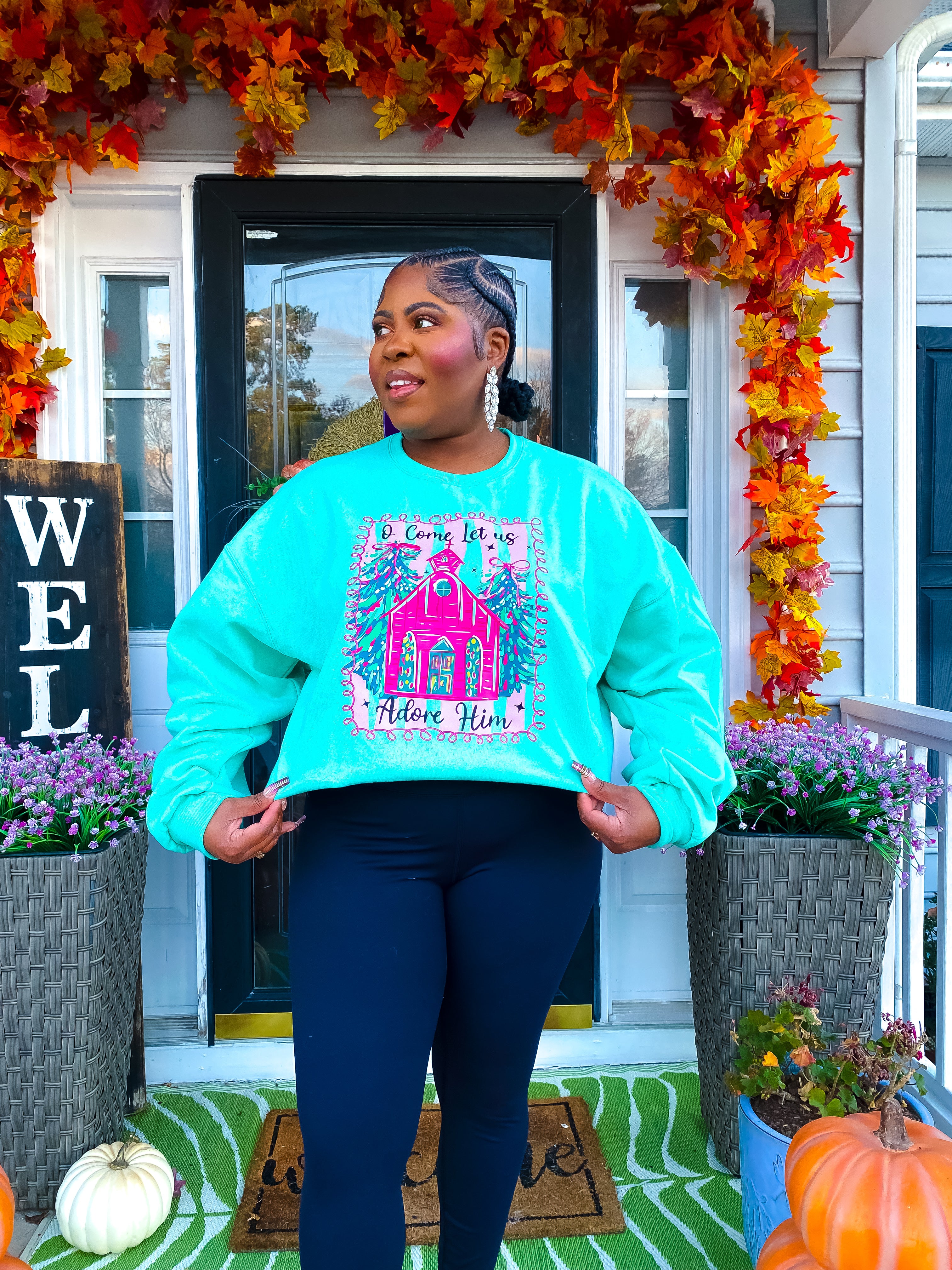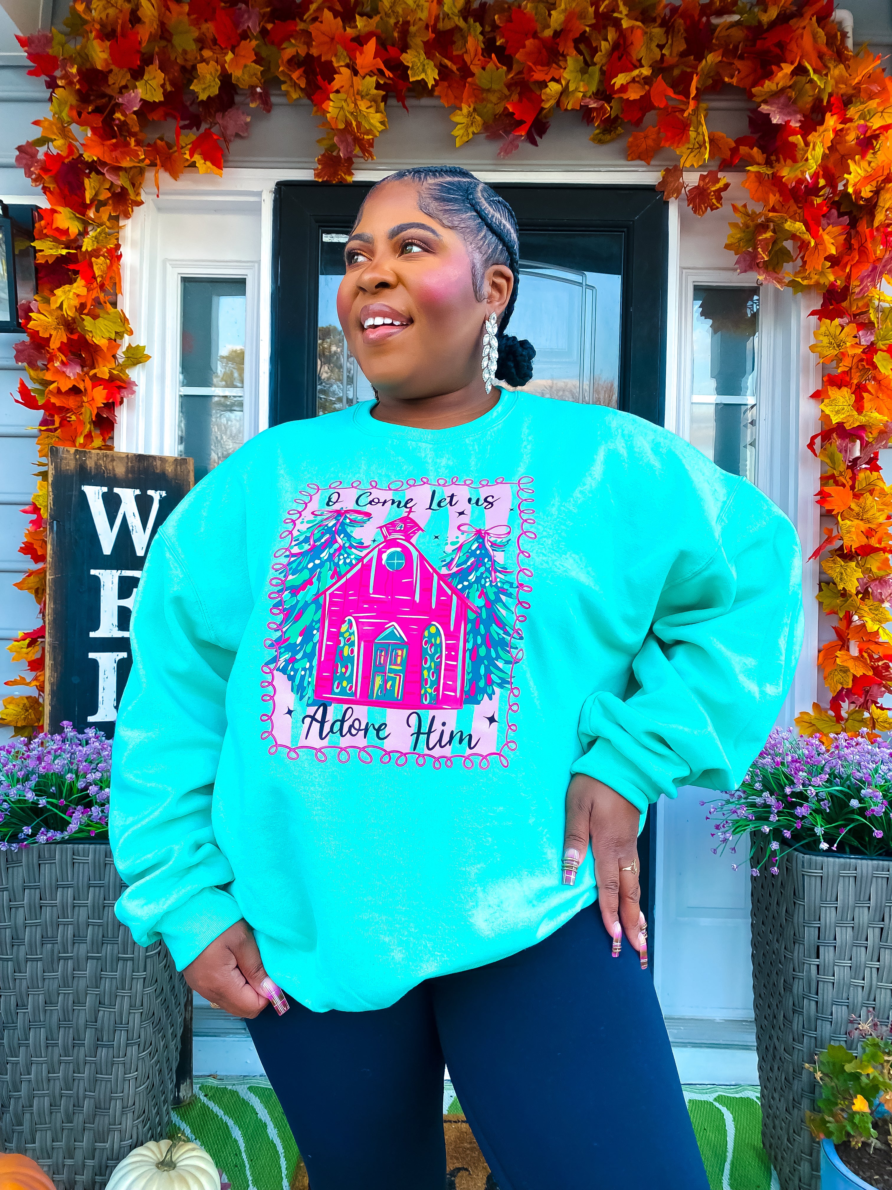 The Adore Him Sweatshirt is everything pink and fabulous!! Cozy and comfortable Christian dtf design on Cool Mint color!