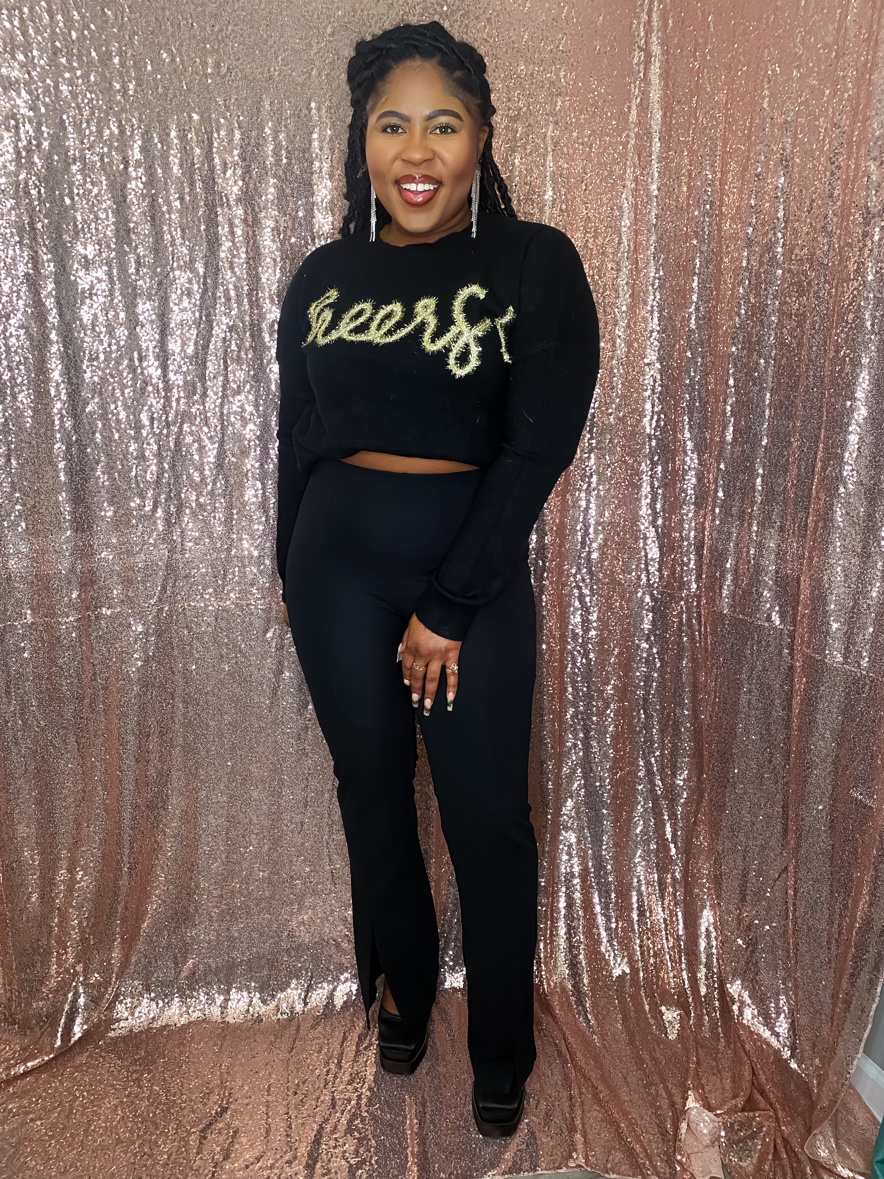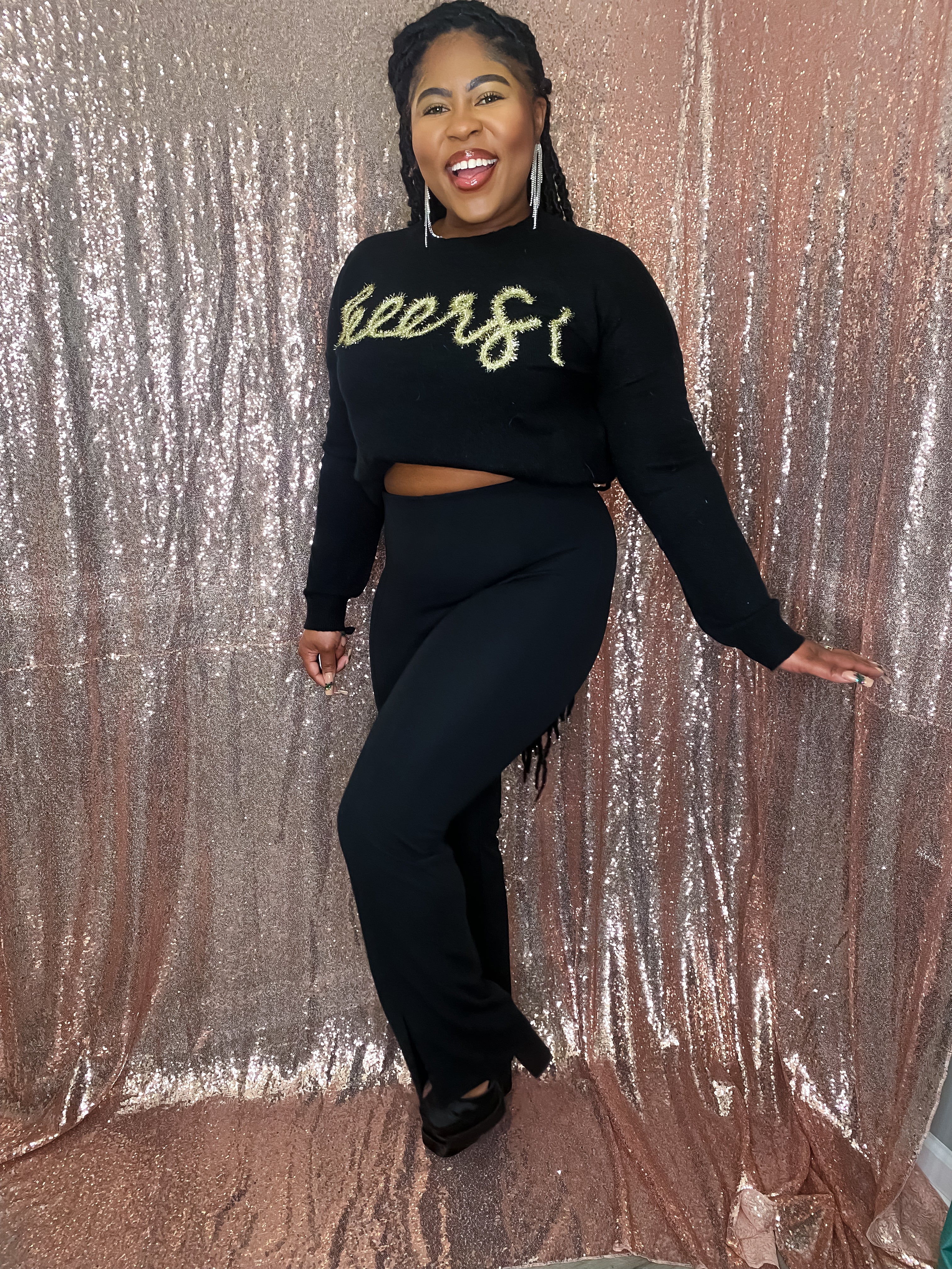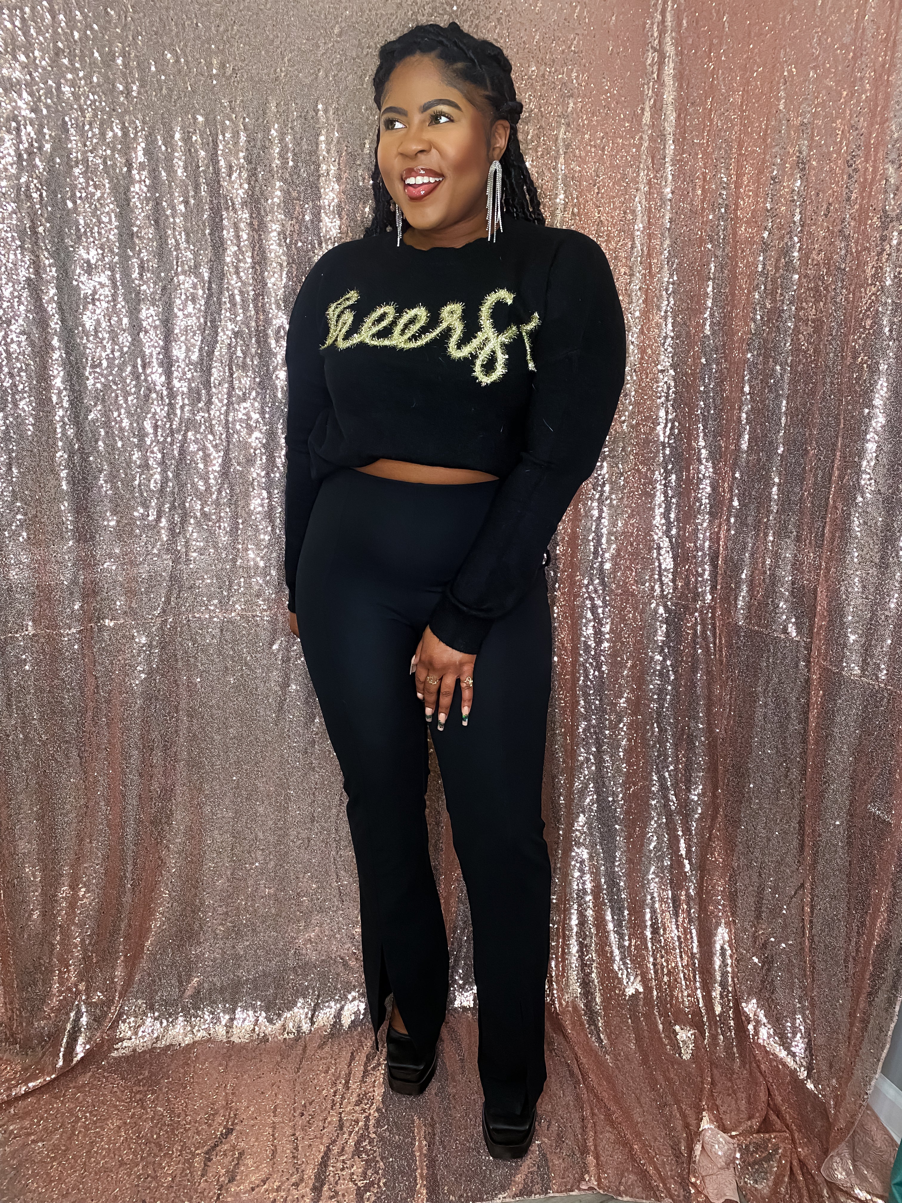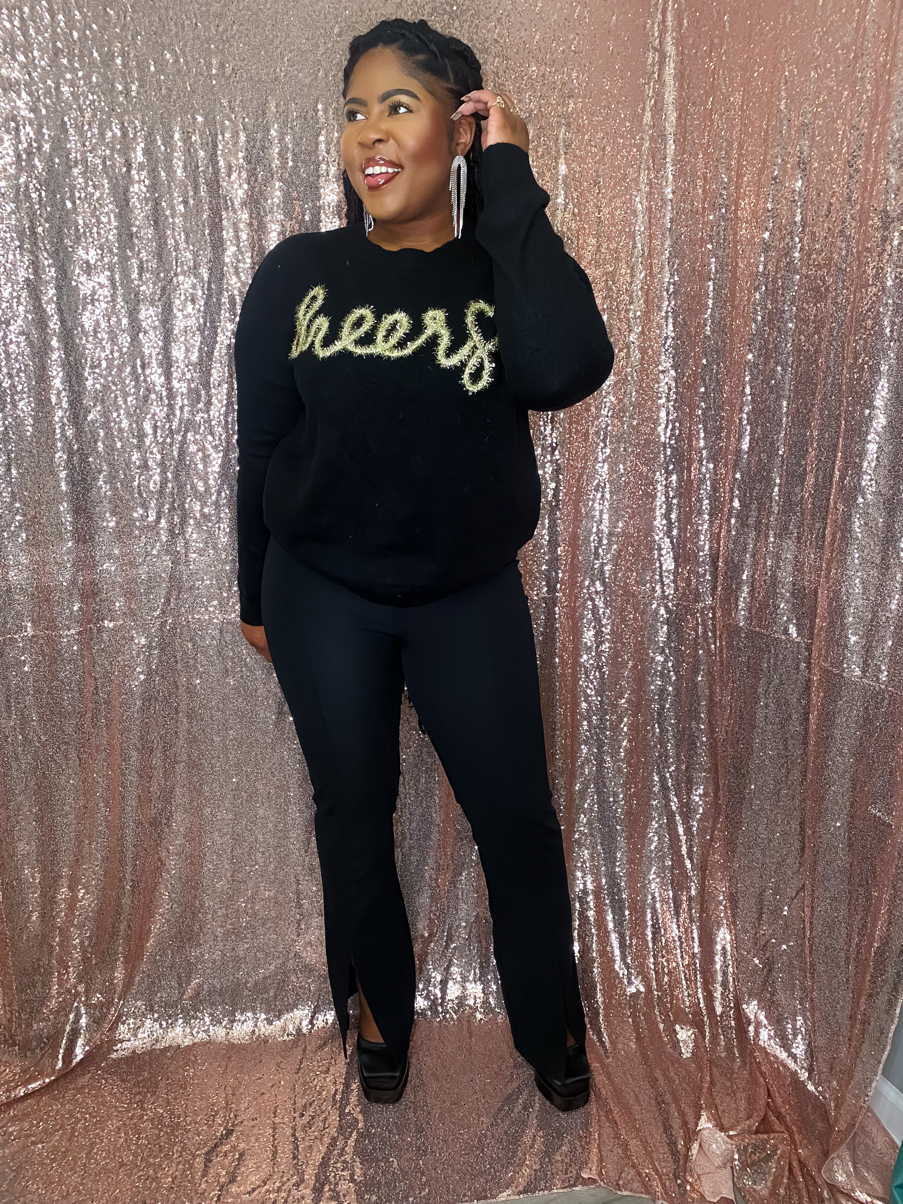 Let's give a toast to our Cheers Sweater. Soft, oversized knit pullover in black featuring gold tinsel "Cheers" on front. Long sleeve, loose fit perfect to wear to any festive event or get together at the house. Round neckline.