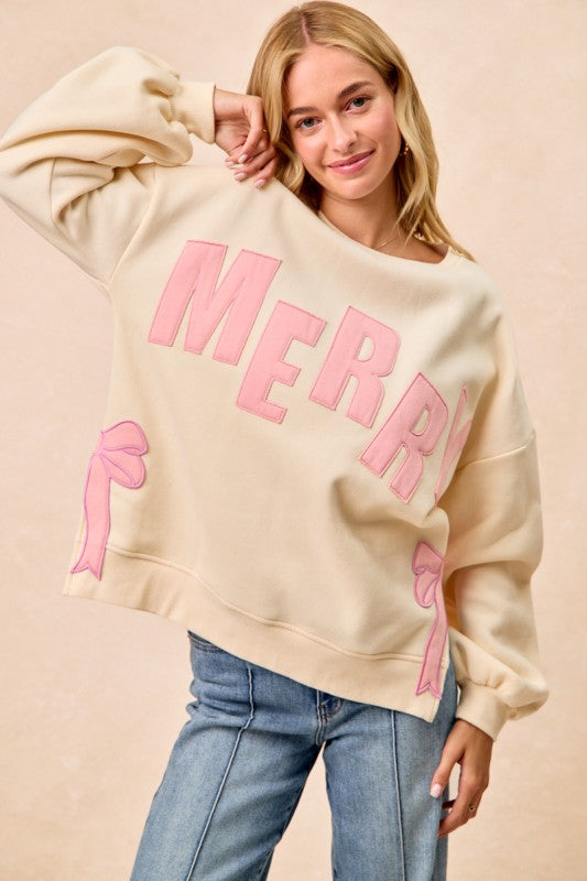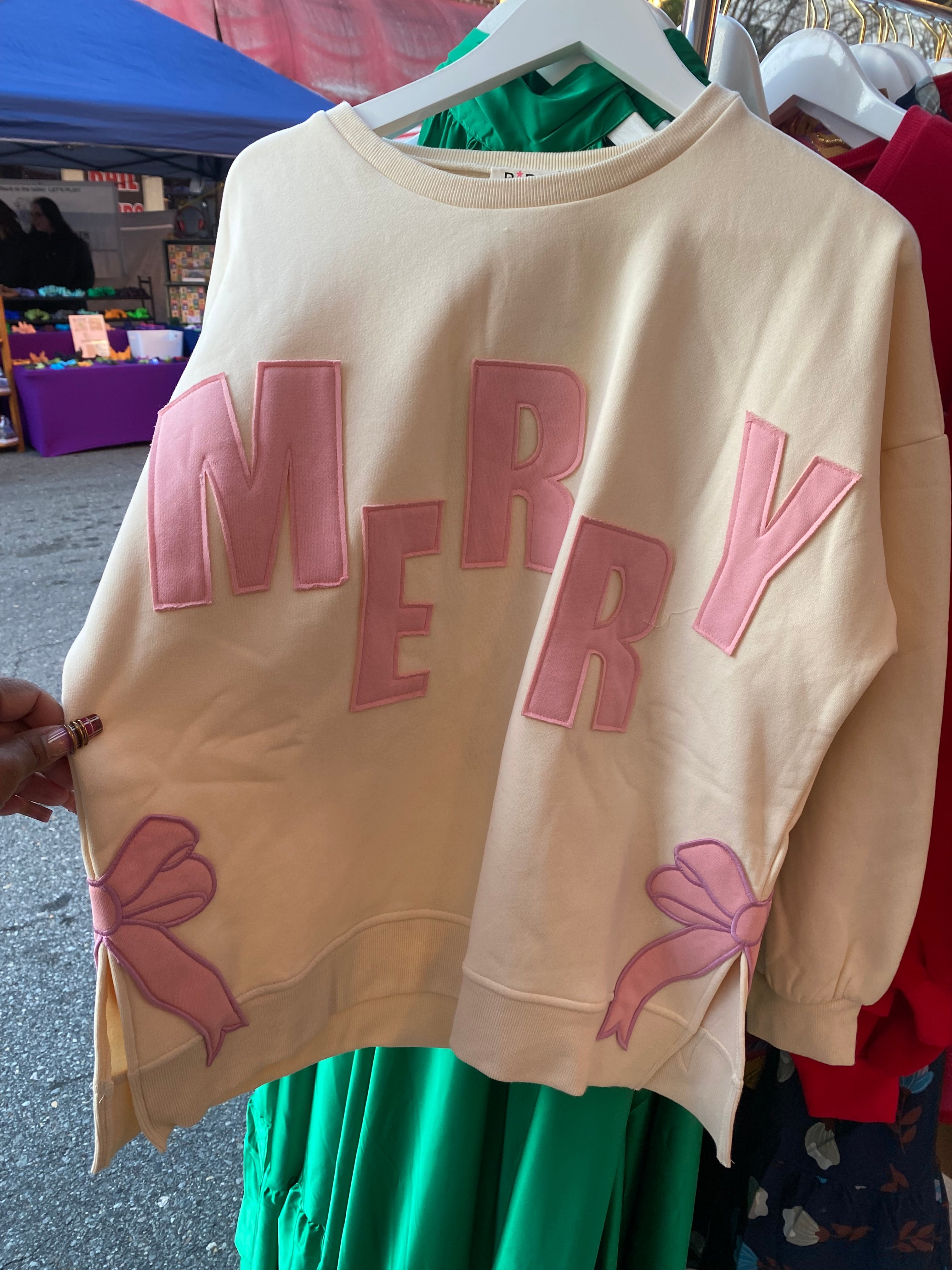 Let's get festive in our Merry Bow Sweatshirt in our Pink/Cream Color way! Relaxed, oversized sweatshirt features bold, pink "MERRY" on front. Flattering side slits with pink bow patch. Perfect to style with leggings for a casual look or jeans. Also pair with a lace or sequin skirt for an extra girly look.