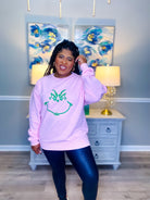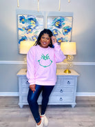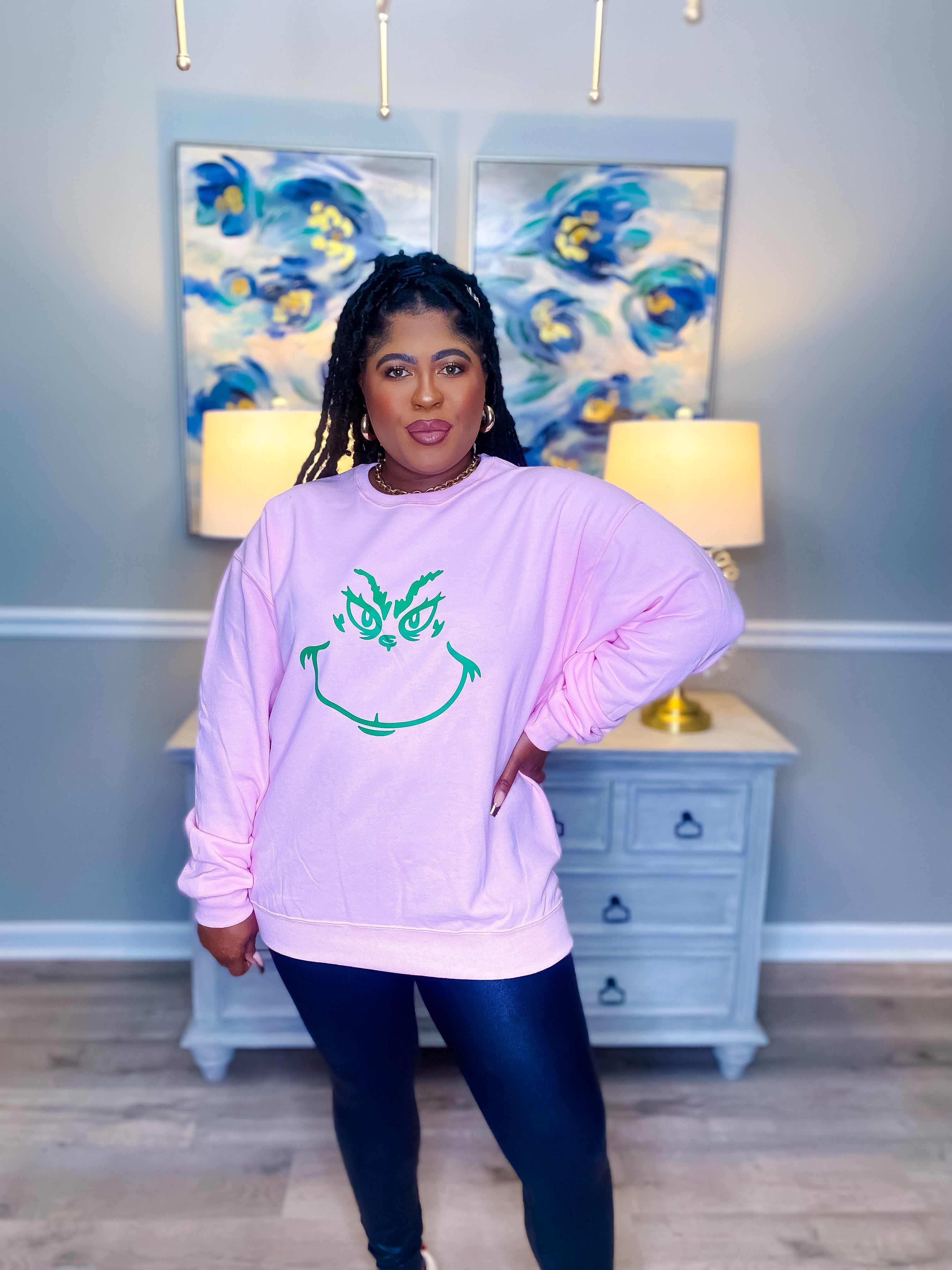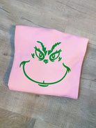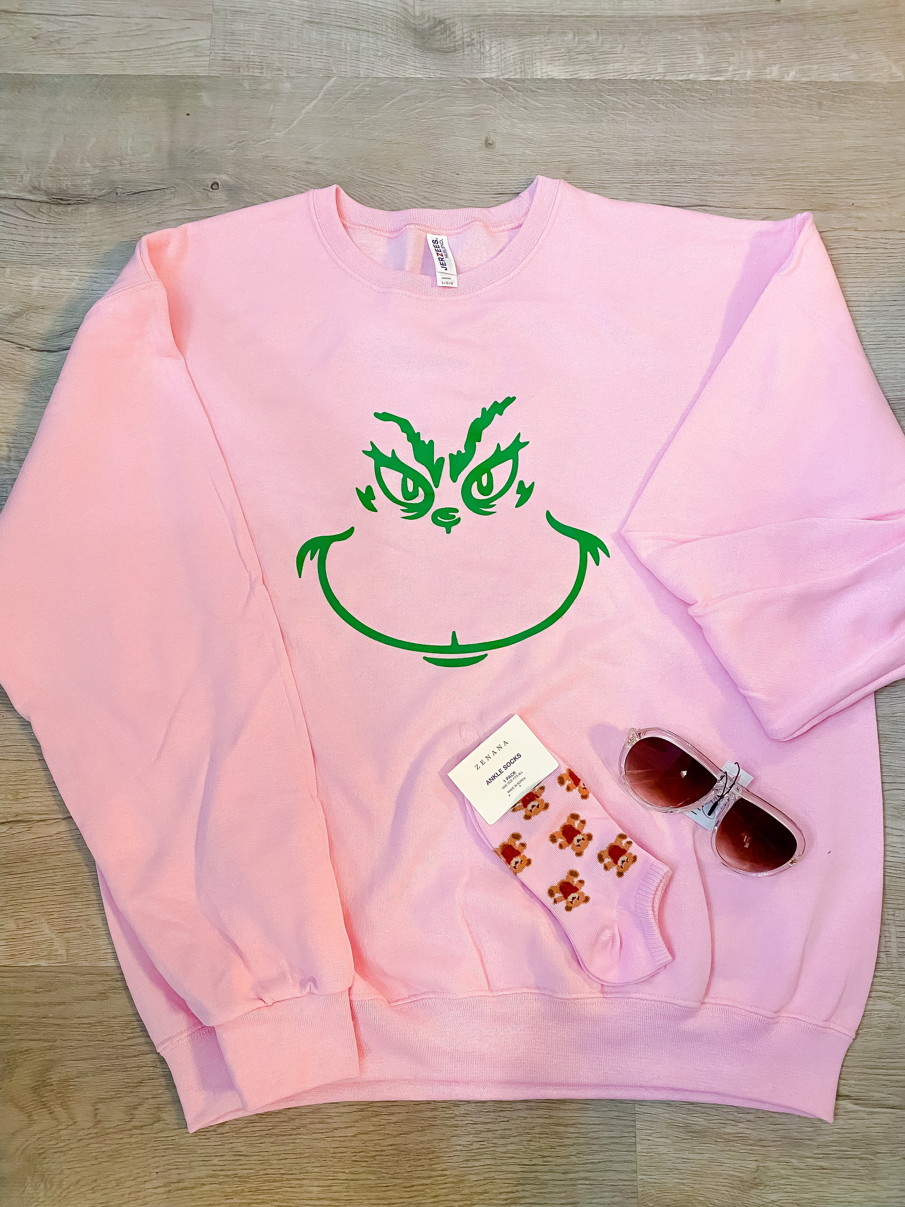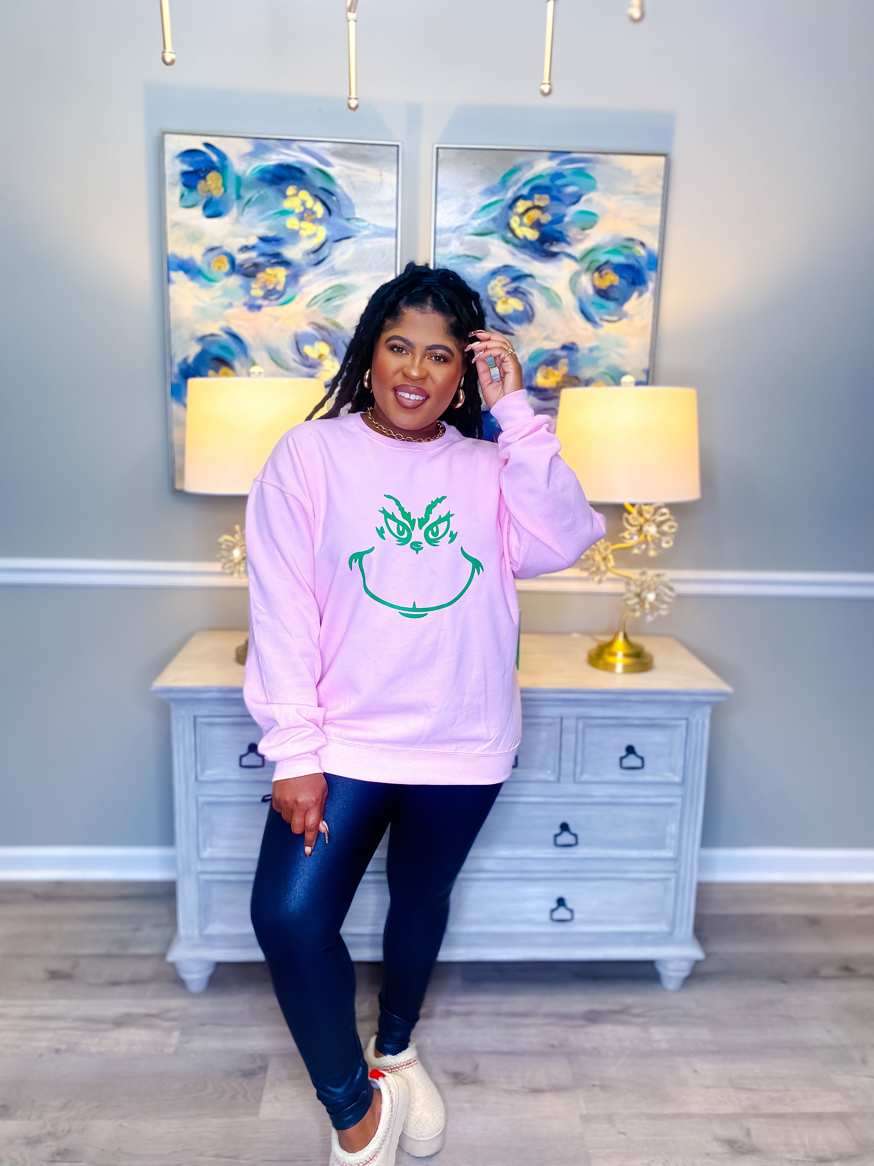 Grinch face design in true Grinch green on a Jerzees Nublend sweatshirt in Classic Pink.