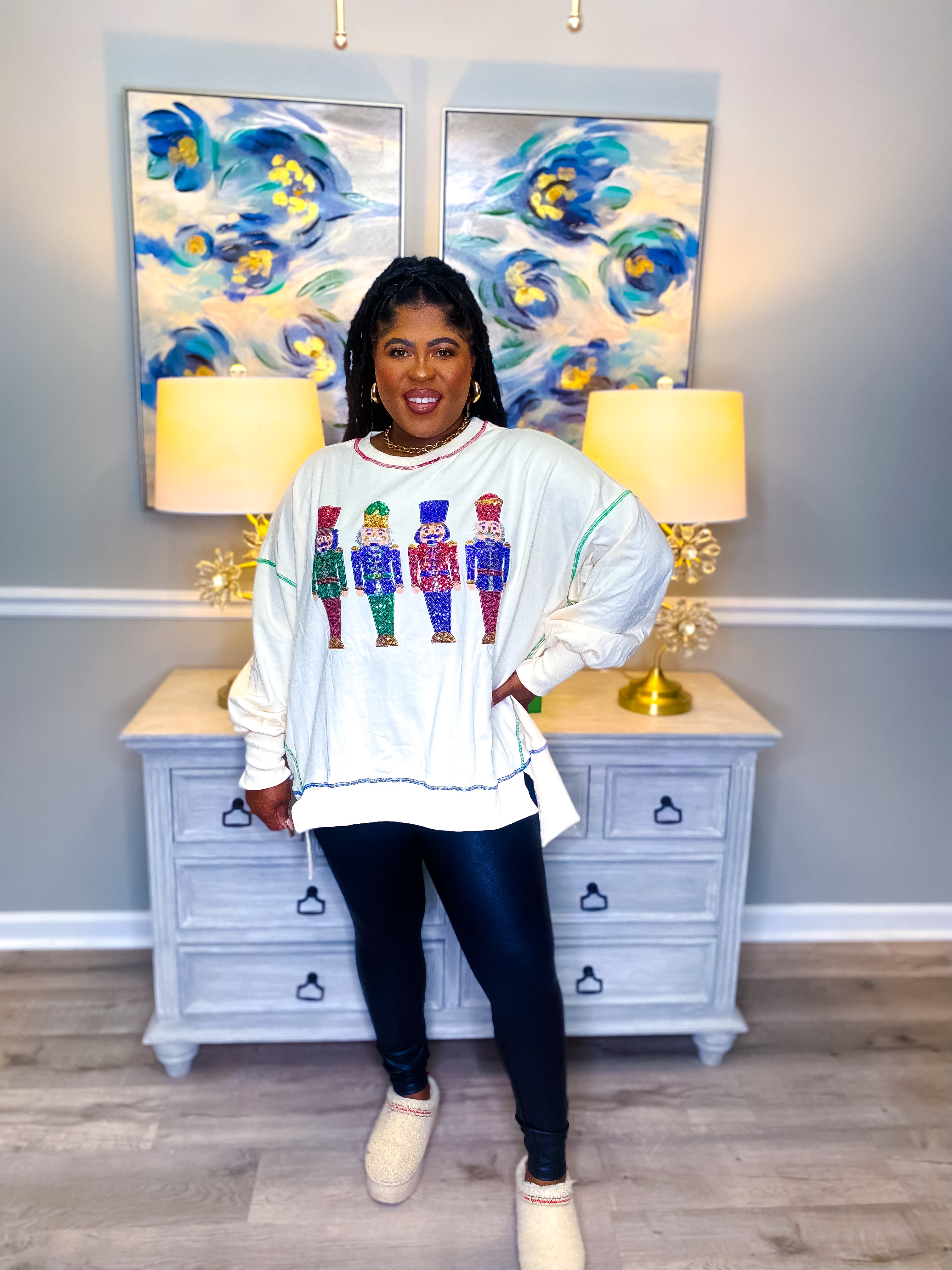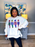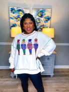 Let's get festive in our Son of a Nutcracker Sweatshirt! Relaxed, oversized fit sweatshirt features multi colored stitched sequin nutcrackers. Long balloon sleeves, round neck design with side slits for flattering fit. Multi colored color block seam throughout. Cream Background, medium weight texture with ribbed wrist, collar, and bottom.