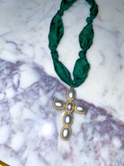 Emerald green scarf necklace with Pearl cross pendent. Lobster clasp closure.