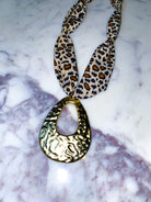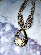 Hammered gold drop pendent on cheetah scarf necklace. Lobster clasp closure.