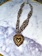 Pretty heart charm pendent on cheetah scarf. Lobster clasp closure.
