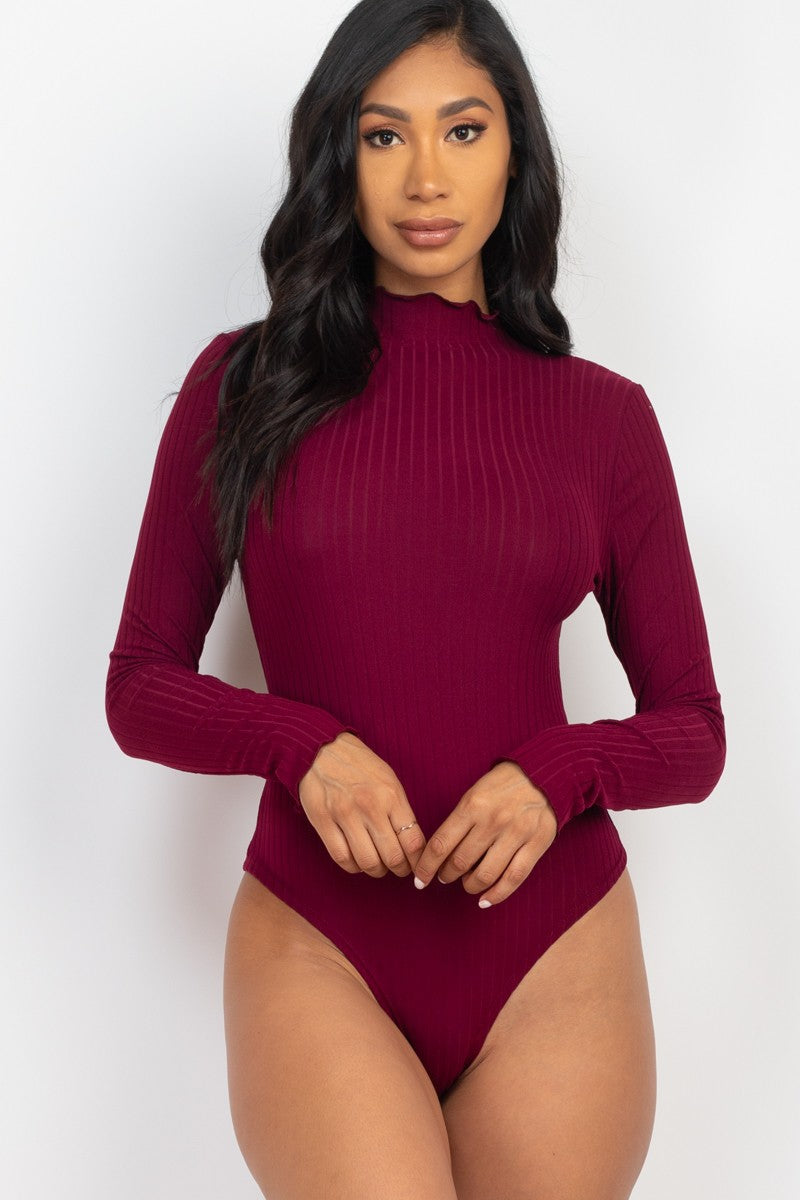 Lightweight and soft ribbed bodysuit in staple burgundy color. Perfect everyday basic that must be in your closet. Ribbed body throughout with feminine lettuce edge mock neckline. Long sleeve. Stretchy, comfortable curve fitting fabric with two snap button bottom closure.
