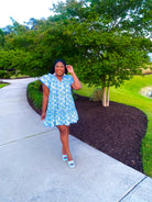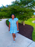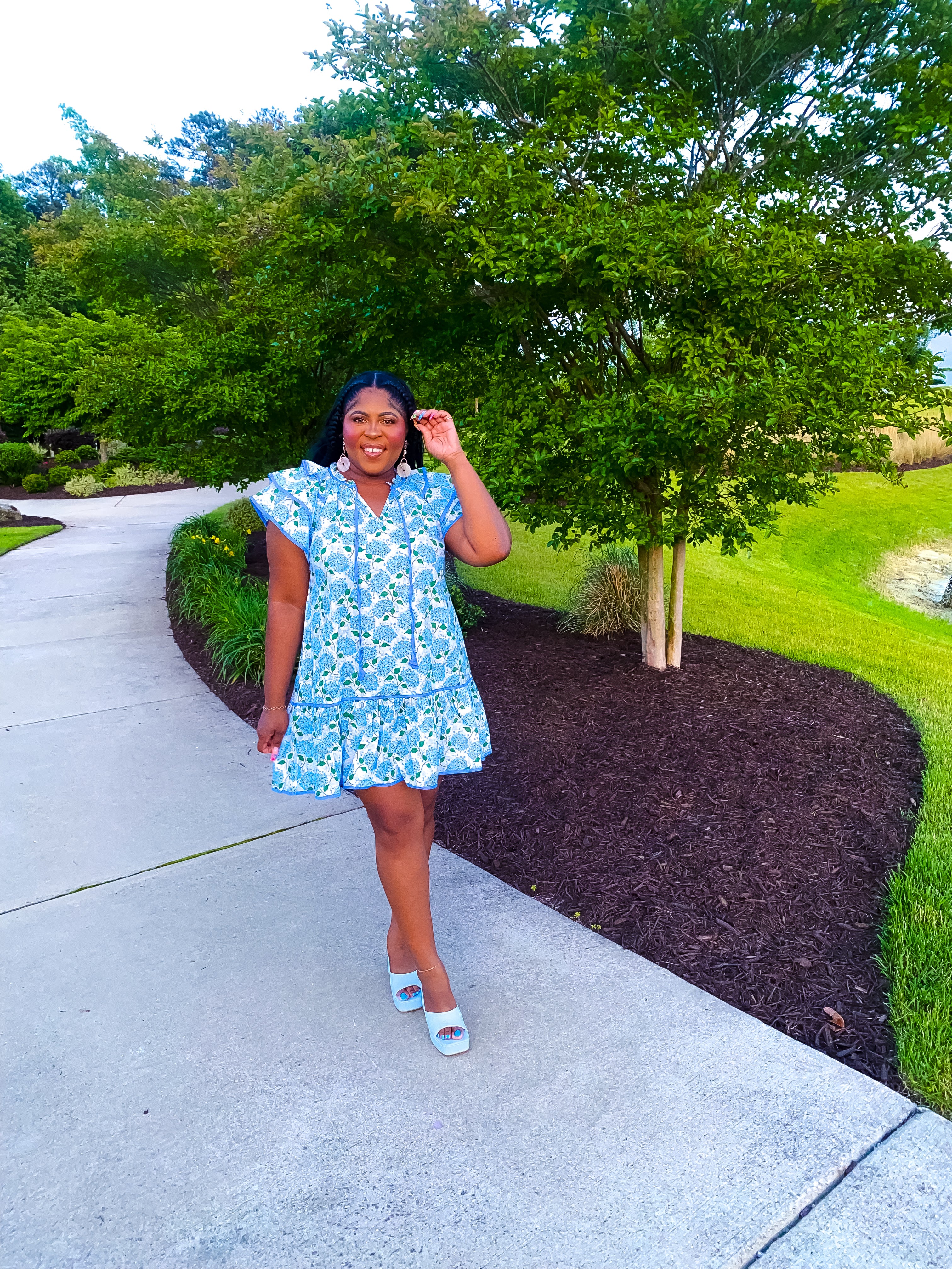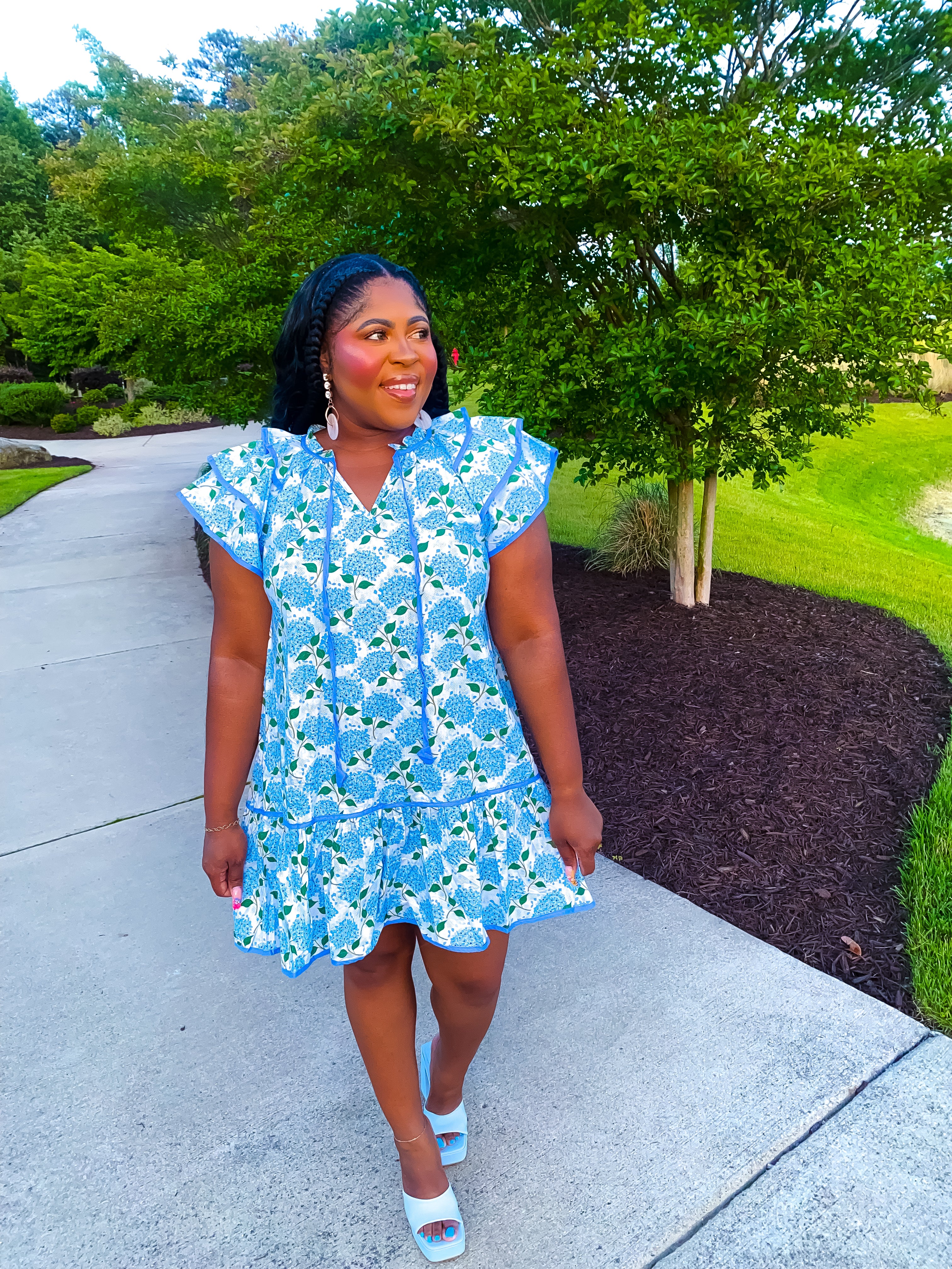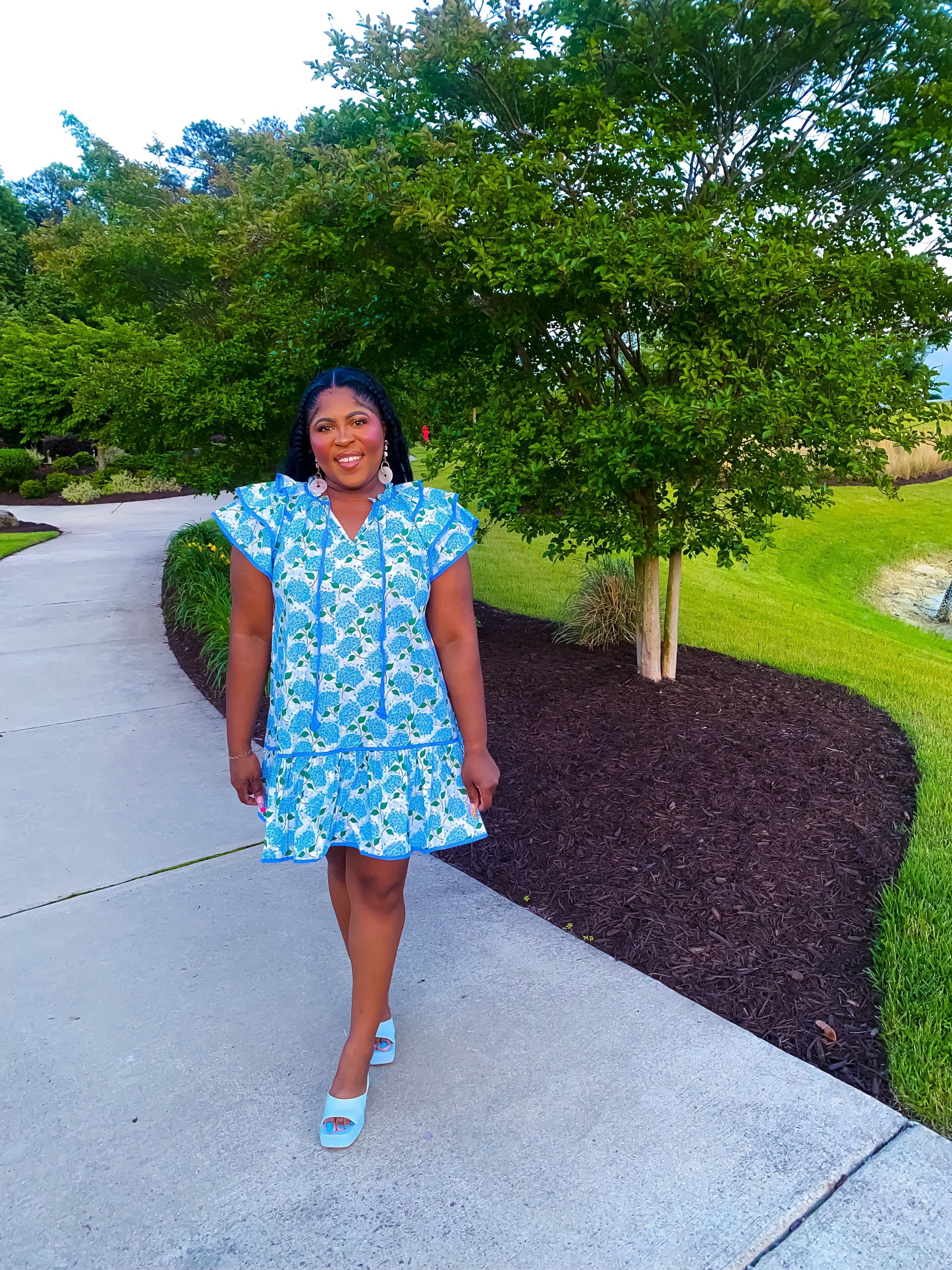 Hydrangea Tie Dress. Fun hydrangea blue pattern throughout with with blue v tie neckine. Figure flattering a line style for all body sizes/types. Flutter sleeves.