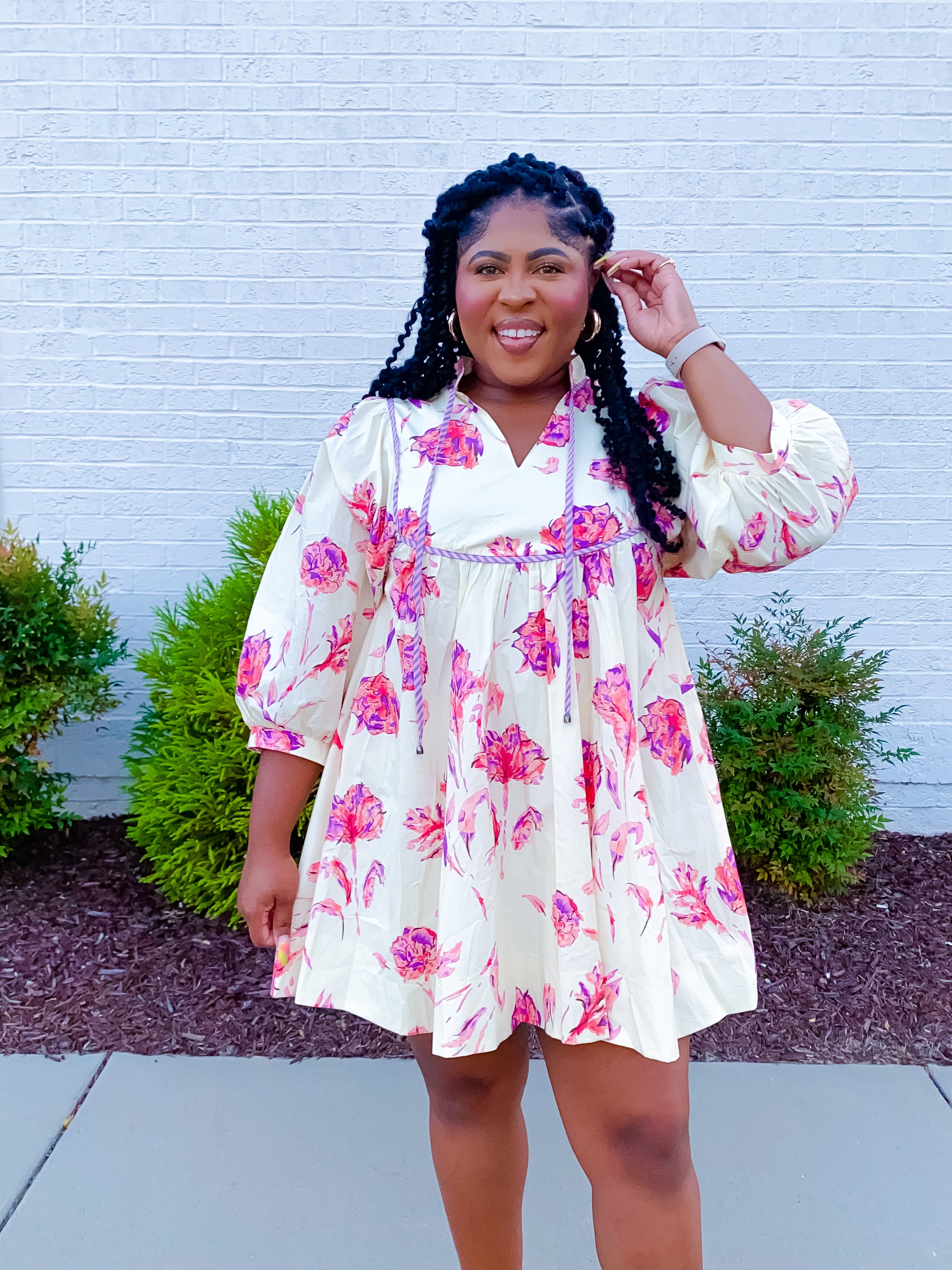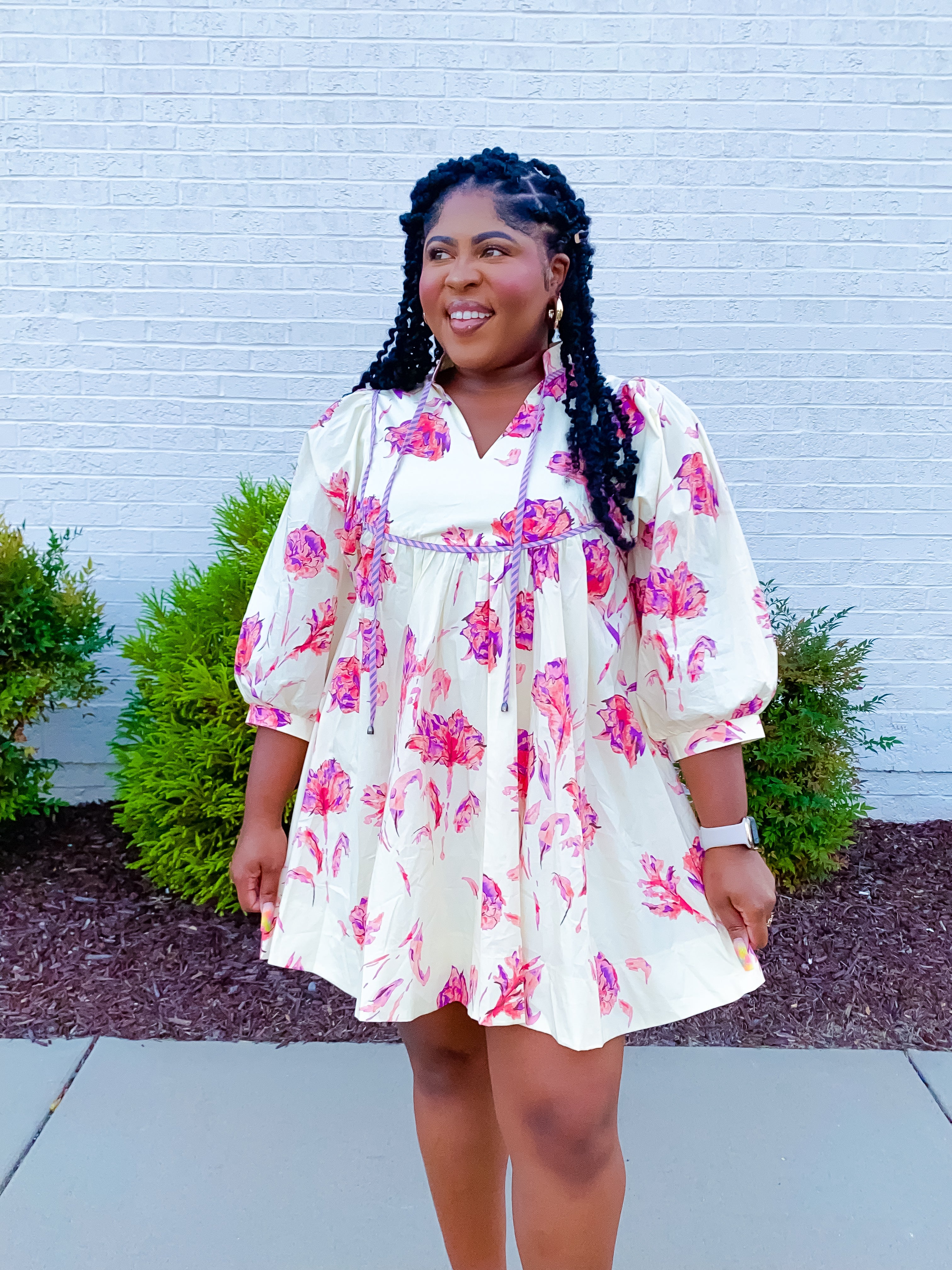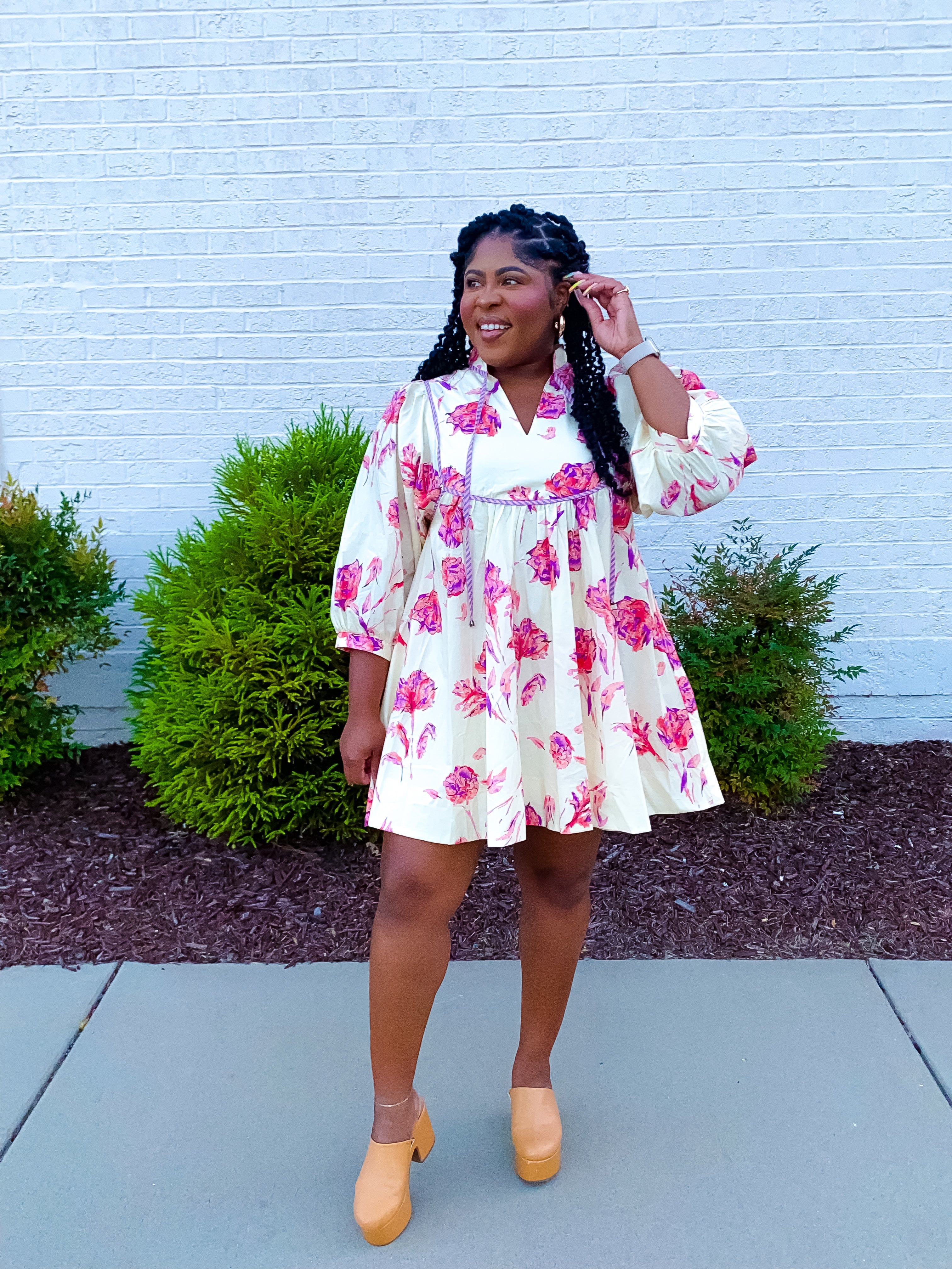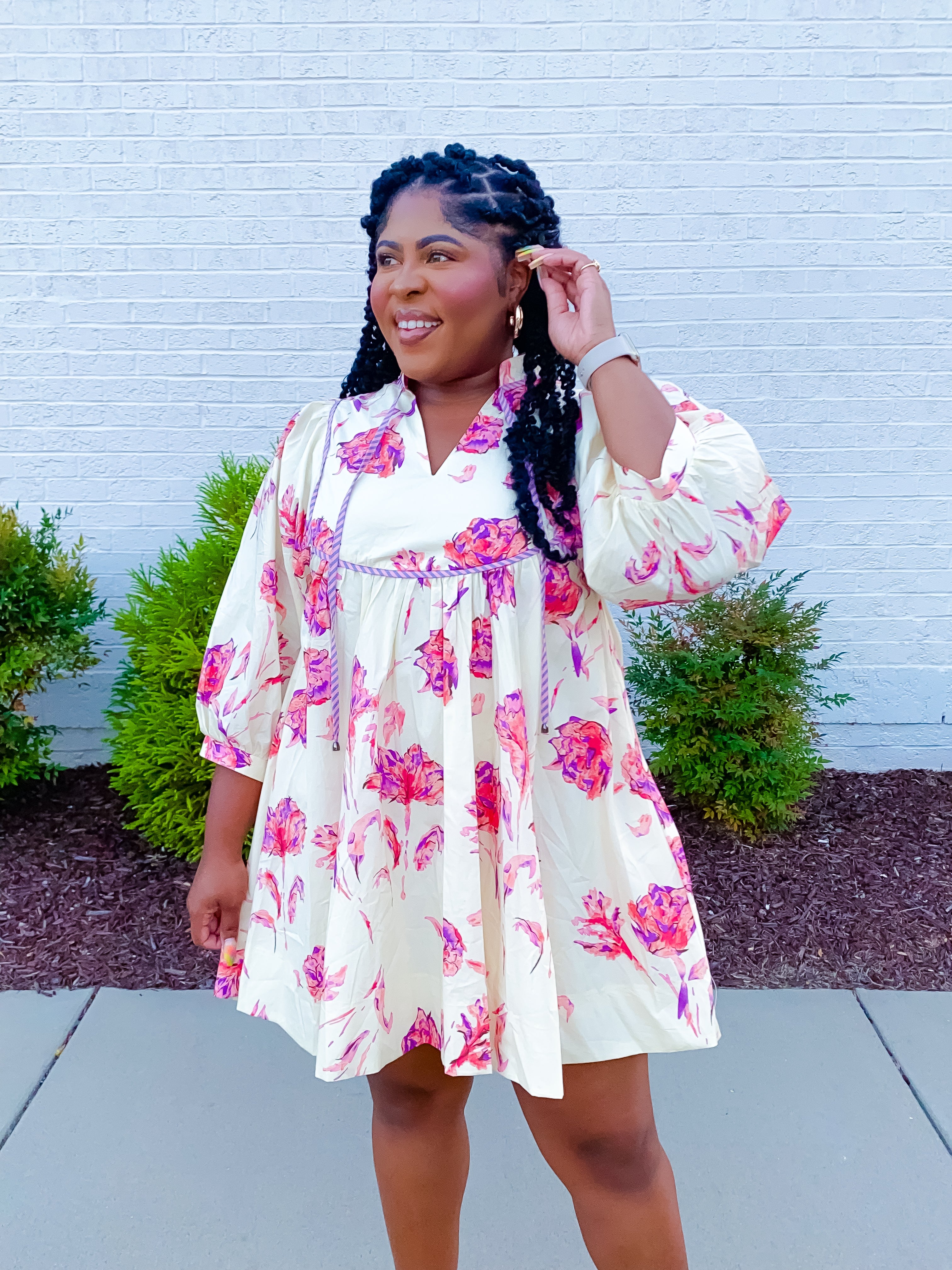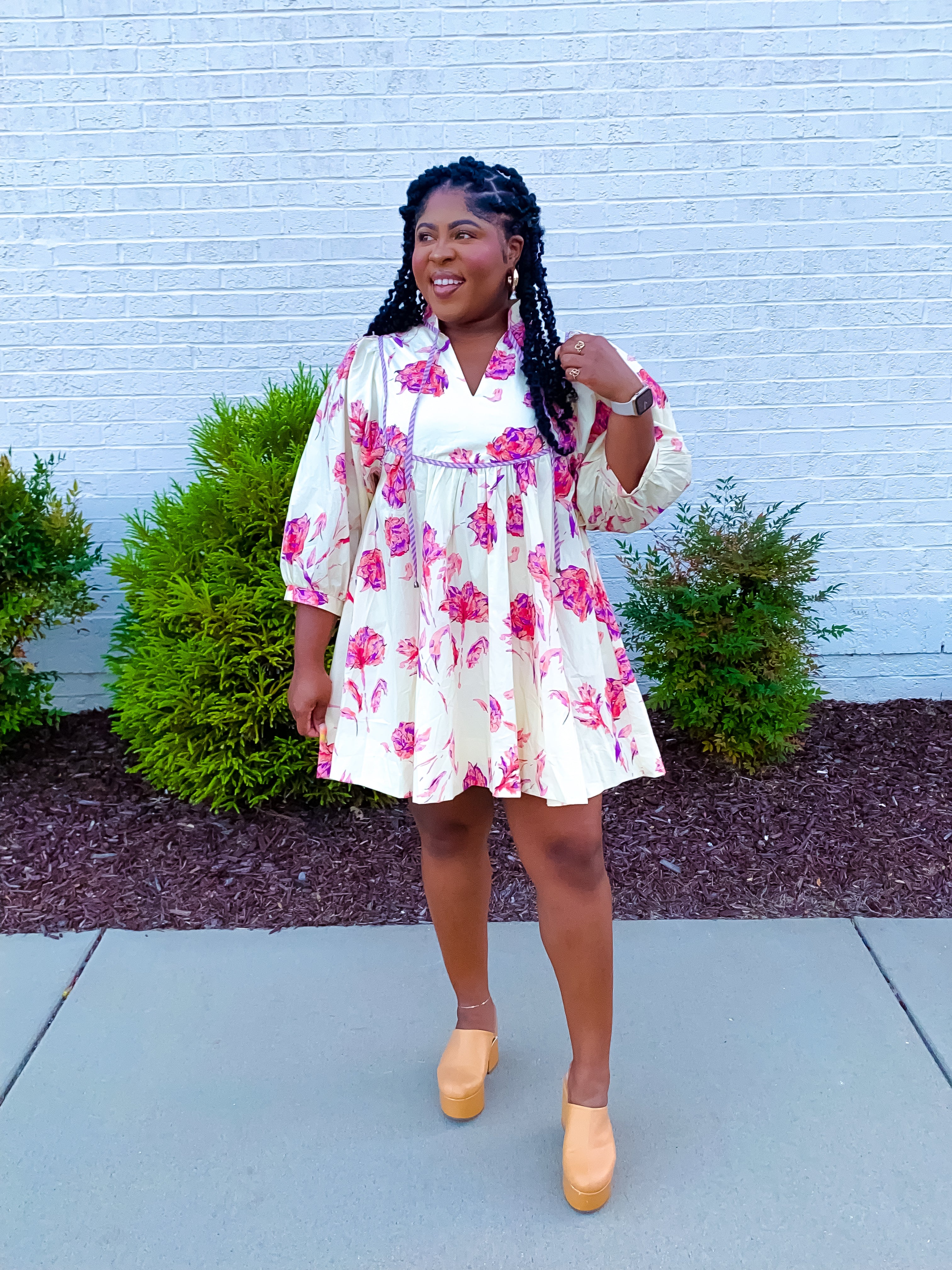Our Southern Charm Mini Dress is the made to turn heads. Beautiful floral pattern throughout with a mix of pink, red, purple, and brown on a cream background. V neckline with purple and pink piping throughout. 3/4 sleeve with pockets. Fully lined and lightweight. Great with mules or a cream bootie for fall.
