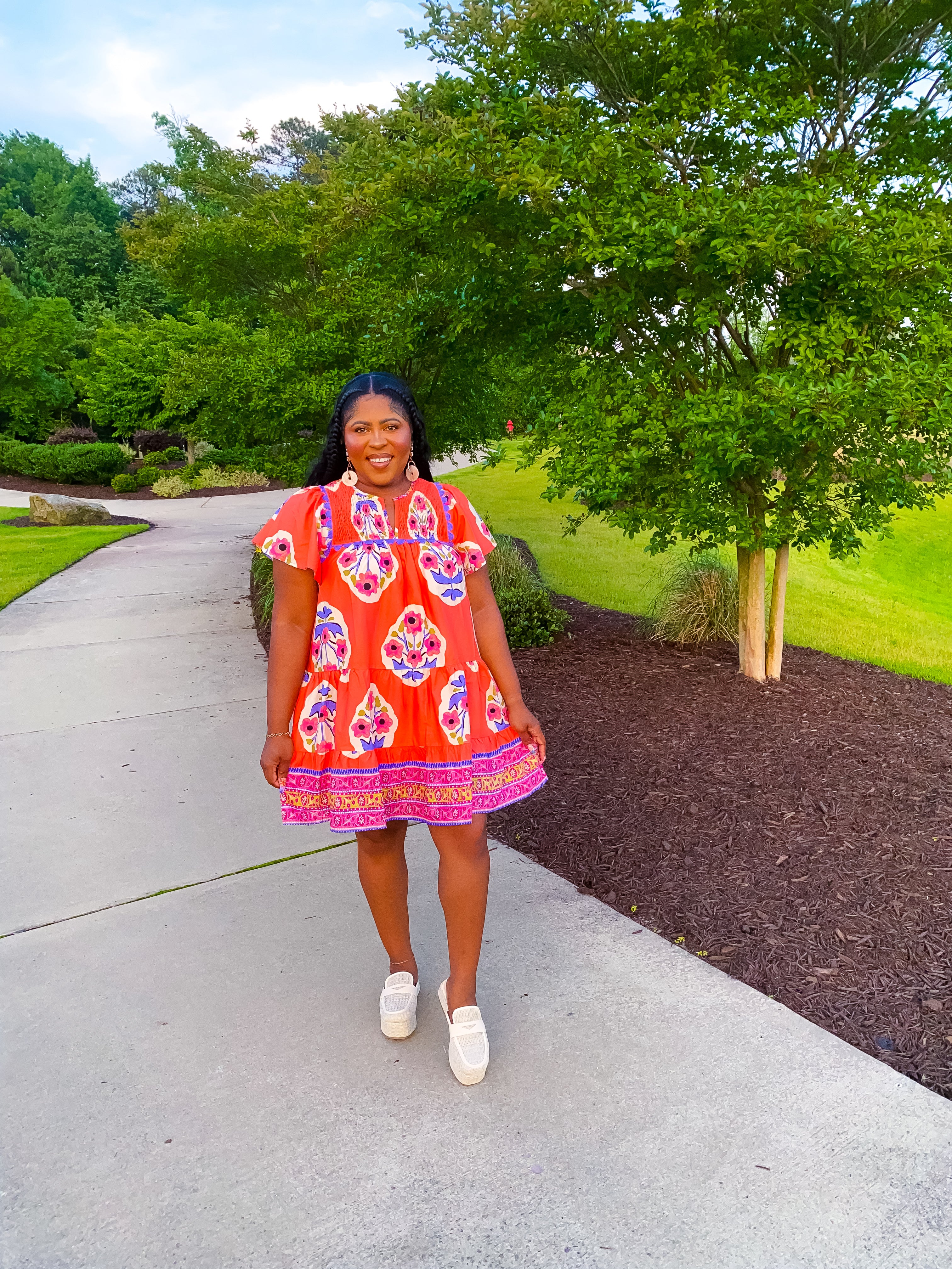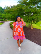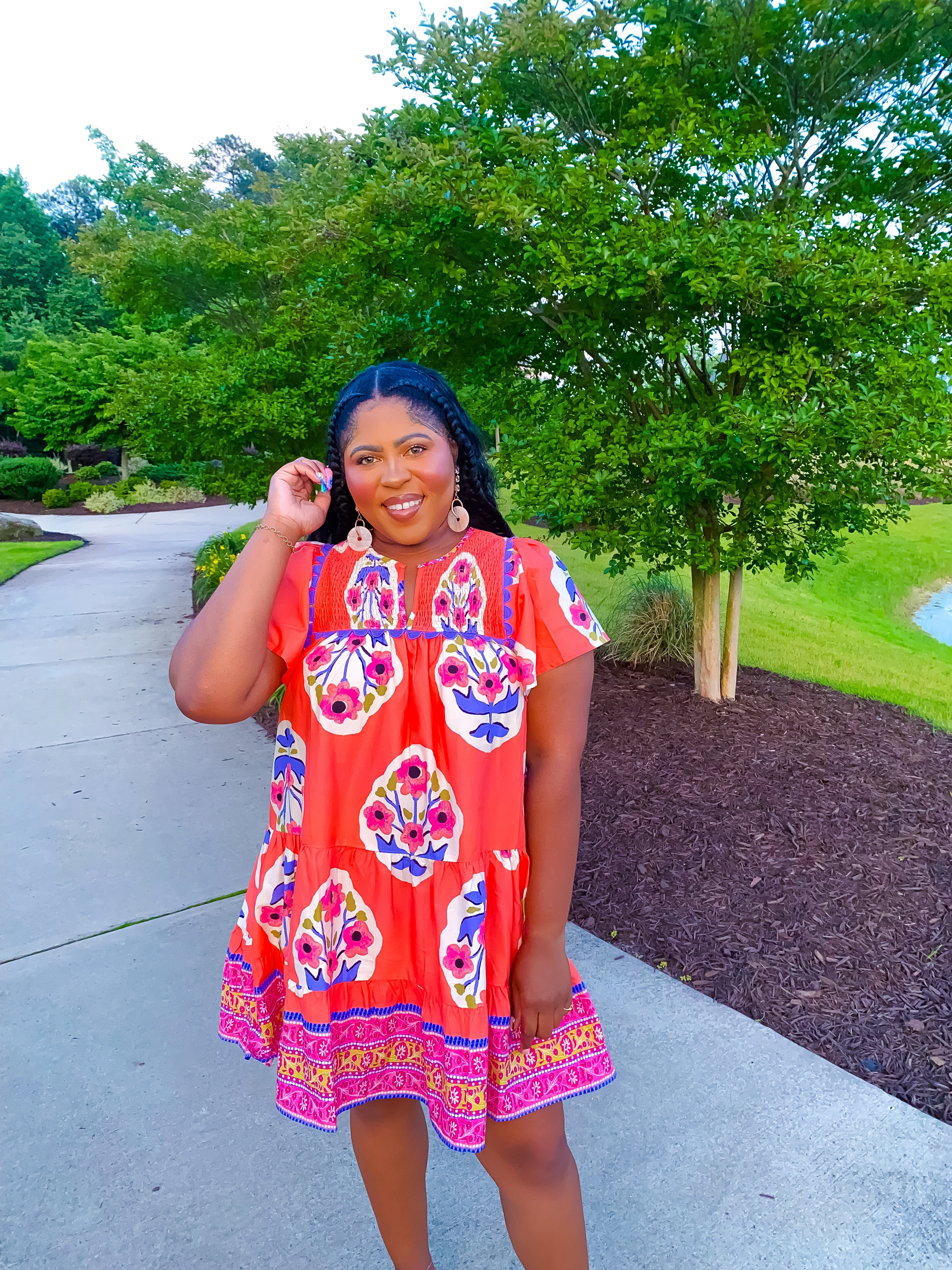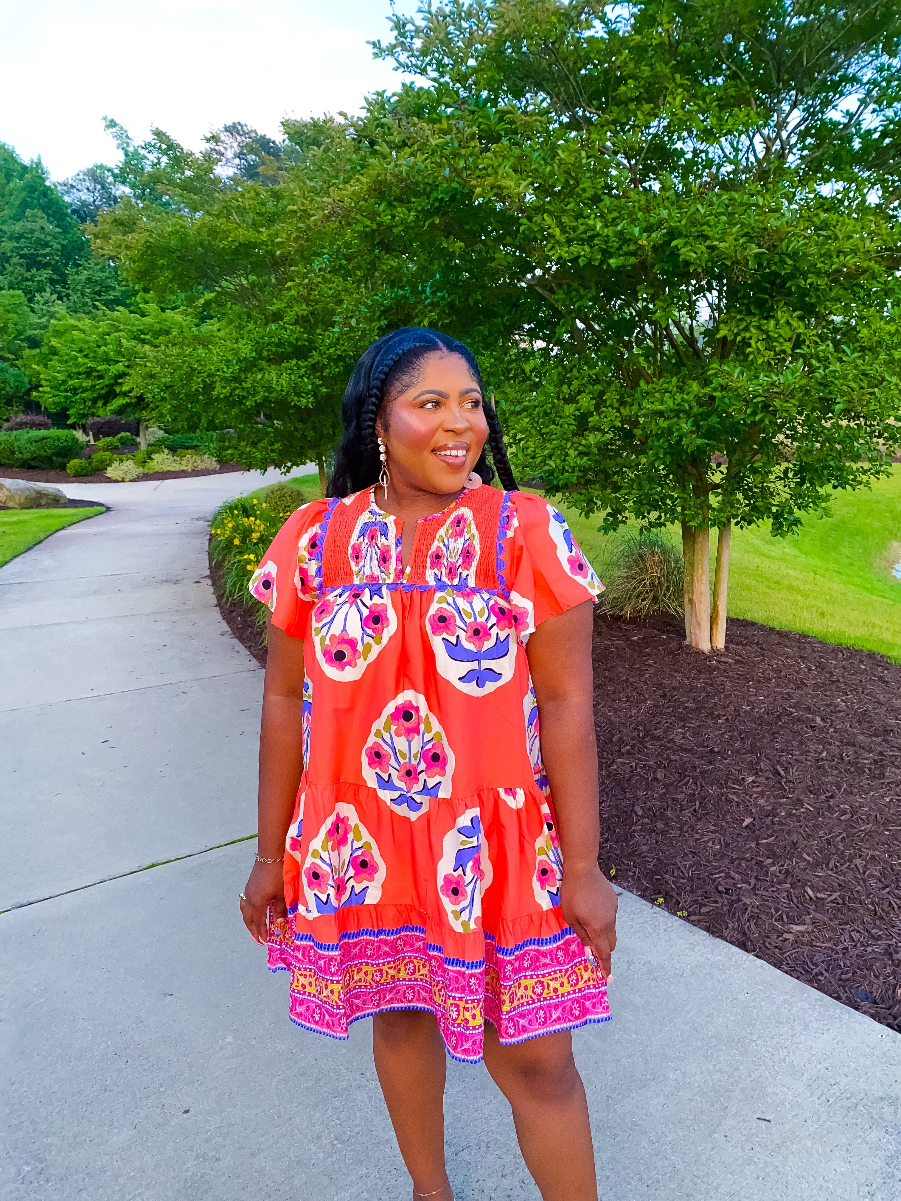 Bold and fun bouquet floral pattern dress in Coral. Split V neckline with smocked detail. Short flutter sleeve with scalloped trim. Tiered bottom with amazing floral border. Fully lined.