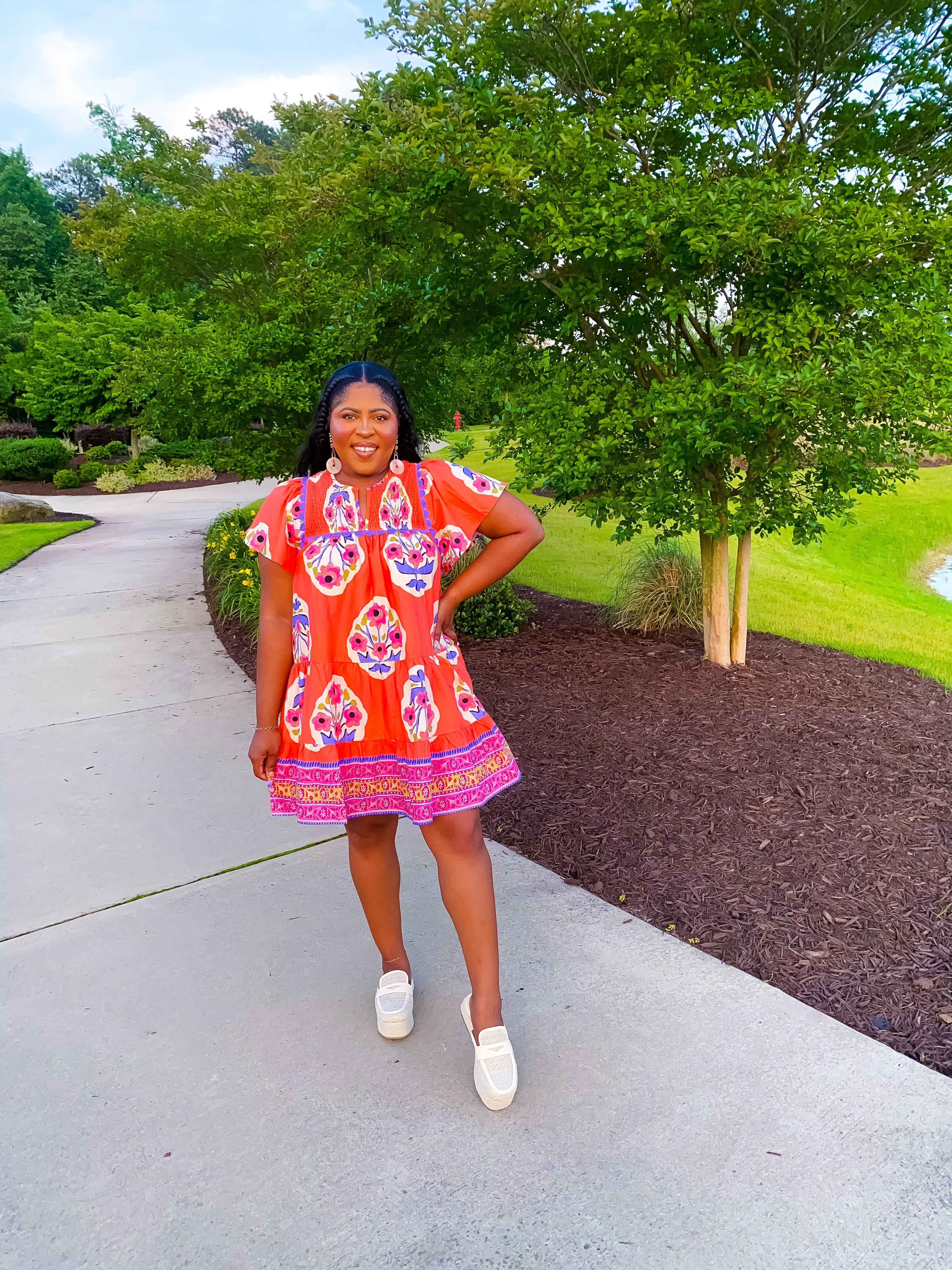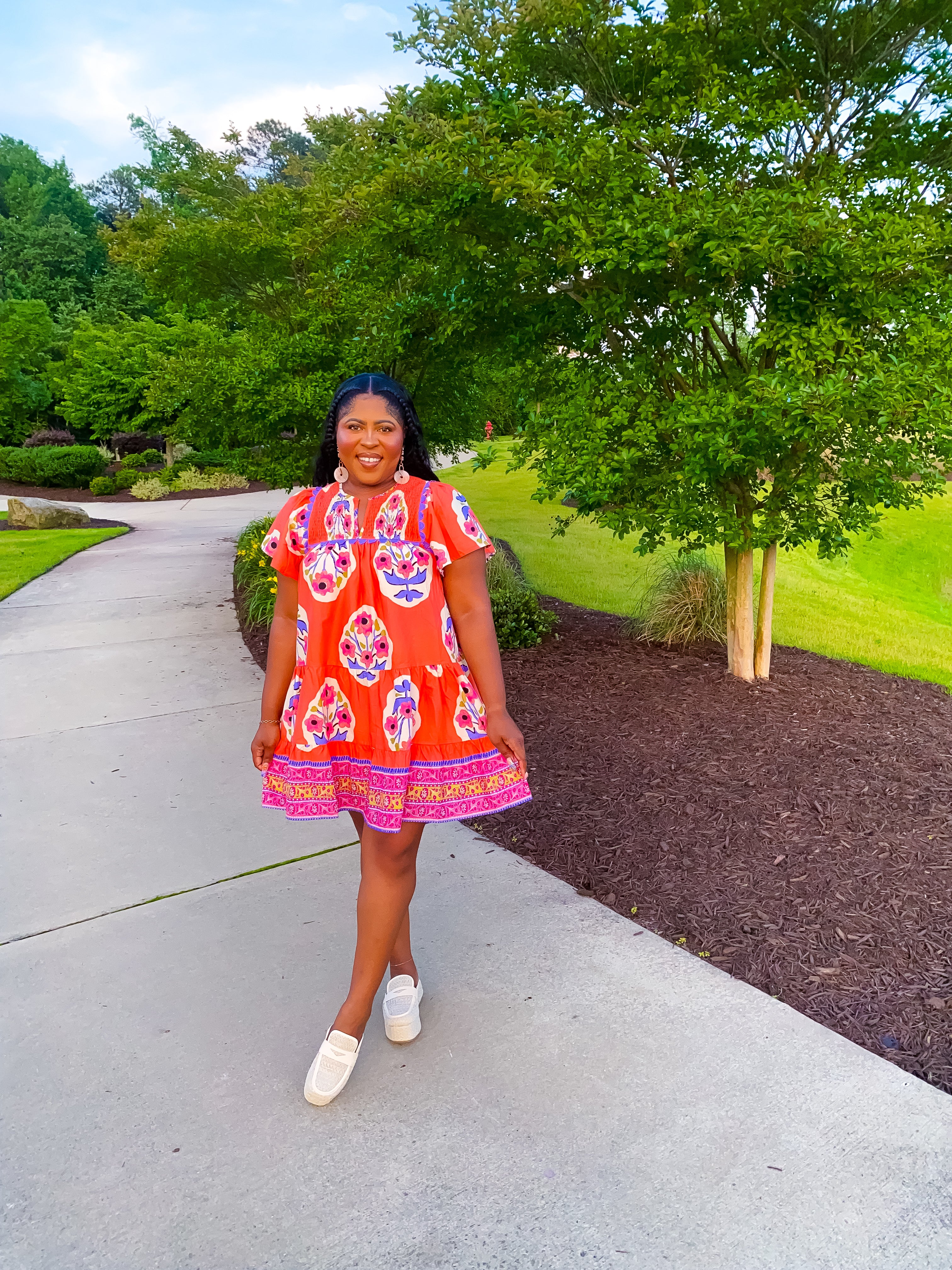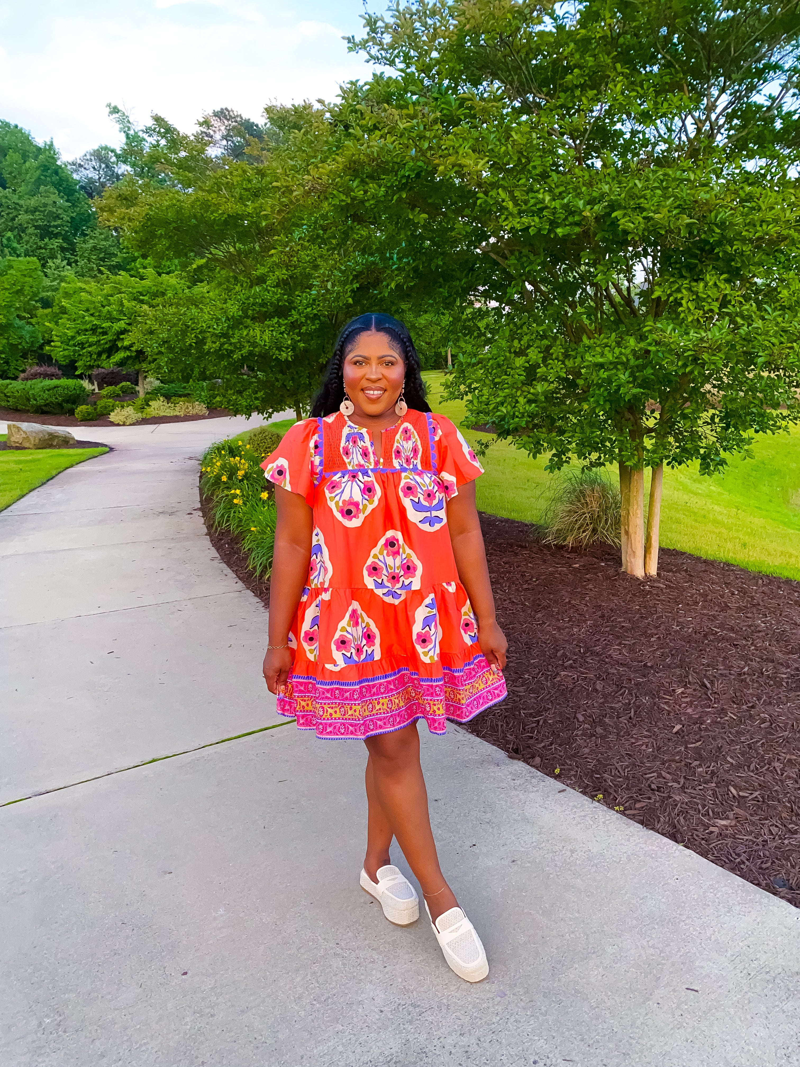Bold and fun bouquet floral pattern dress in Coral. Split V neckline with smocked detail. Short flutter sleeve with scalloped trim. Tiered bottom with amazing floral border. Fully lined.