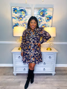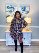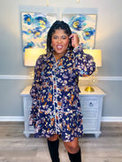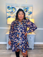 The Bliss Dress is a favorite. Stunning floral detail pattern on a black background. Button down front with a intricate scalloped trim. Collar neckline with puff sleeves.
