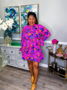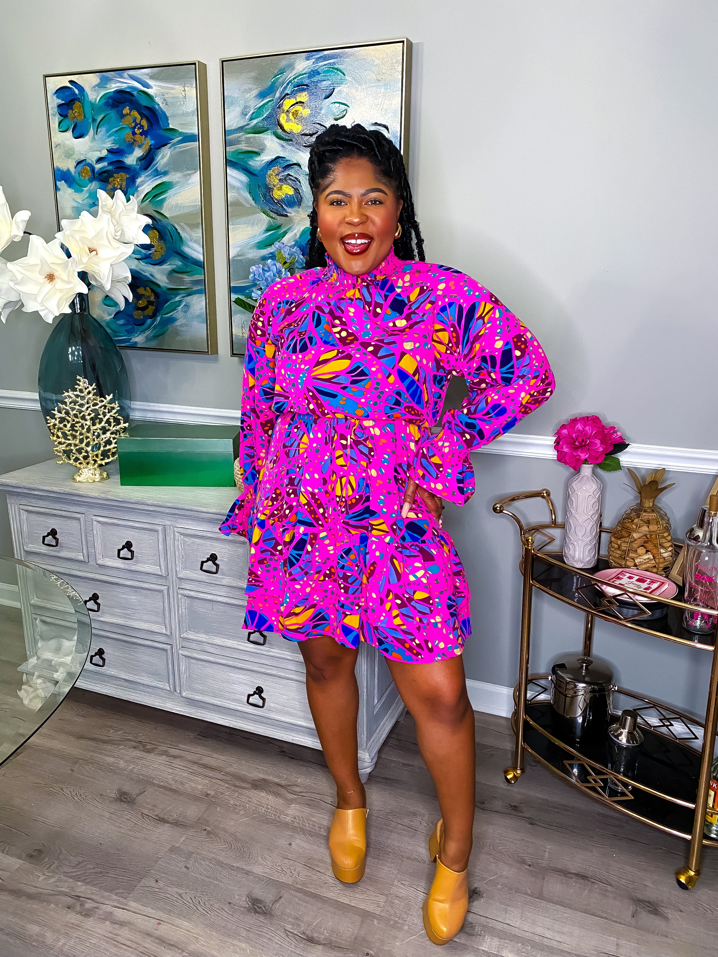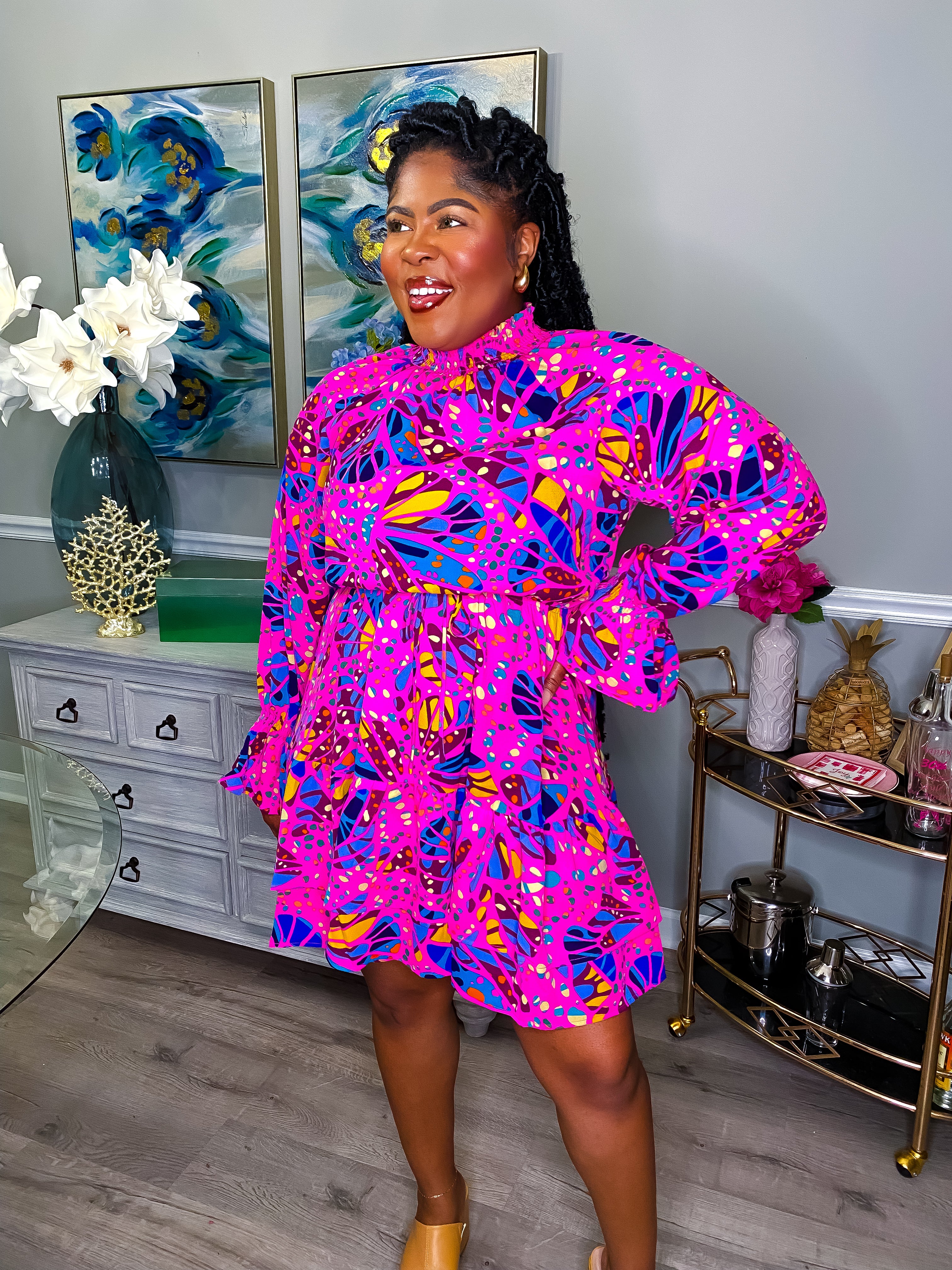 Gorgeous, multi print mini dress with abstract butterfly pattern. Smocked, high neckline with two button back closure. Long puff sleeves with smocked waist. Tiered mini dress with ruffles. Generous fit.