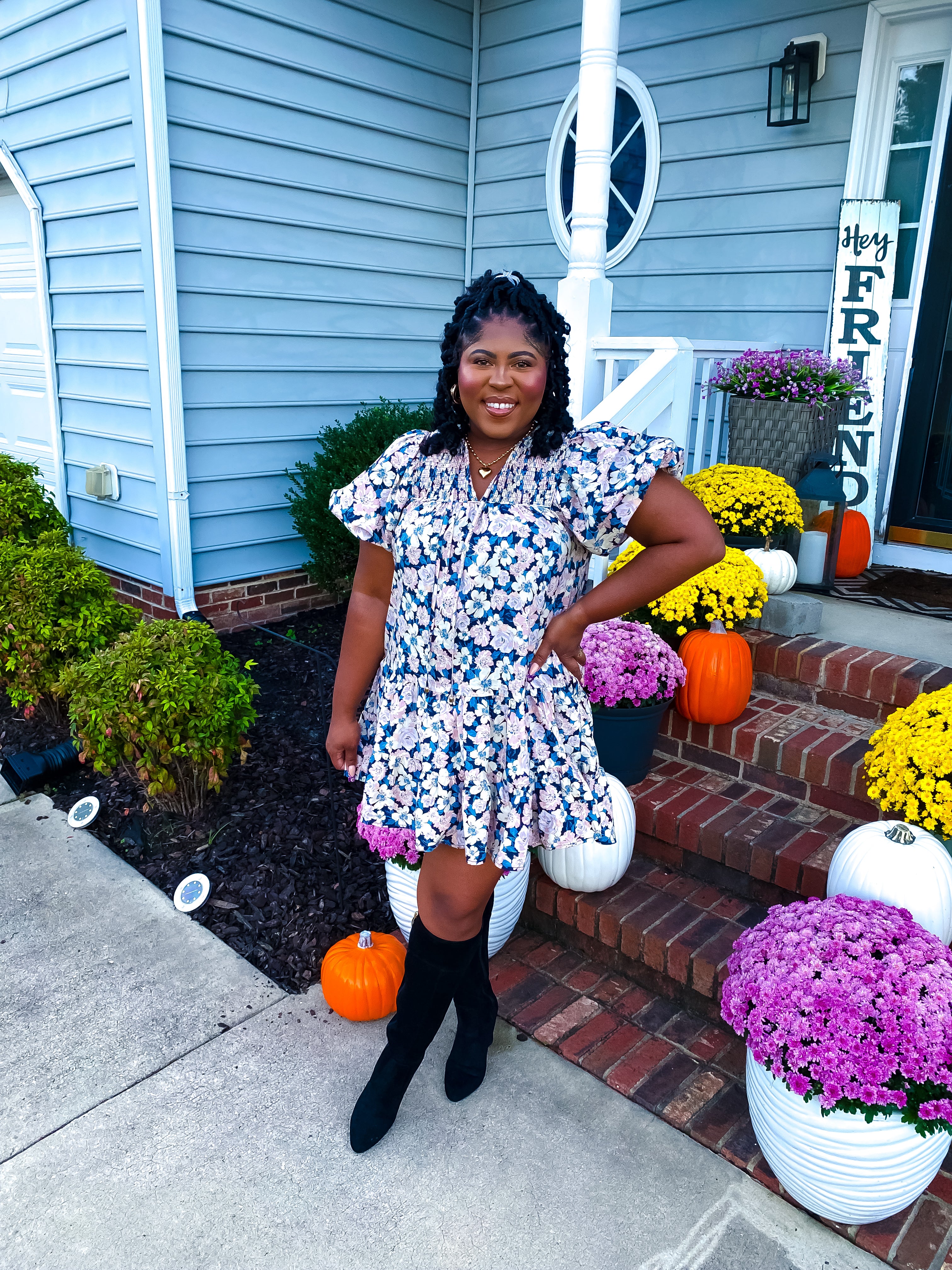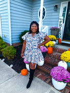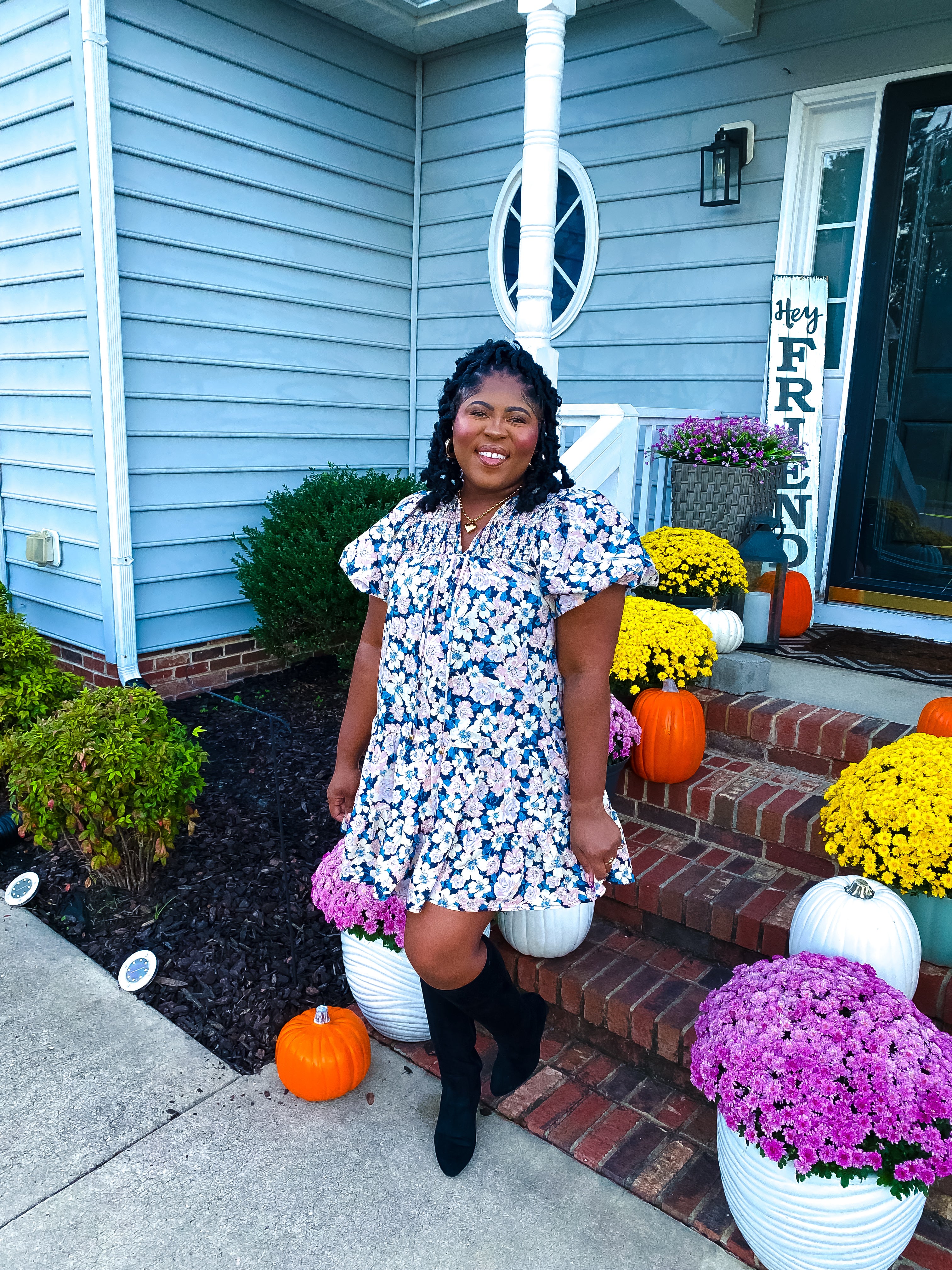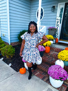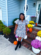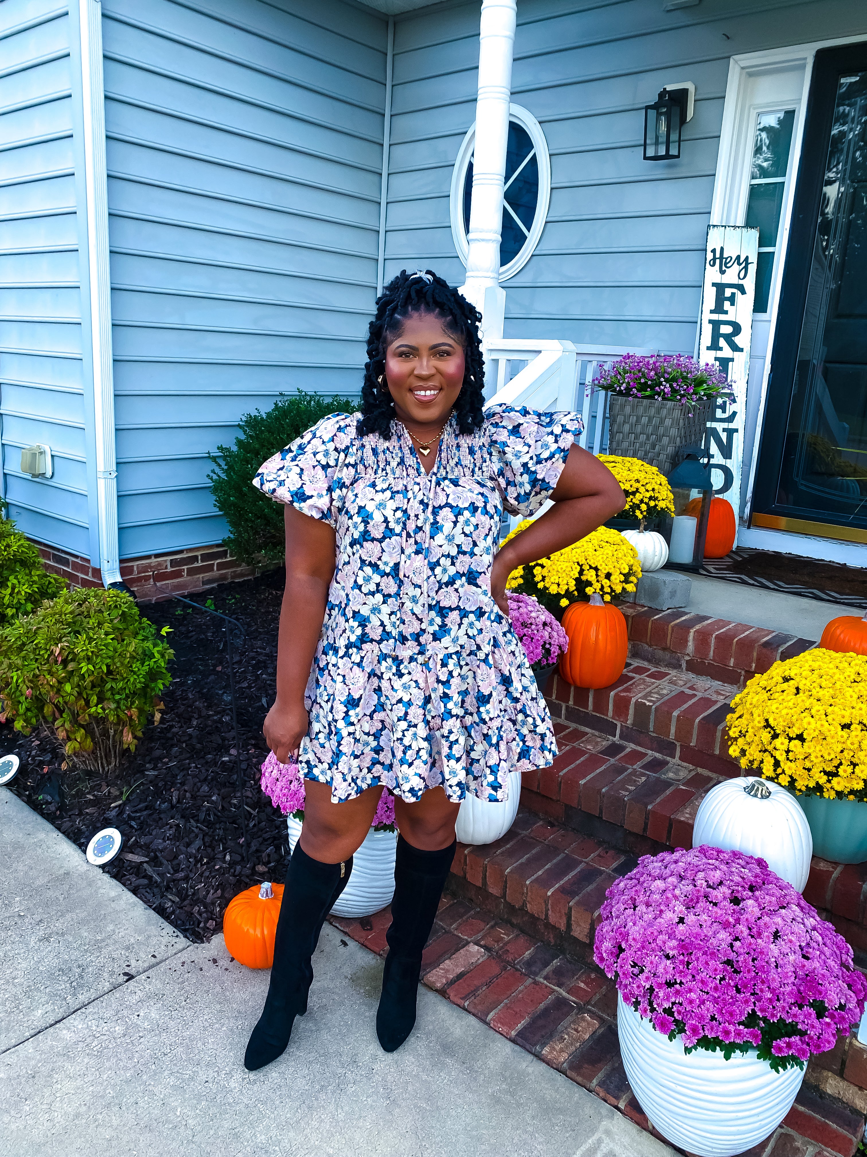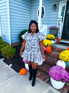 Floral print tiered mini dress on a charcoal blue background featuring self tie at neckline. Feminine smocked neckline. Fully lined with pockets. Tiered bottom. Puff elastic sleeve. Perfect dress for year-round, but perfect fall colors throughout. Would look amazing with tall white or black boots for fall. Sandals or mules for summer.