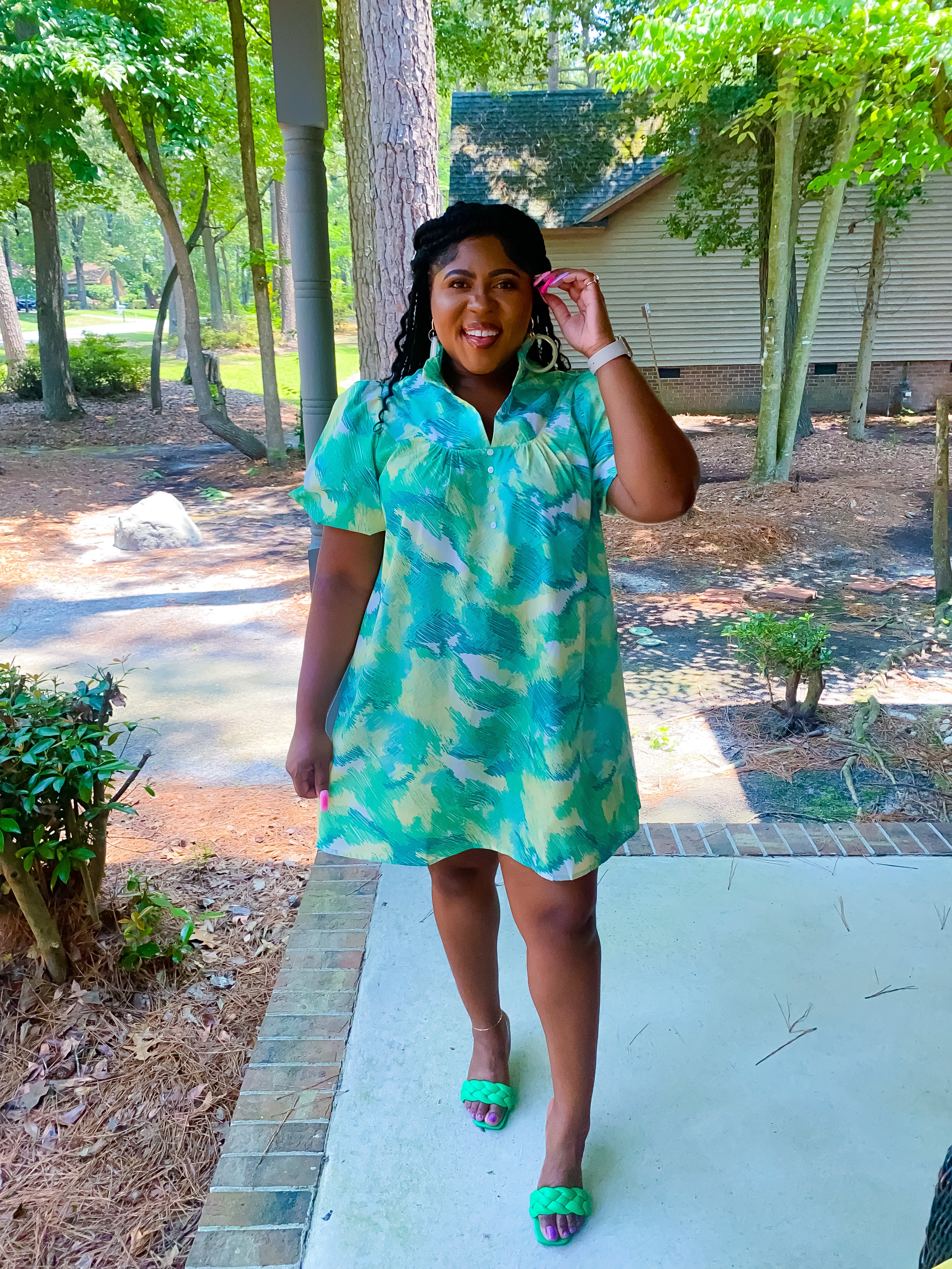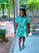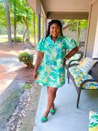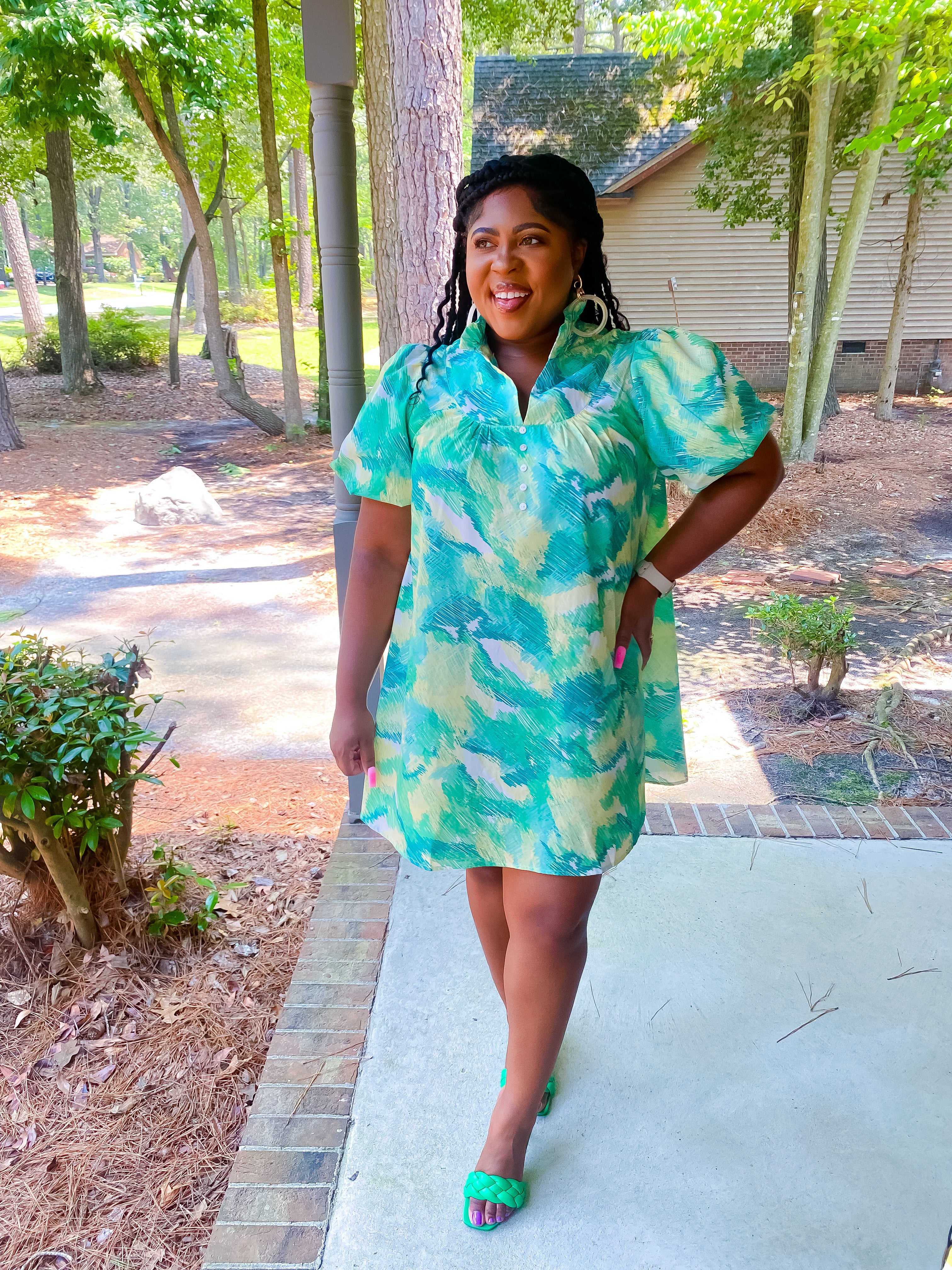 Effortless style and bright colors meet with our Green with Envy Mini Dress. Short puff v neckline mini dress with ruffle details popped collar. Pretty irredescent color center button detail at bust. Side pockets. Lightweight fabric with gorgeous mixed multi green brushstroke pattern throughout.