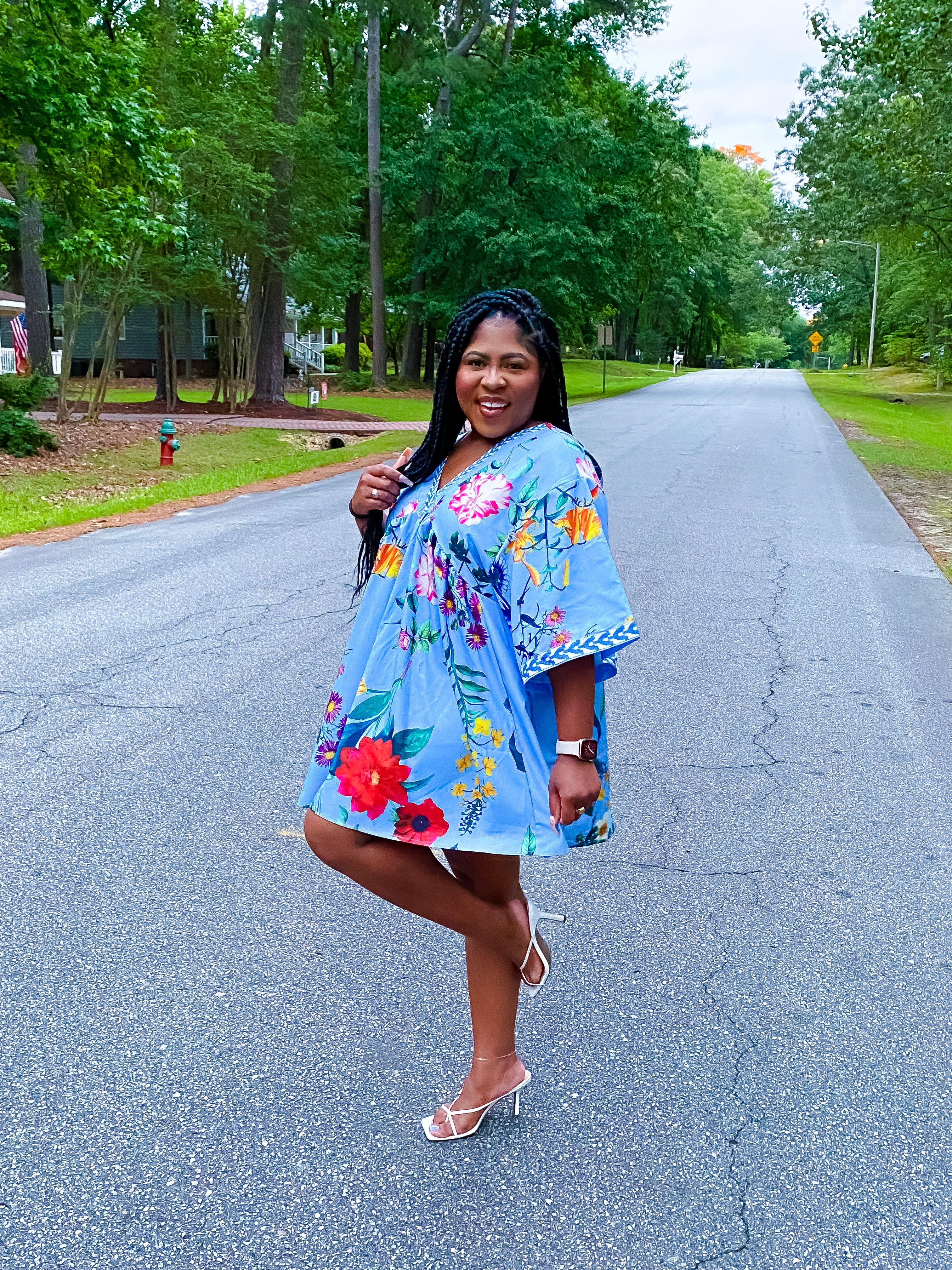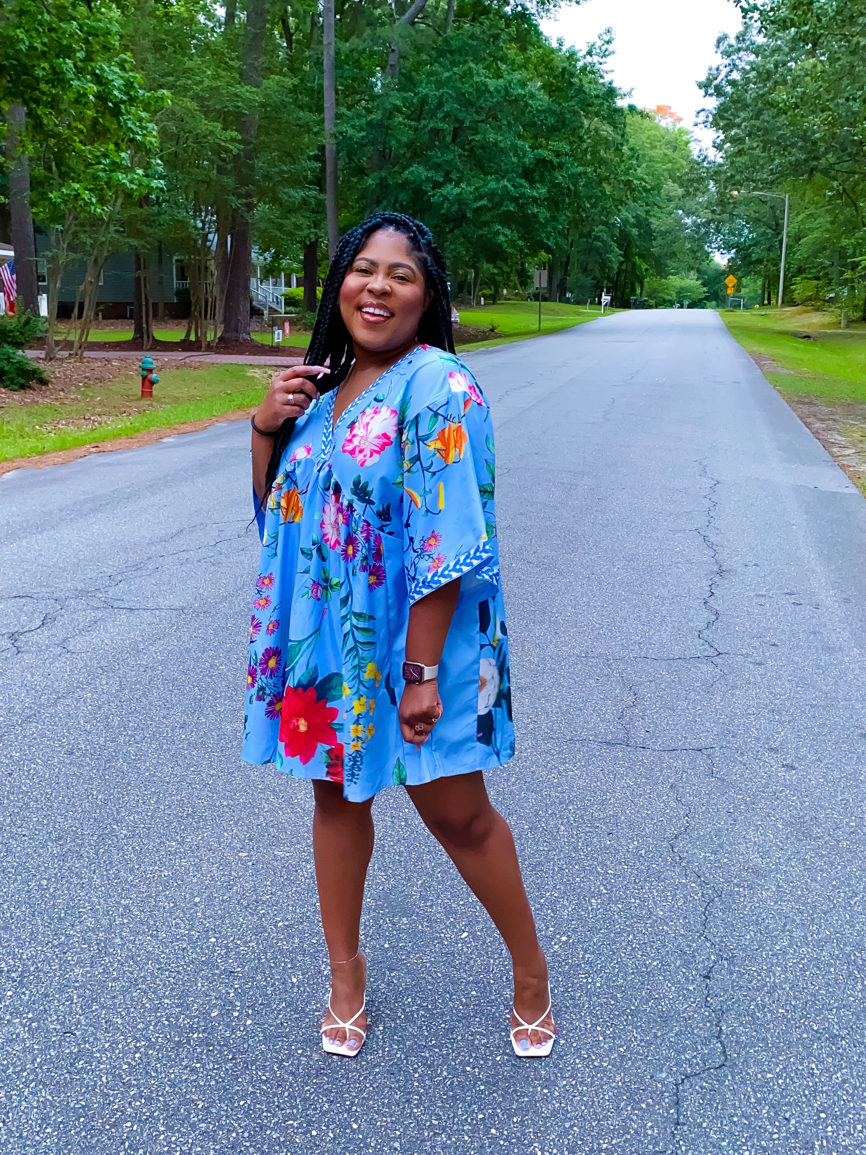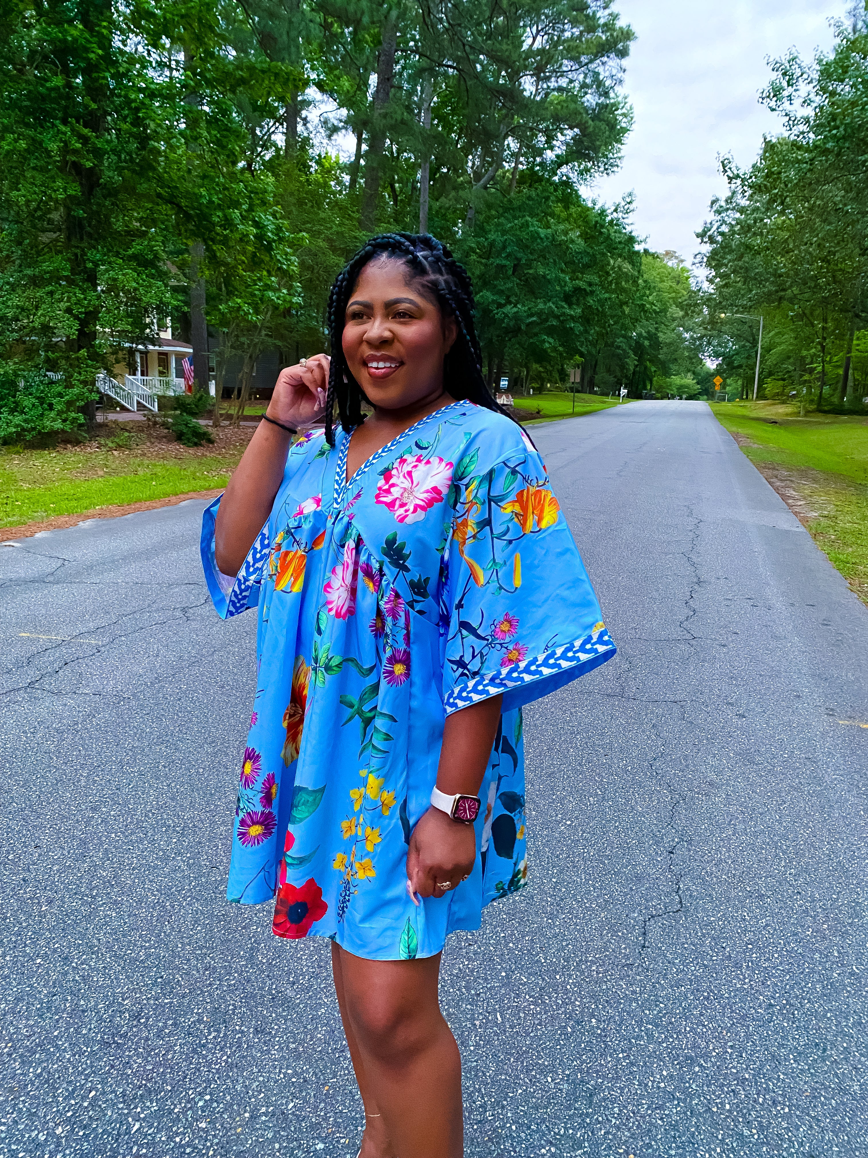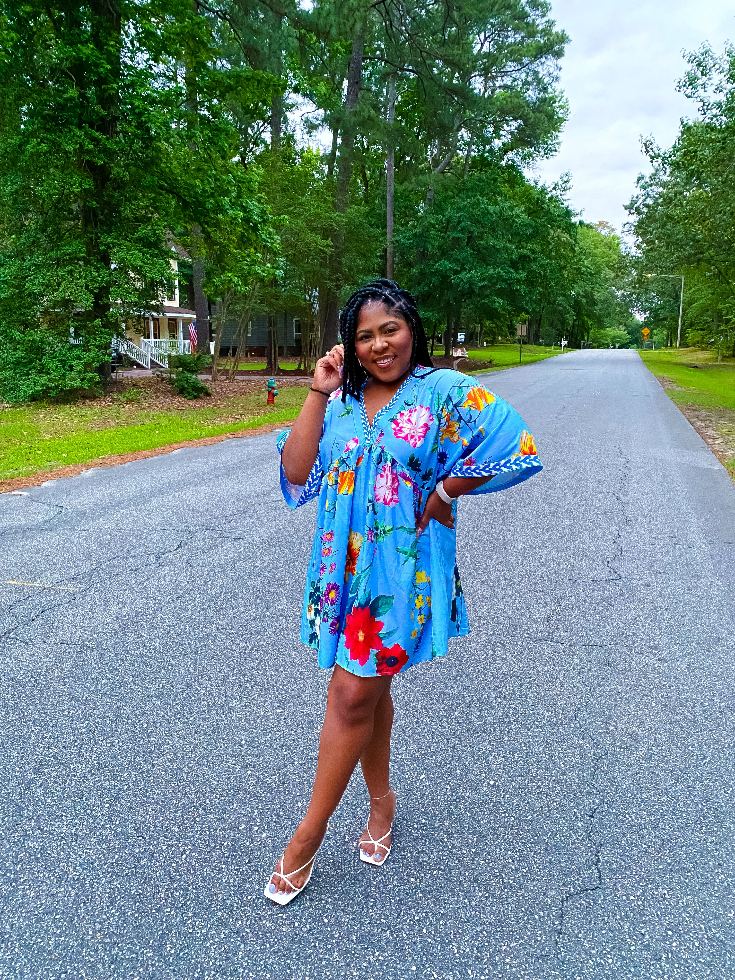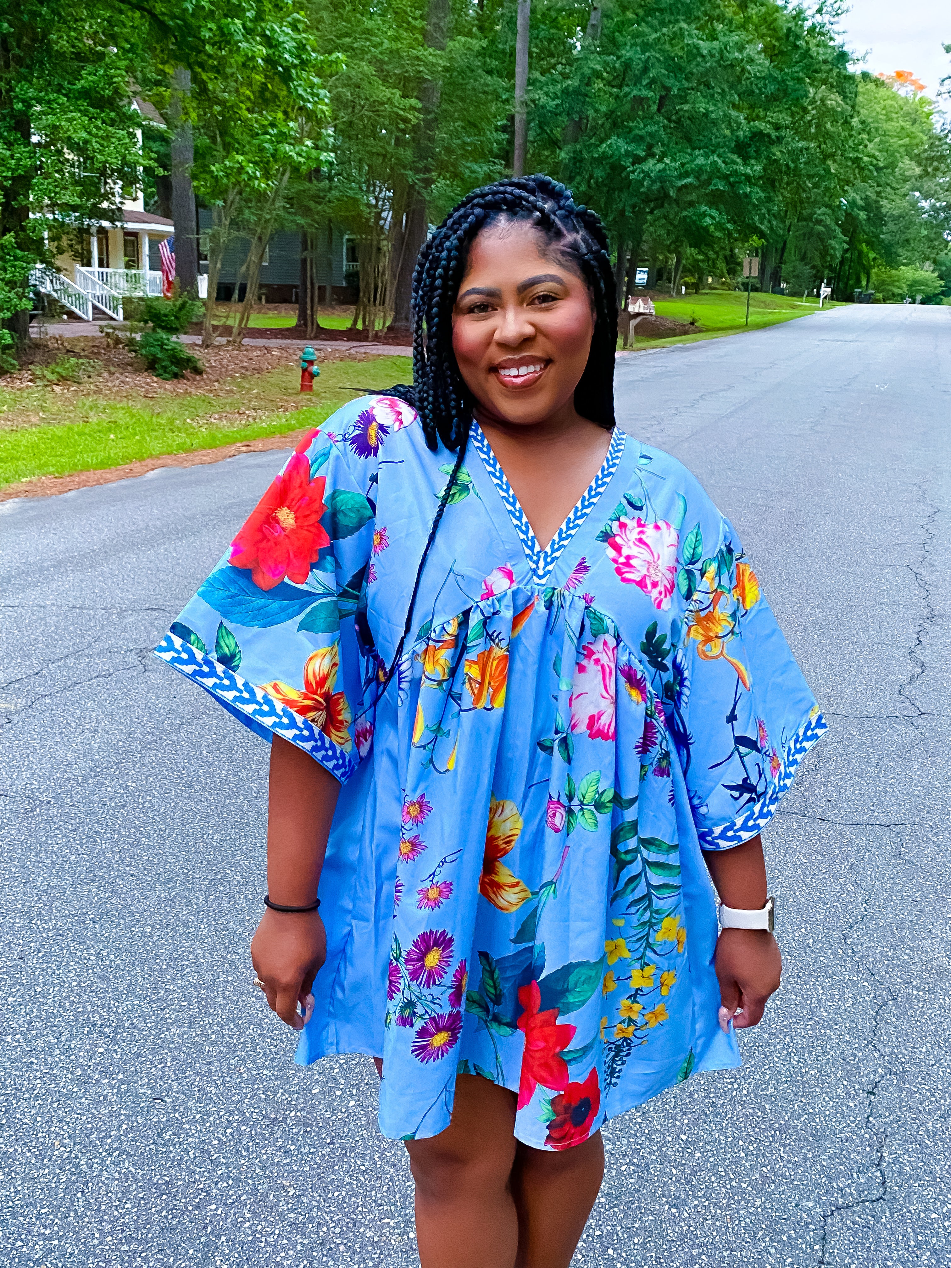 Bring on the Summer Flowers in our Island Escape Dress. Lovely floral print dress with v neckline detail. Blue background the color of the ocean. Grab her up to wear all Summer long!