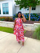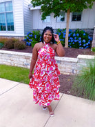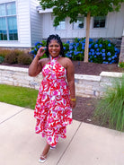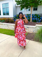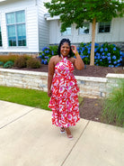 Bold red floral pattern. Halter crisscross neckline with red stripe trim throughout. Tiered maxi dress. Hint of pink. Fully lined.