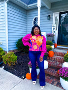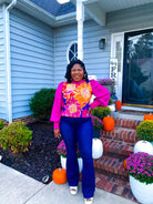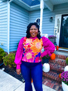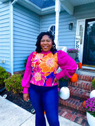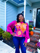 Unique floral print knitted top. Knitted bodice with contrasting long satin puff sleeves. Ribbed mock neck, sleeve, and waist detail. Super soft lightweight fabric. Stunning and rich magenta background with flower print in shades of blue, red, and light orange. Paired with our Charlotte Bell Bottoms.