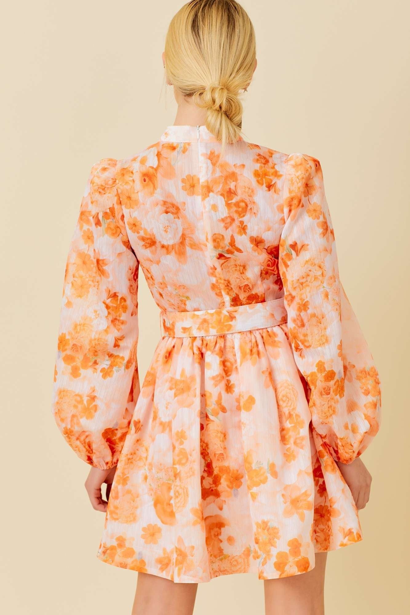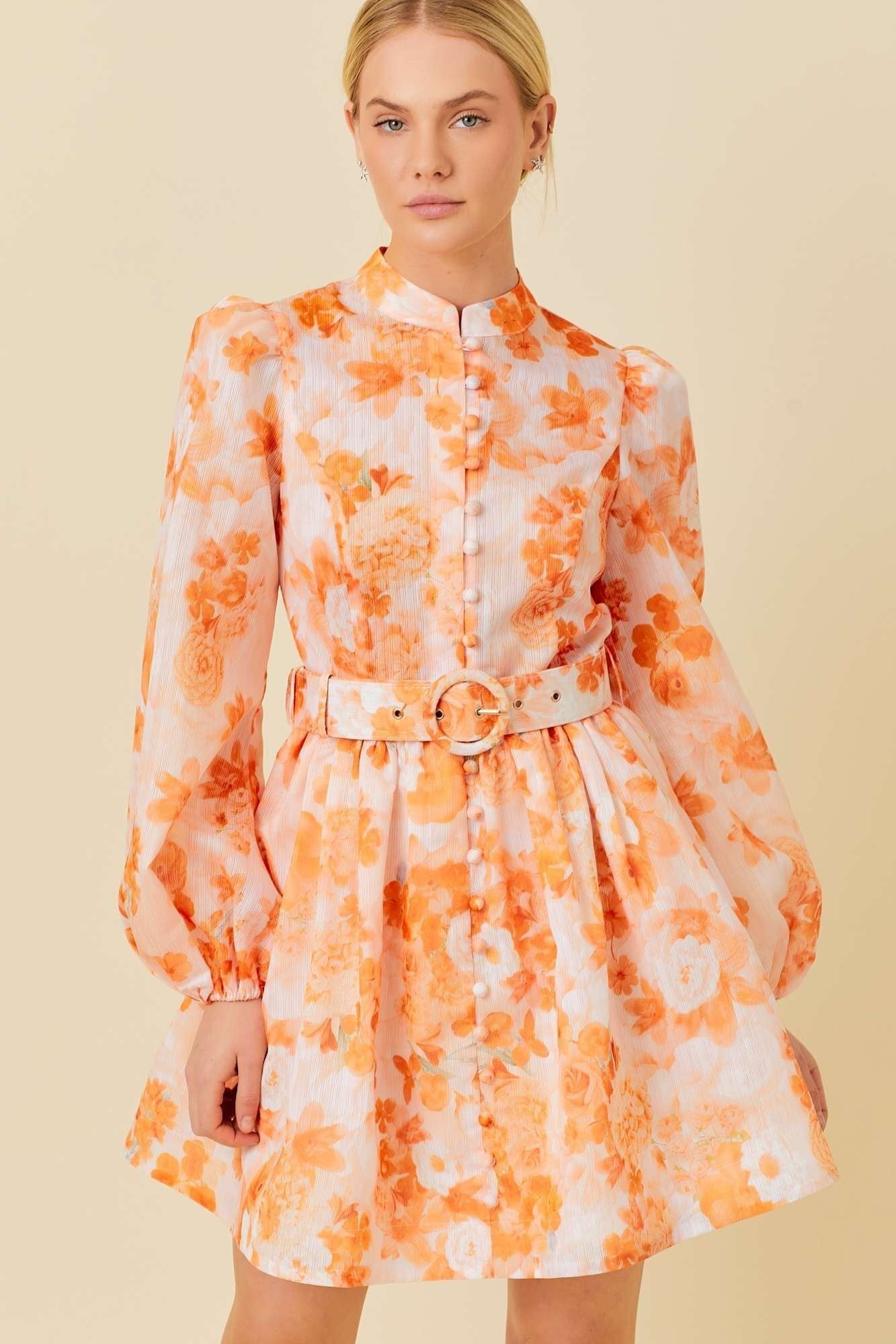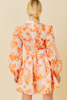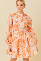 Designer inspired orange and white floral print belted mini dress. Puff, long sleeve with elastic wrist. Flare skirt. Back zipper. Functional, front button. Lightweight, breathable fabric. Lined from waist down.