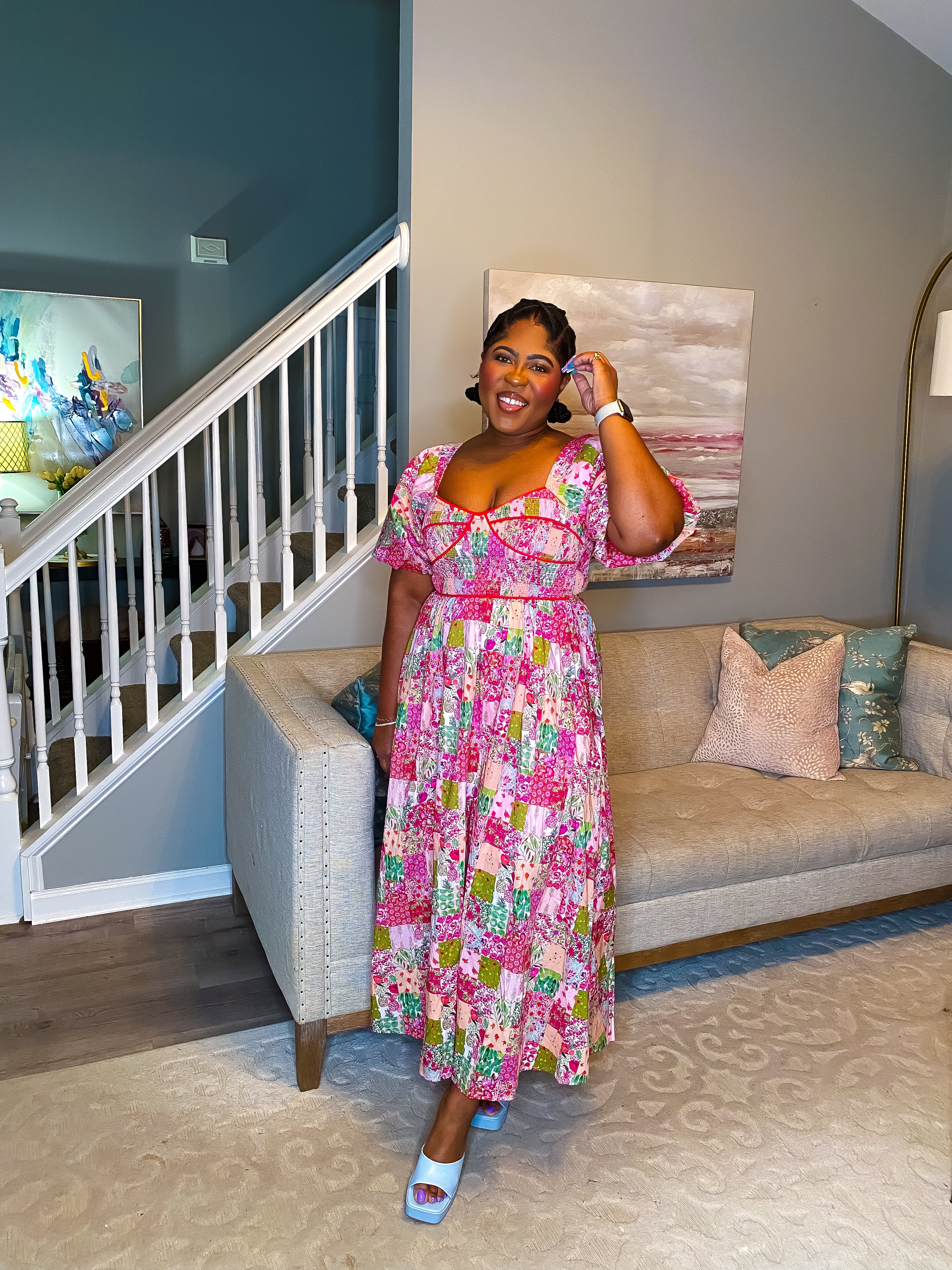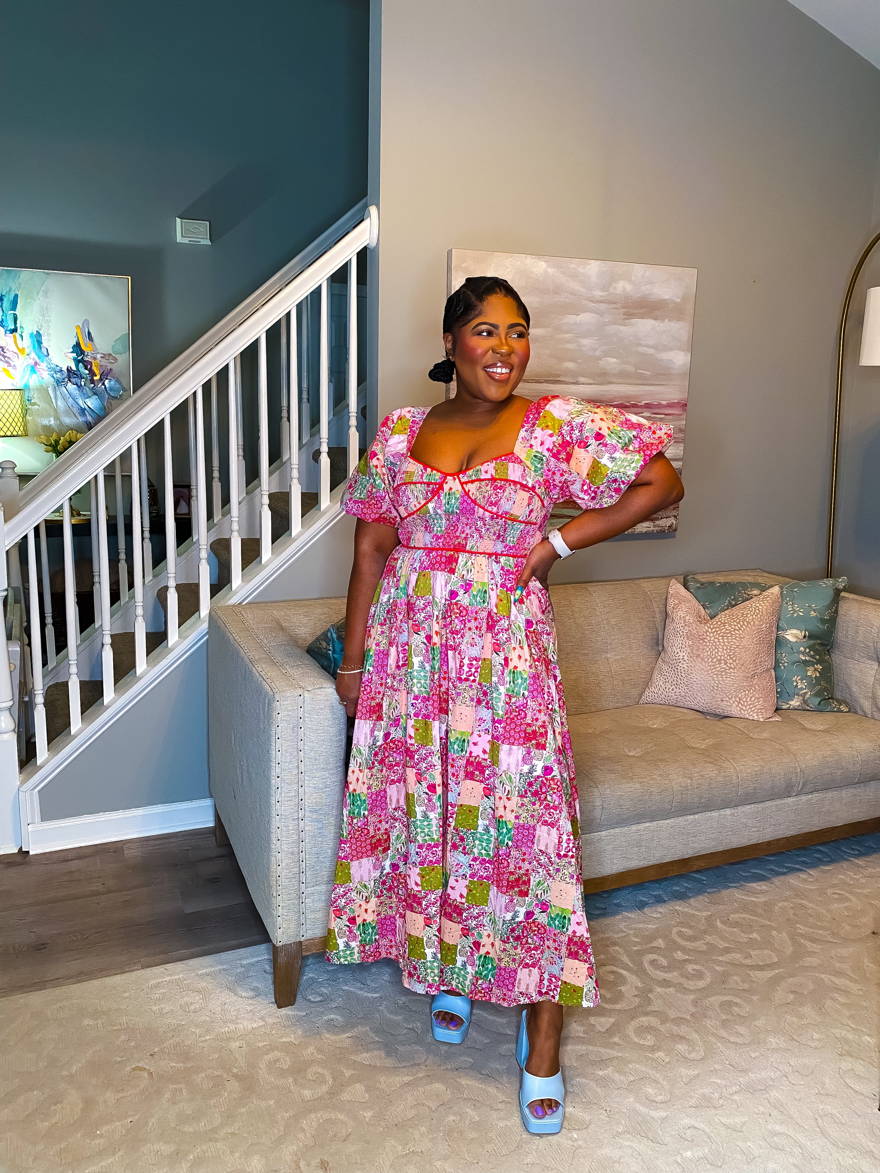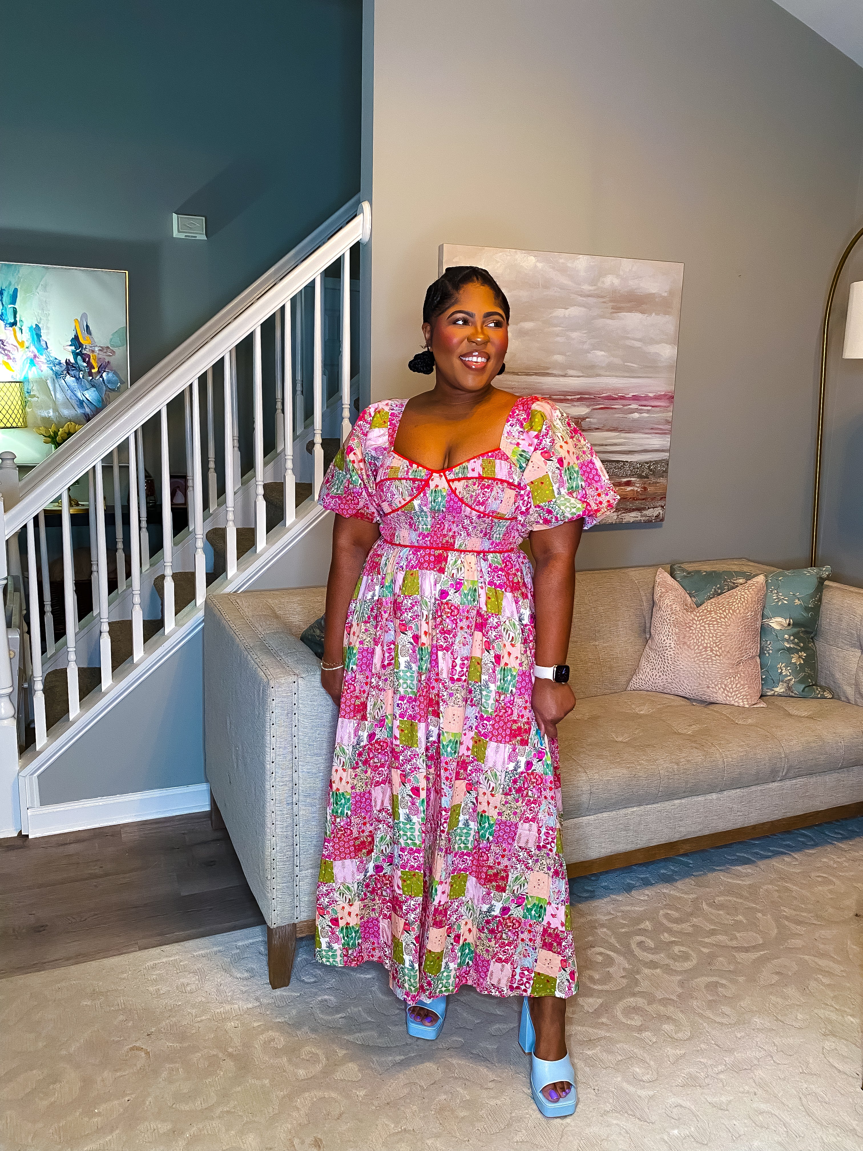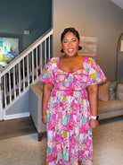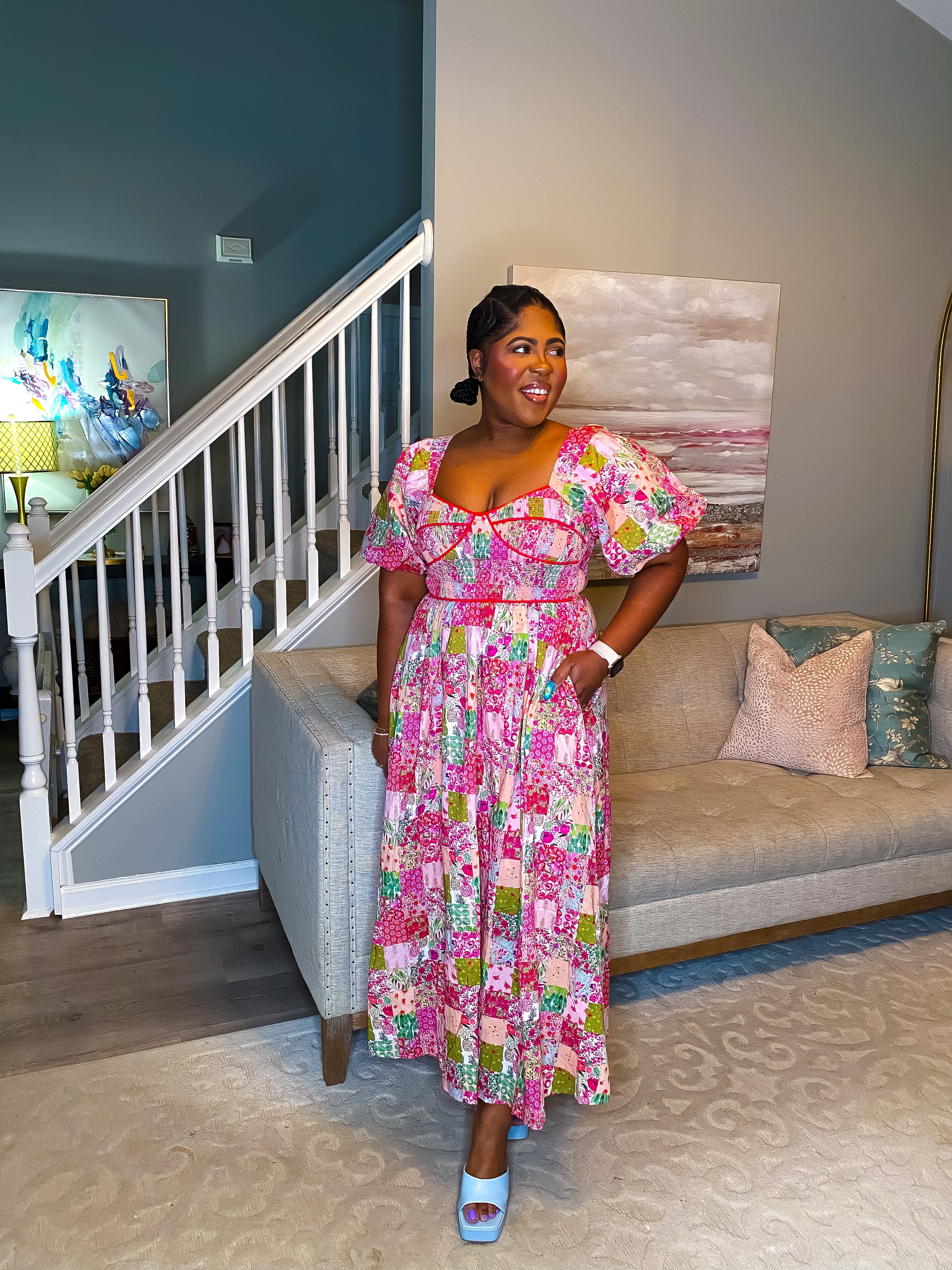 Comfort and Style meet in our Paradise Patchwork Maxi Dress. Stunning red contrast piping detail at bodice. Fully smocked back to provide a comfortable wear. Short puff sleeves with side pockets. Floral patchwork pattern throughout with colors of pink, fuchsia, blue, green, red, and white. Lined. Perfect dress to dress up with heels for dinner or sandals for a fun day shopping. Normal bra friendly.