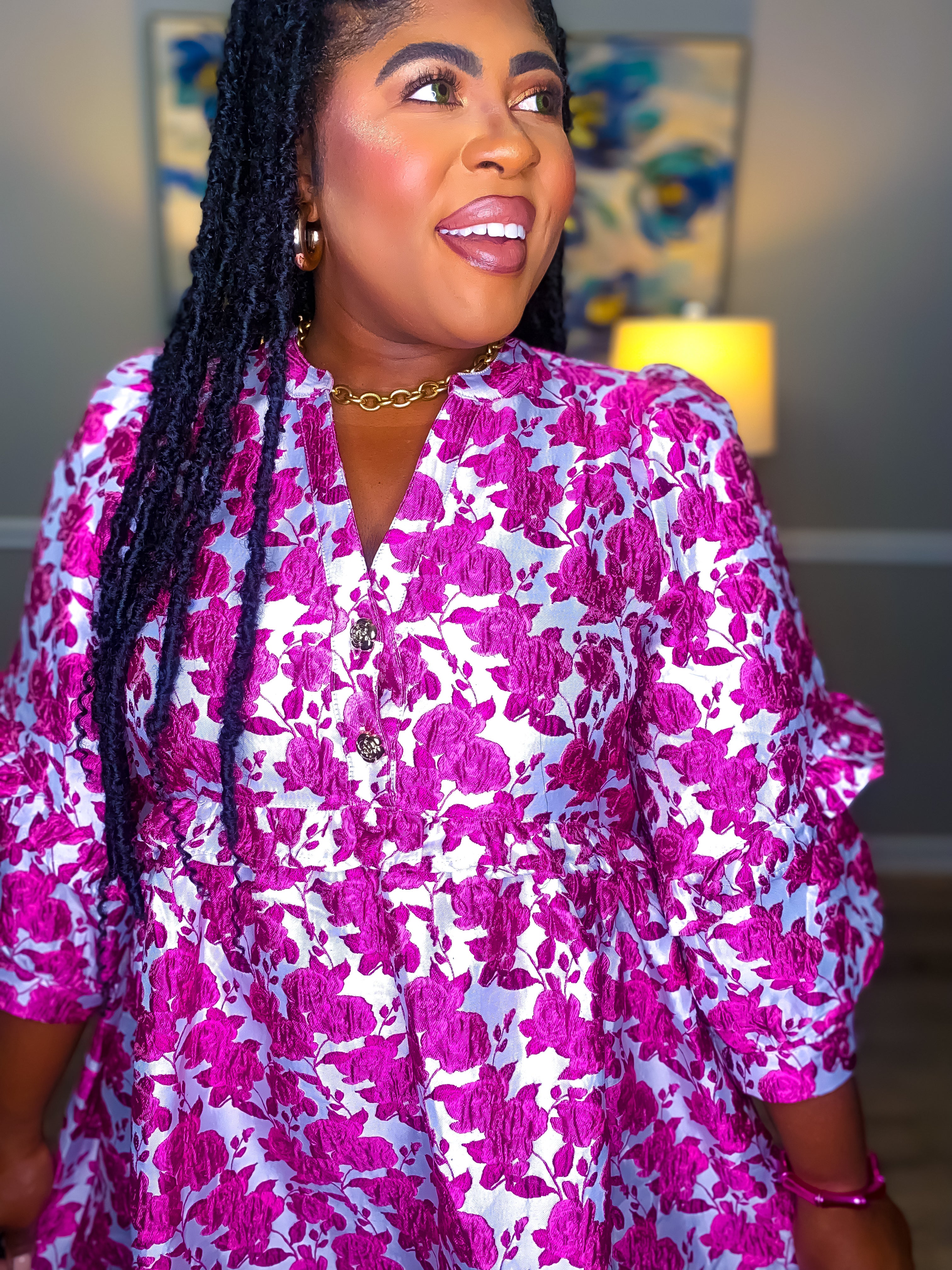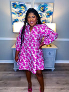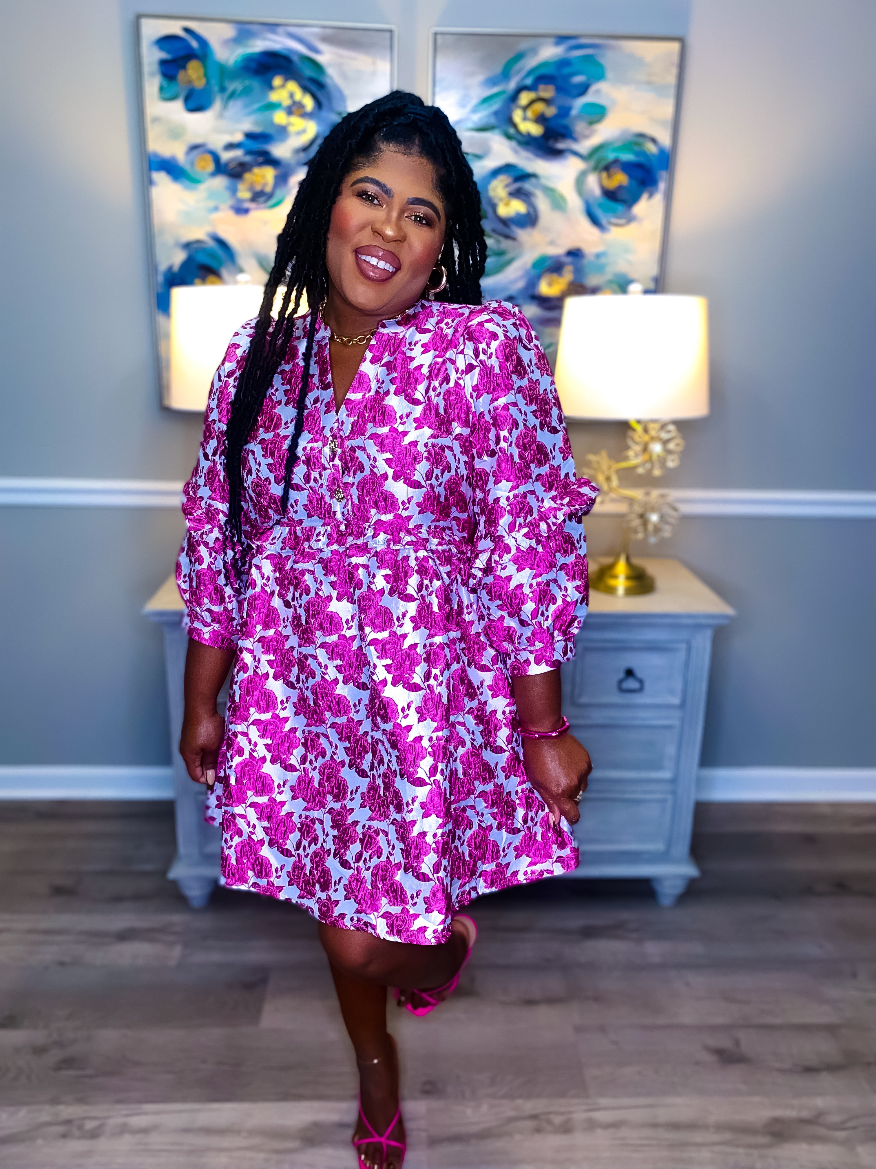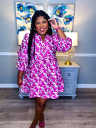 The perfect dress for the girly girl is our Pink Floral Jacquard Dress. Rich and fabulous pink rose pattern on grey jacquard background. 3/4 puff sleeve with ruffle trim. Flattering v neckline with stunning gold rose buttons.