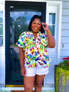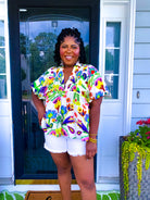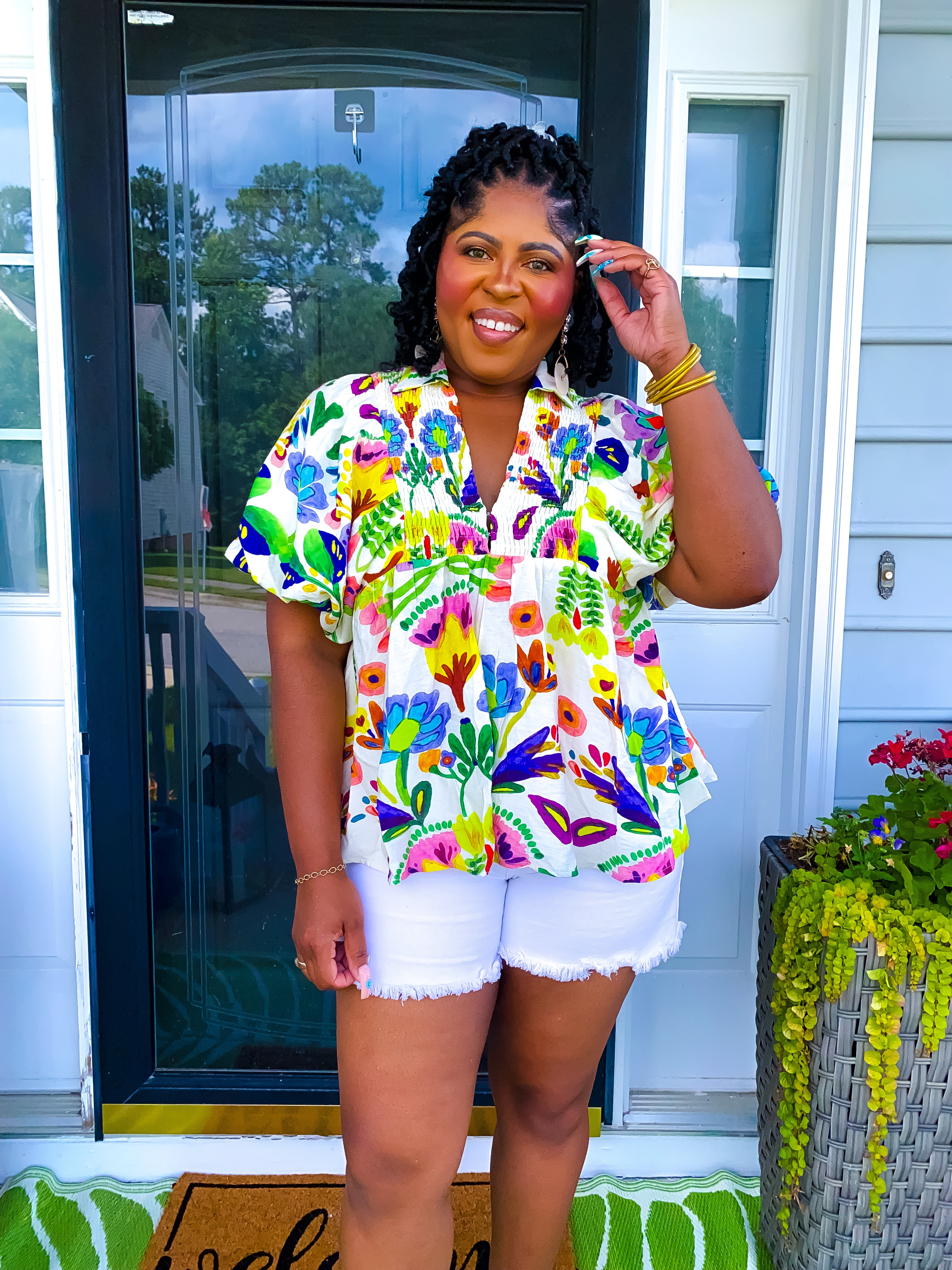 Beautiful lemon floral colorway throughout with mix of blue, green purple, pink, and orange. Collared V neckline with hook and eye closure for extra coverage. Flattering elastic puff sleeve with a line fit.