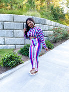 The Front Line Two Piece Set is just that the FRONT LINE! If you're the girl that wants to be seen at your next event, this is the outfit for you. This two piece features an elastic high waisted striped pants bottom and matching dolman long sleeve top. Top sleeves are able to be cinched up and tied to fit any arm length. Perfect fall outfit. Super comfy and flattering. Two piece set runs large.
