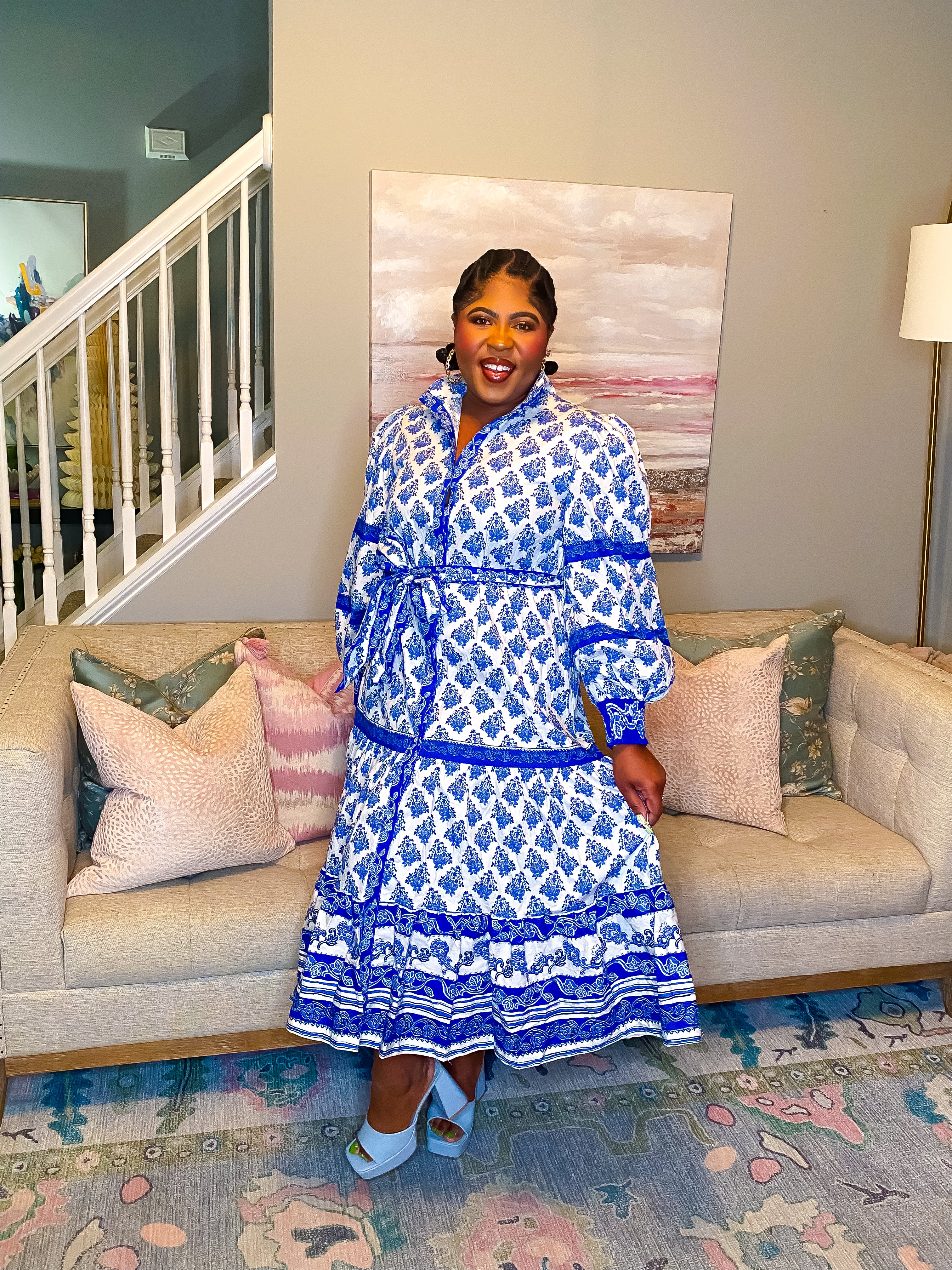 The Azure Belted Midi Dress is the definition of timeless elegance. Classic, blue and white colorway with long puff sleeves. Breathable 100% cotton fabrics with full button down front. Flattering self-tie belt sash with functional side pockets. Intricate blue Mediterranean ceramics pattern. Stand up collar neckline.