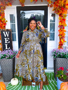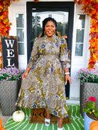 The Cassidy Ruffle Maxi Dress has a gorgeous ruffle neckline with long sleeves. Pretty Olive color way with powder blue and cream pattern. Figure flattering cinched smocked waist. Lined to the knee. Tiered ruffle hemline.